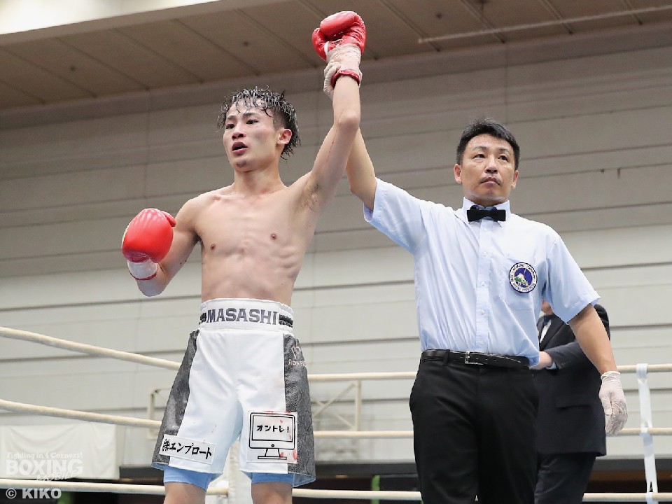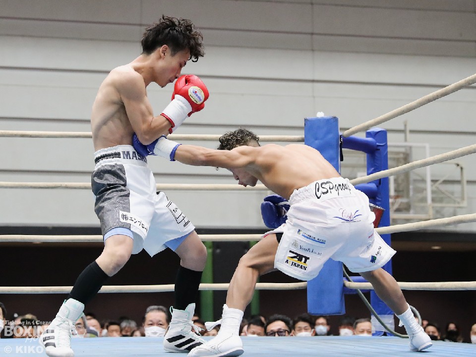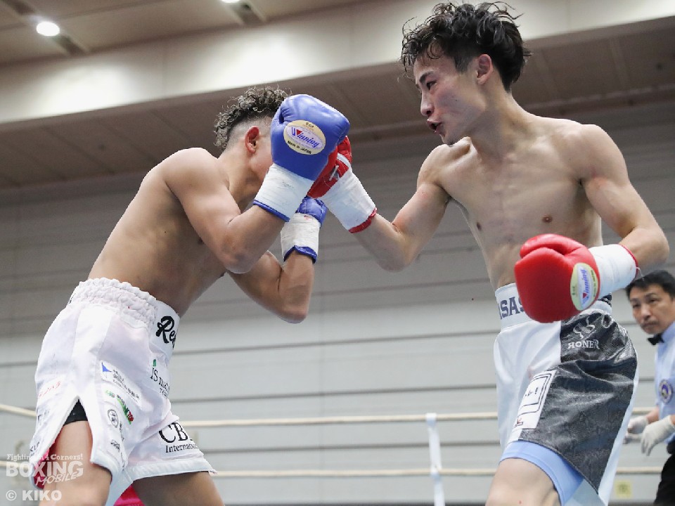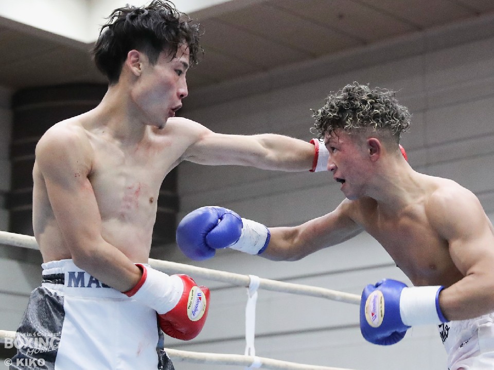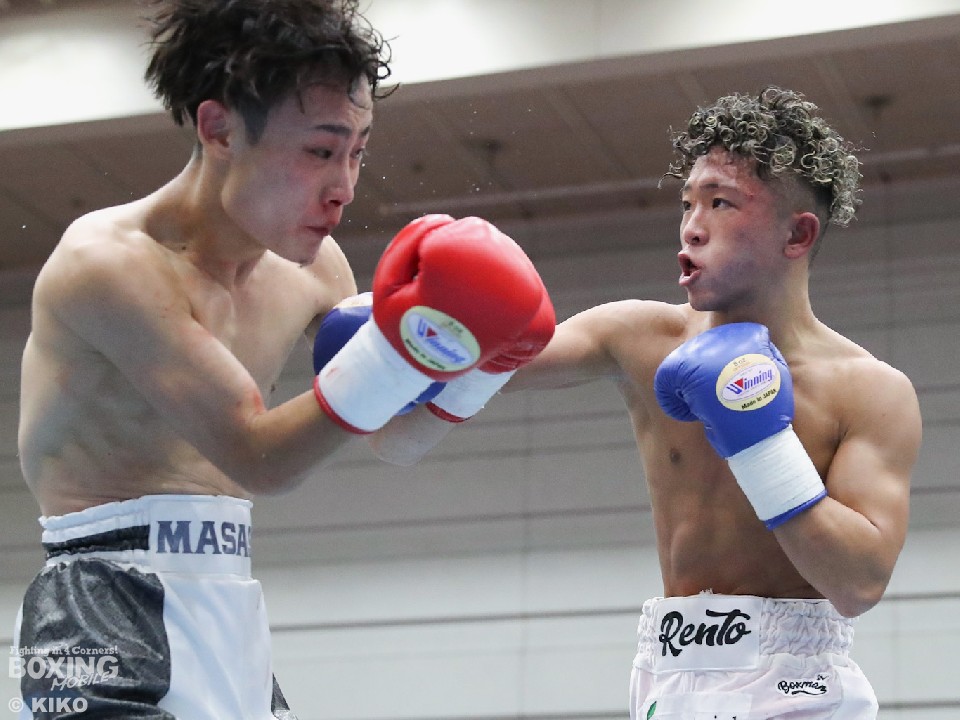 試合:宮澤が前後の動きを意識しながらワンツー、ジャブをヒット。池田はジリジリと距離を詰めて右ボディアッパーで体力を削りに行く。2回、宮澤はボディワークで被弾を回避するとジャブから右ストレートにつなげて見栄えの良さをアピール。ラウンド終盤には右フックでガクッと腰を沈めさせて連打を浴びせた。流れを変えたい池田は3回、プレスをかけて左ボディを叩き反撃。続く回もしつこく前進して細かいパンチを繰り出し挽回した。最終5回、激しいパンチの応酬。真っ向から意地がぶつかり合った。ジャッジに委ねられた採点は2者が池田を支持。序盤の劣勢を跳ね返した池田が勝利を掴んだ。