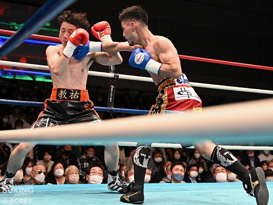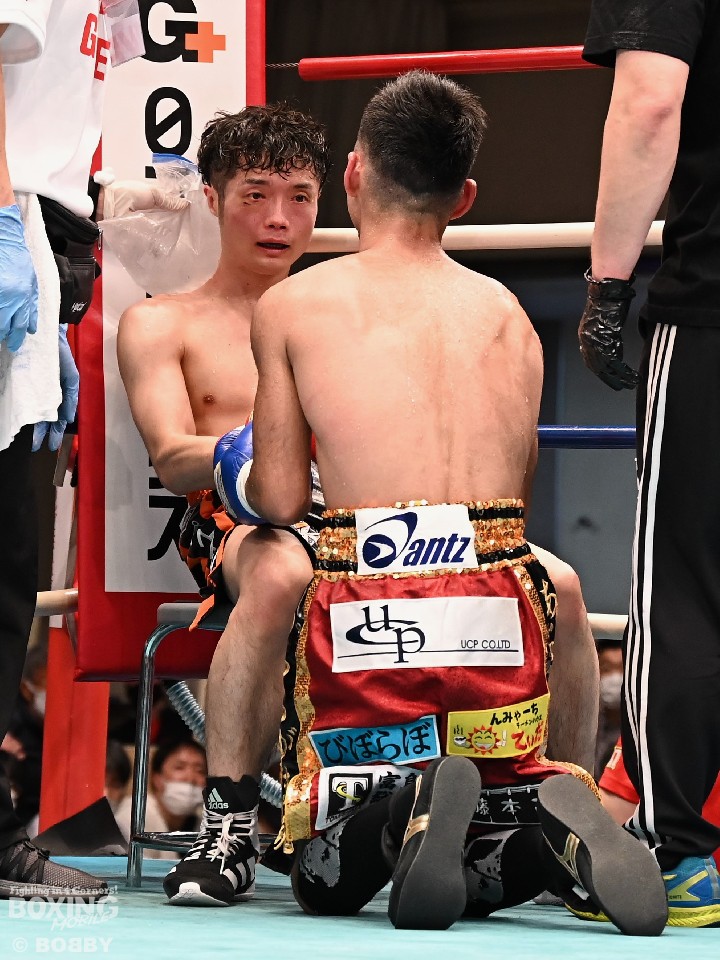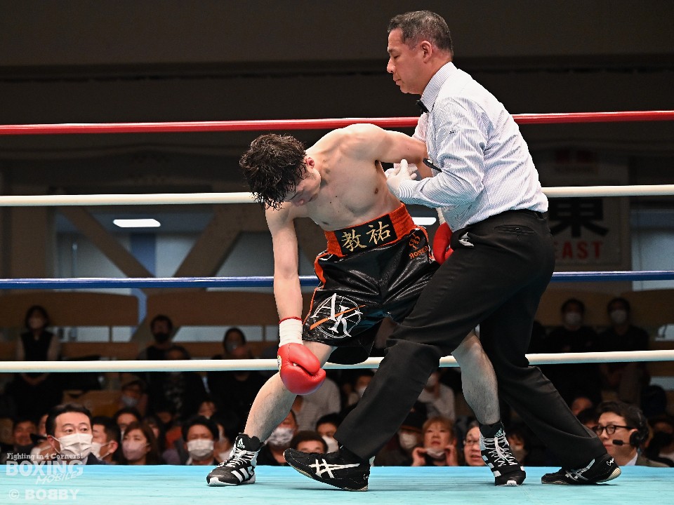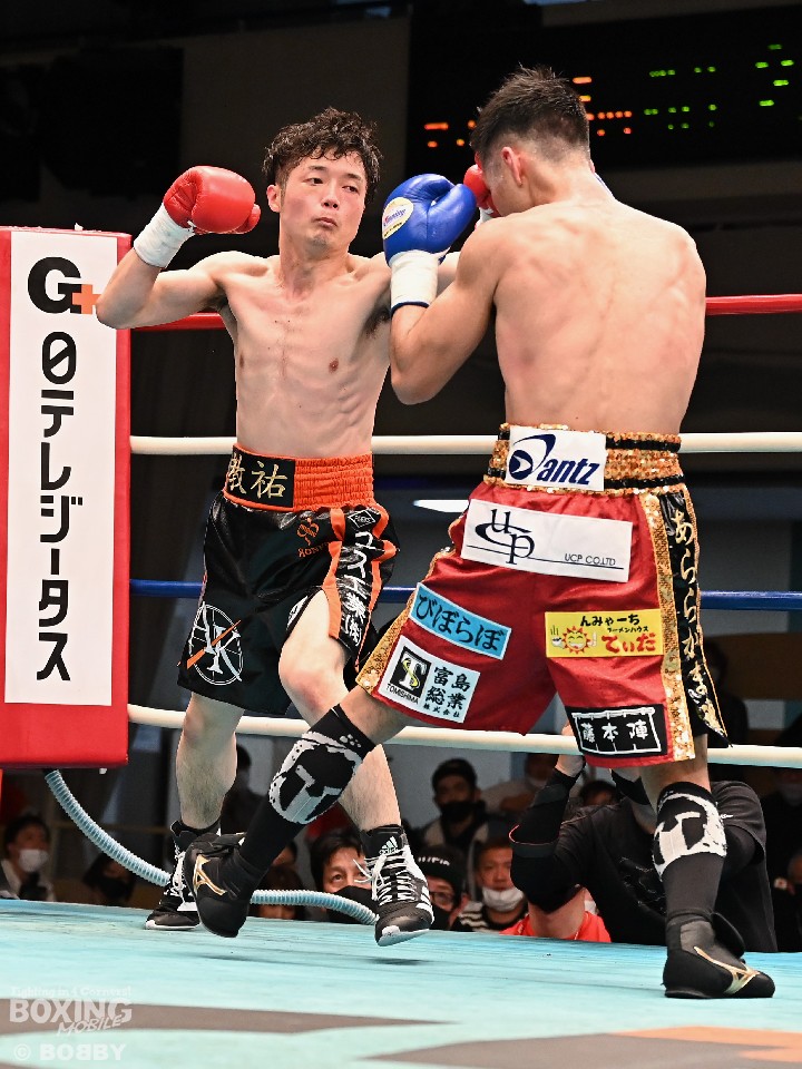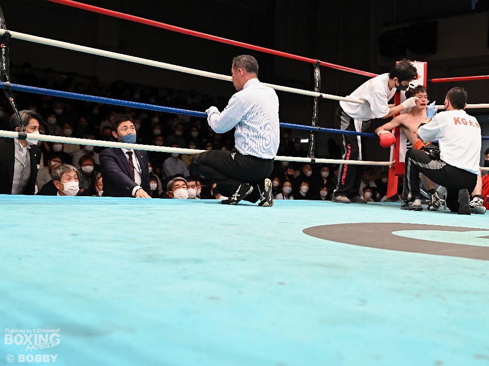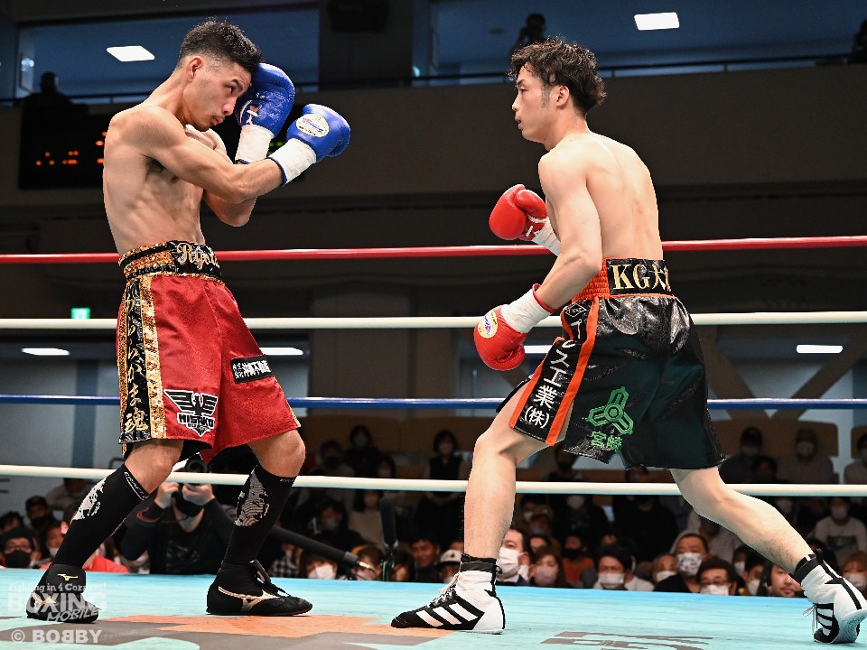 試合:ガードを固めながらジリジリと距離を詰める狩俣に対し、安藤はサークリングしながらジャブを飛ばした。狩俣はいつもより慎重な印象。2回、安藤の多彩な左が機能。それまで大人しかった狩俣だが3回、右オーバーハンドを皮切りにグイグイと攻め立てると、左フックを振り抜きダウンを演出。4回も狩俣はプレスをかけて左ボディからワイルドな攻撃で攻勢。しかし、ラウンド終了間際に安藤は右カウンターで膝を揺らし反撃。勝負はまだわからない。5回、狩俣は右ボディから右フックを叩きつけるが、安藤もカウンターを狙った。5回終了のゴングが鳴ったが、狩俣は勢いが止められず左フックを打ち抜いてしまい安藤は倒れてしまう。安藤のダメージが深く試合続行不能。狩俣の反則負けが告げられた。