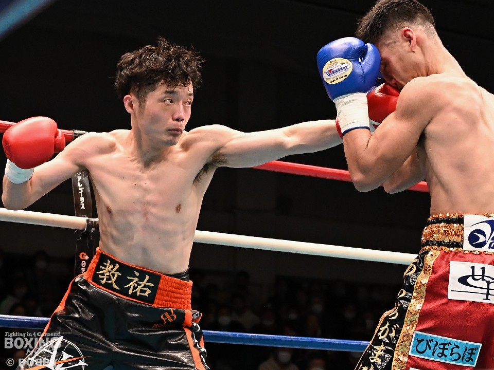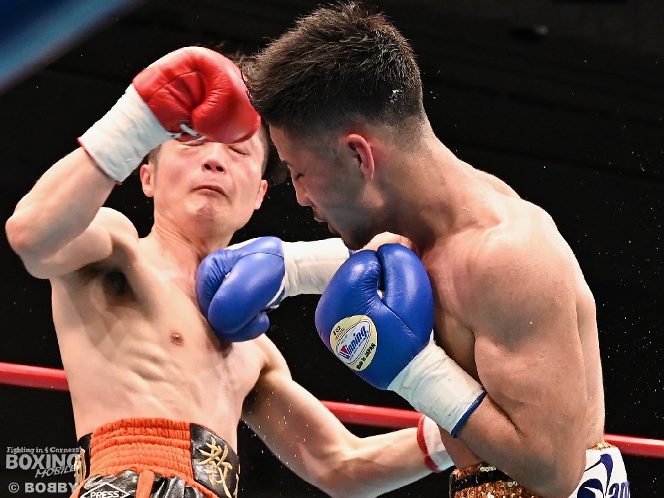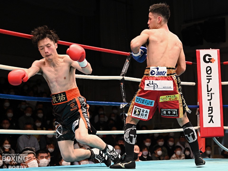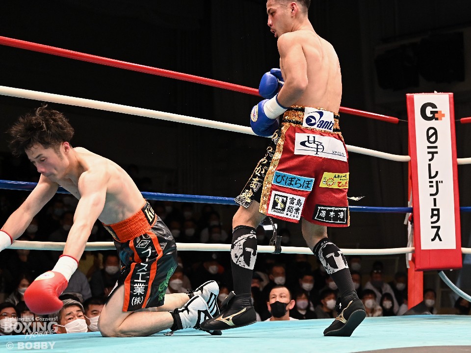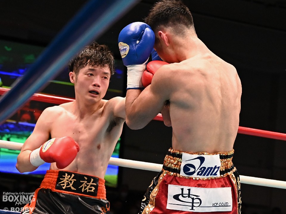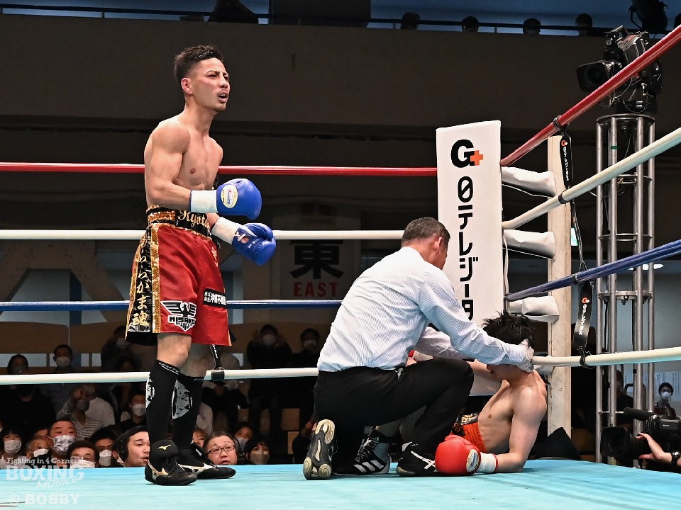試合:ガードを固めながらジリジリと距離を詰める狩俣に対し、安藤はサークリングしながらジャブを飛ばした。狩俣はいつもより慎重な印象。2回、安藤の多彩な左が機能。それまで大人しかった狩俣だが3回、右オーバーハンドを皮切りにグイグイと攻め立てると、左フックを振り抜きダウンを演出。4回も狩俣はプレスをかけて左ボディからワイルドな攻撃で攻勢。しかし、ラウンド終了間際に安藤は右カウンターで膝を揺らし反撃。勝負はまだわからない。5回、狩俣は右ボディから右フックを叩きつけるが、安藤もカウンターを狙った。5回終了のゴングが鳴ったが、狩俣は勢いが止められず左フックを打ち抜いてしまい安藤は倒れてしまう。安藤のダメージが深く試合続行不能。狩俣の反則負けが告げられた。