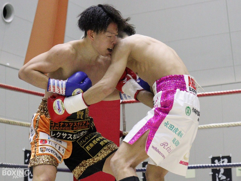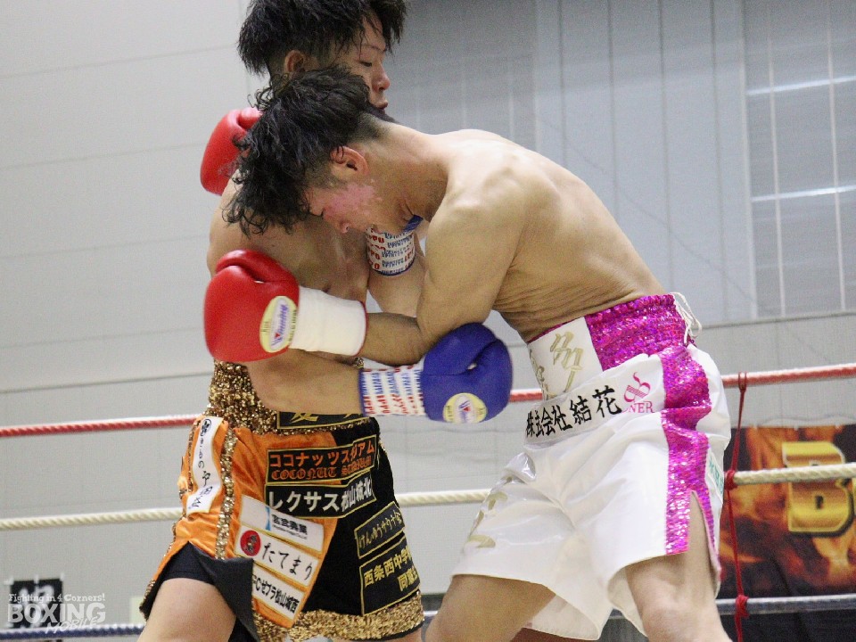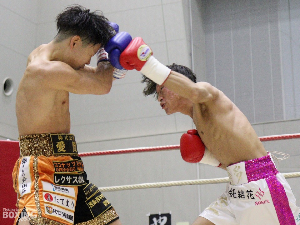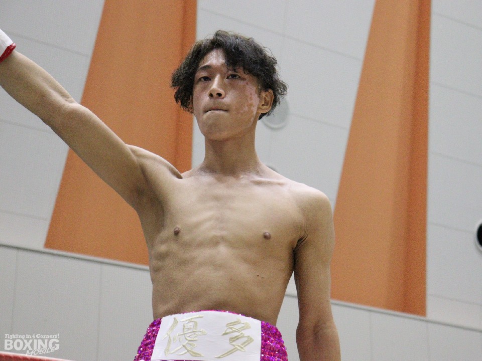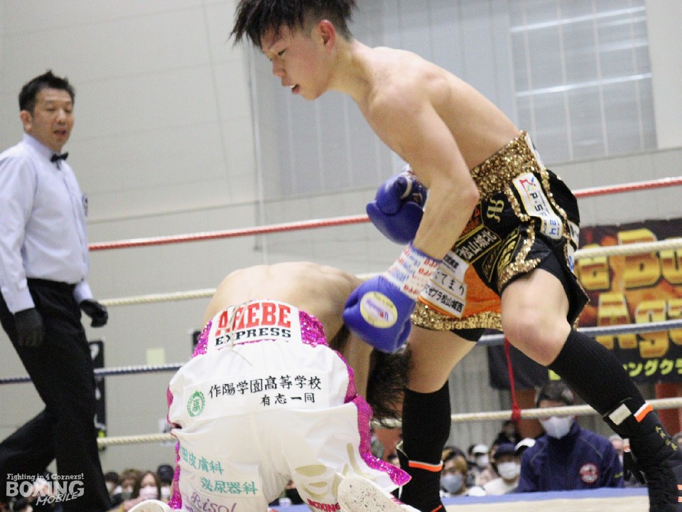 試合:サウスポー土井が距離を測りながら左を狙うのに対し、大川は重心を落としてボディにパンチを集めて対抗。2回、大川は距離を潰してボディへのショートパンチで体力を削りに行く。土井は体を丸める場面が増えてきた。勝負が決まったのは3回。大川は左ボディを突き刺しダウンを演出。土井はしゃがみこんだまま10カウントを聞いた。大川が4戦目でうれしい初勝利を挙げた。