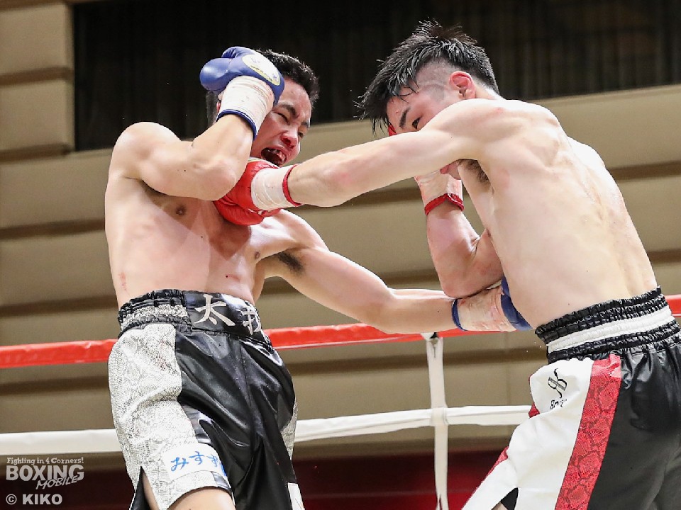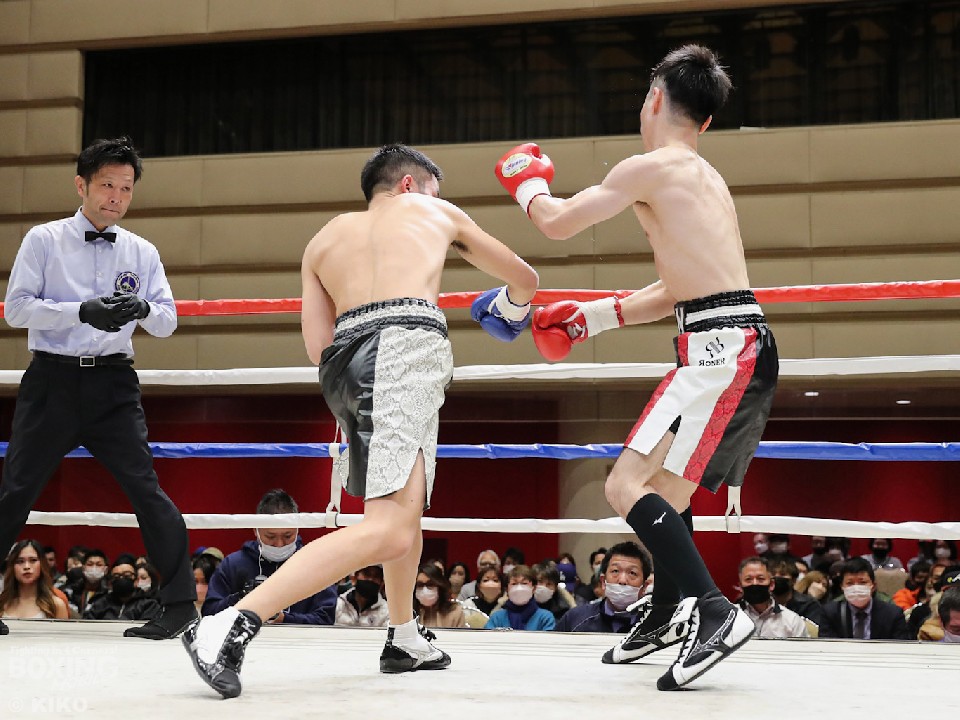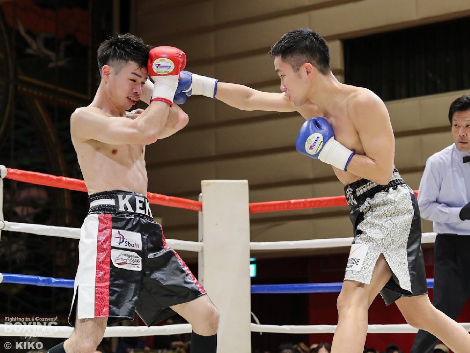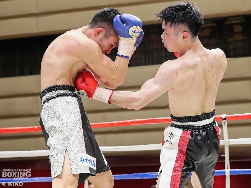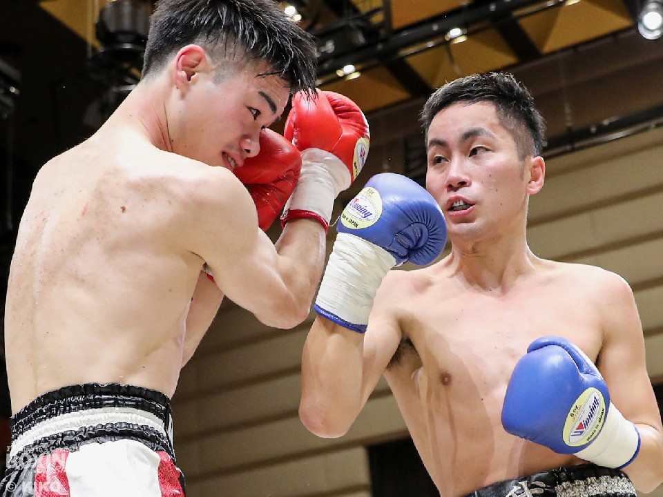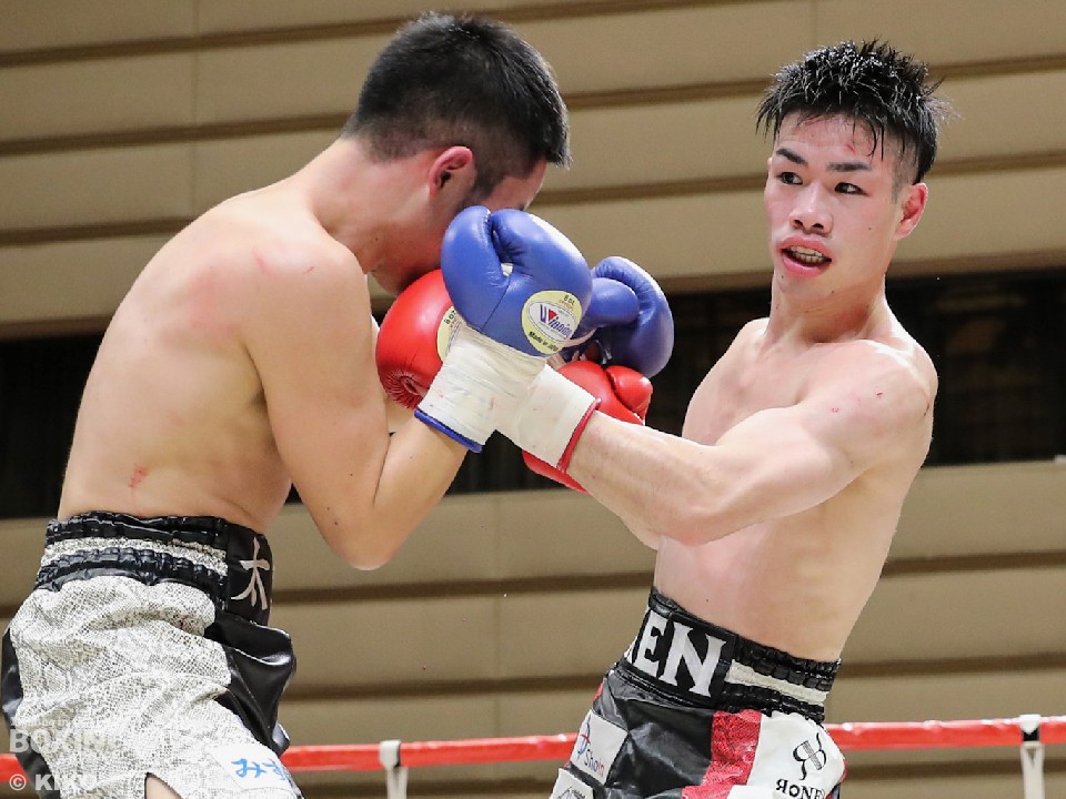 試合:距離を詰め左右のアッパーを強振する長尾に対しガードを上げ中間距離でパンチを返す渡辺。長尾の放った右の強打がクリーンヒット、先制のダウンを奪う。2回、3回と左右の強打を振りプレスをかけ続ける長尾と打ち終わりを狙いパンチを返す渡辺。最終4回、距離を詰め上下に攻める長尾と中間距離からワンツーを軸にパンチを返し続ける両者の試合は判定へ。初回にダウンを奪い、終始攻め続けた長尾が勝利。