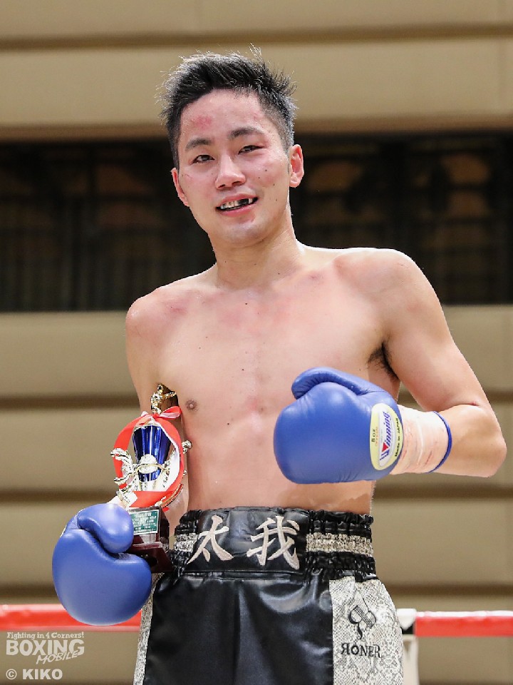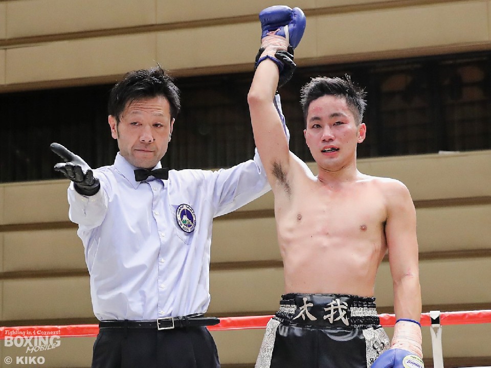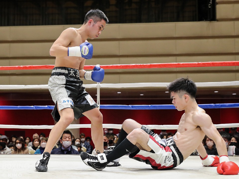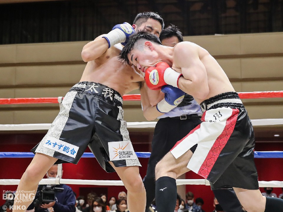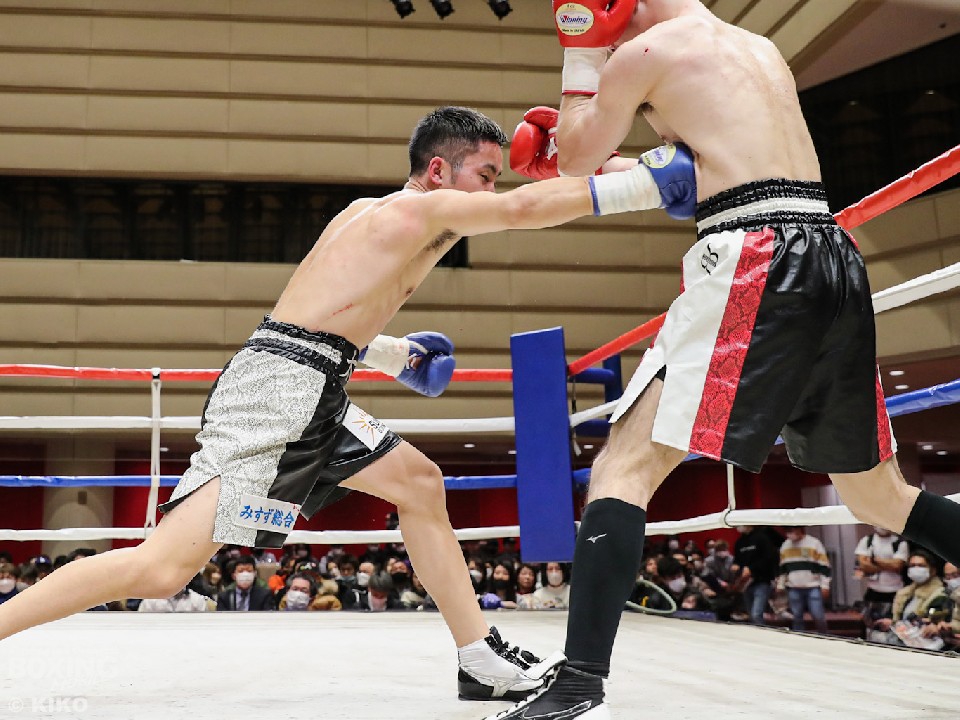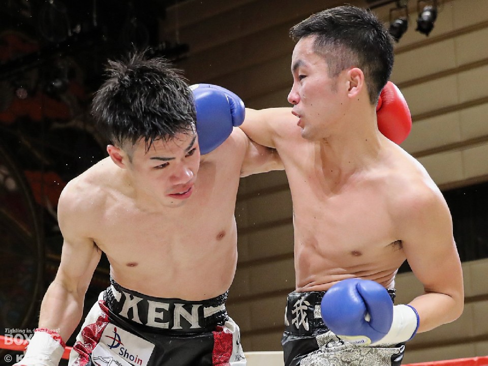 試合:距離を詰め左右のアッパーを強振する長尾に対しガードを上げ中間距離でパンチを返す渡辺。長尾の放った右の強打がクリーンヒット、先制のダウンを奪う。2回、3回と左右の強打を振りプレスをかけ続ける長尾と打ち終わりを狙いパンチを返す渡辺。最終4回、距離を詰め上下に攻める長尾と中間距離からワンツーを軸にパンチを返し続ける両者の試合は判定へ。初回にダウンを奪い、終始攻め続けた長尾が勝利。