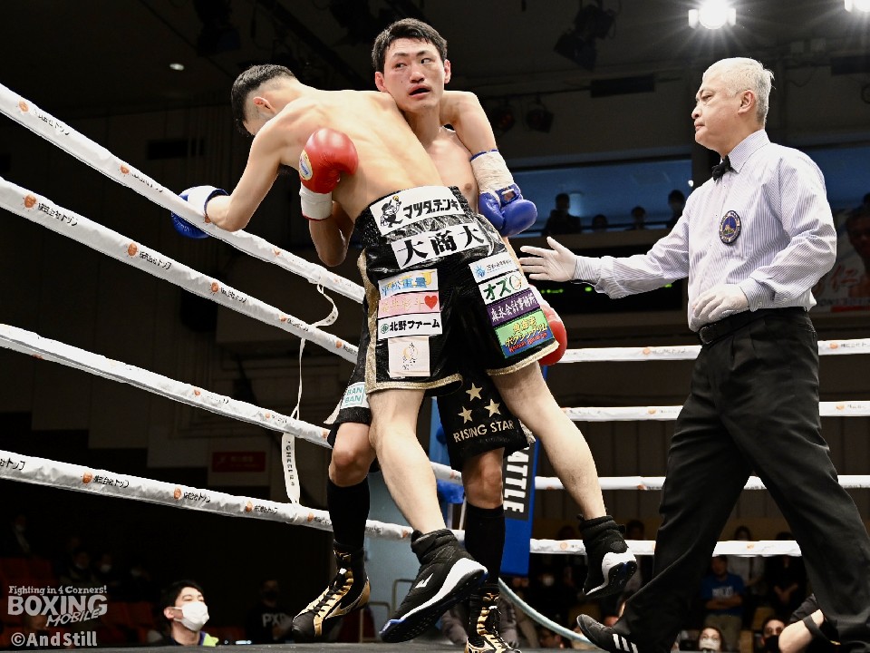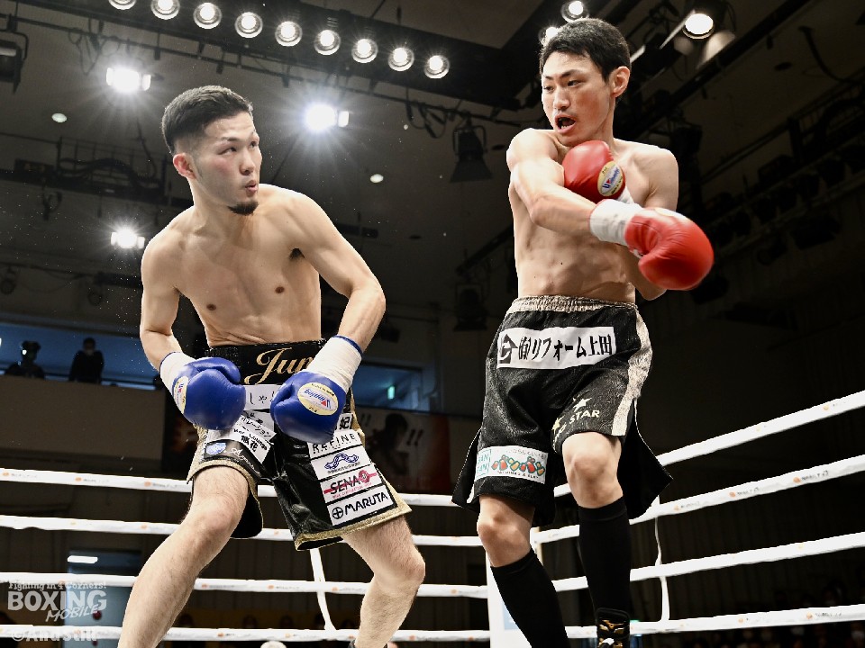 試合:日本フェザー級10位の日野が日本王座戦以来、約1年3ヶ月ぶりにリングに上がった。拳を交えるのは上位進出を狙う池側。サウスポー同士の一戦は、日野はサークリングしながらジャブを飛ばすのに対し、池側は左カウンターを狙う。し烈なペース争いを繰り広げる中、池側が左アッパーを好打。その後は、神経戦を繰り広げてジャッジ泣かせの展開が続いた。5回、決定打とまではいかないが池側がワンツージャブをヒット。当たりは浅いものの、このラウンドを取った。6回、偶然のバッティングで日野は左目上を負傷。傷が深くこれ以上の試合続行不能の判断が下され勝負は負傷判定へ。ジャッジ3者の支持を得た池側が勝利した。