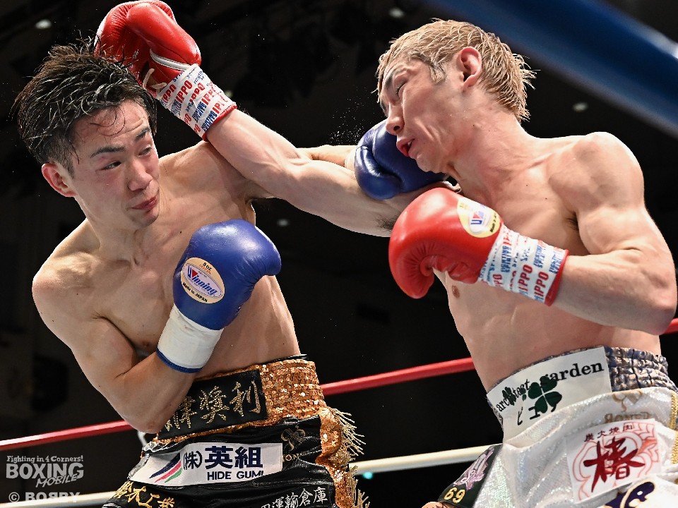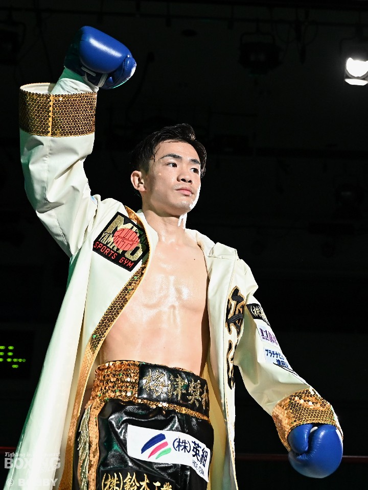 試合:梅津が頭を振りながら右ボディストレートを繰り出すのに対し、サウスポー東はリングを大きく使いながら単発の左で対抗。2回、梅津は打ち終わりに右ストレートで膝を揺らすと、ラウンド終盤にロープに詰めて連打で攻勢。東も懸命に打ち返すが梅津のパワーが上回った。3回、東は機動力を生かしたボクシングで的を絞らせず。左ストレートで顔を弾いた。なかなか捕まえることができない梅津だが、慌てることなくプレスをかけてジワリジワリと体力を奪いにいった。5回、梅津はワンツーからチャンスと見るや、一気にラッシュ。手が出なくなった東を見てレフェリーが割って入った。