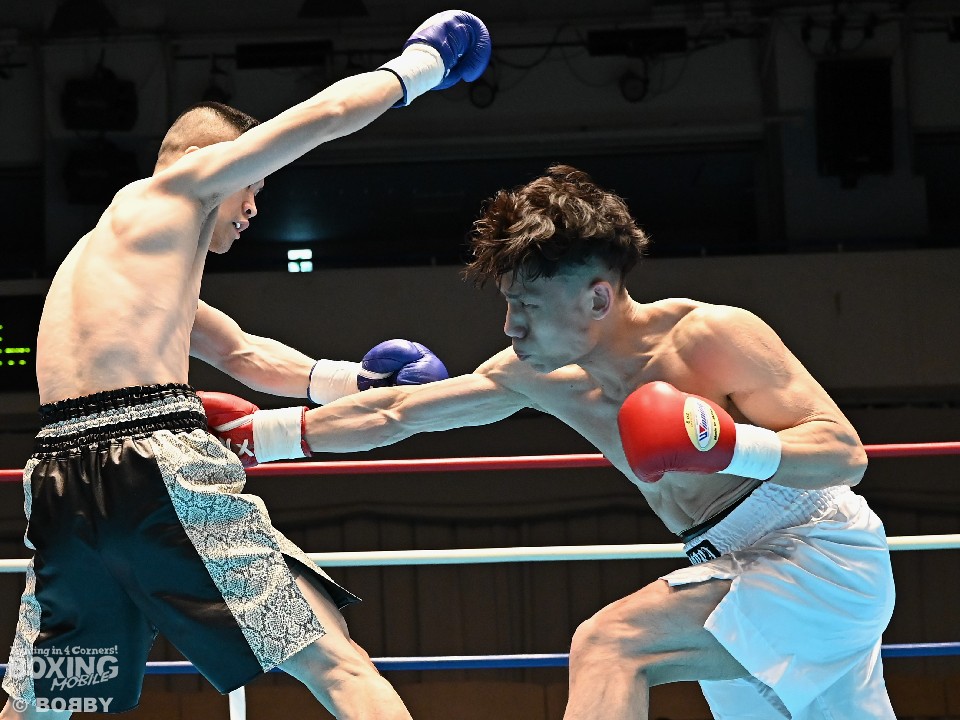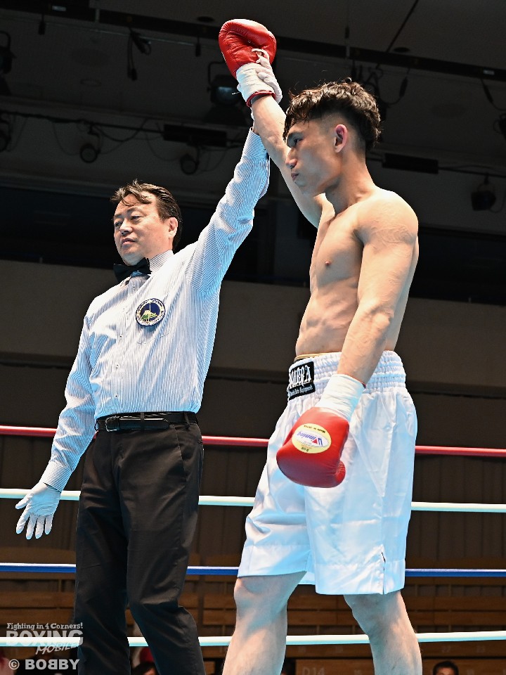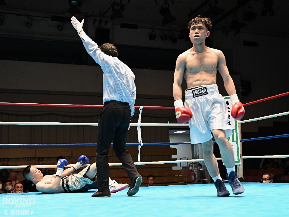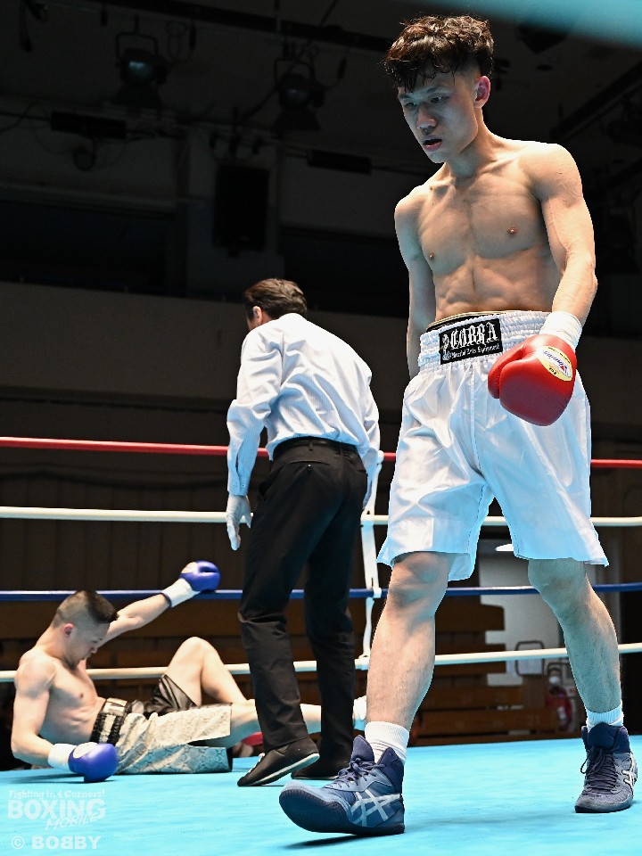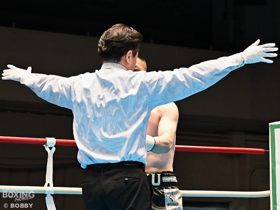 試合:サウスポー犹守が広くスタンスを取りながら左ボディアッパー、ジャブをヒットし先手を奪う。右ストレートにつなげたいリューだが、距離が遠く思い通りの展開を作れず。2回も犹守がワンツーで突き放してリズムを作るが、ここでリューの右ストレートが直撃!痛烈なダウンを奪った。なんとか立ち上がった犹守だが、レフェリーはカウント途中でストップした。リューがワンパンチKO勝ちでデビュー戦を飾った。