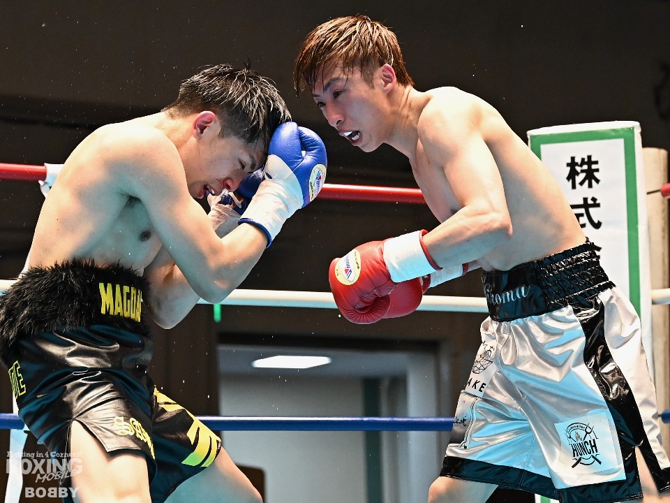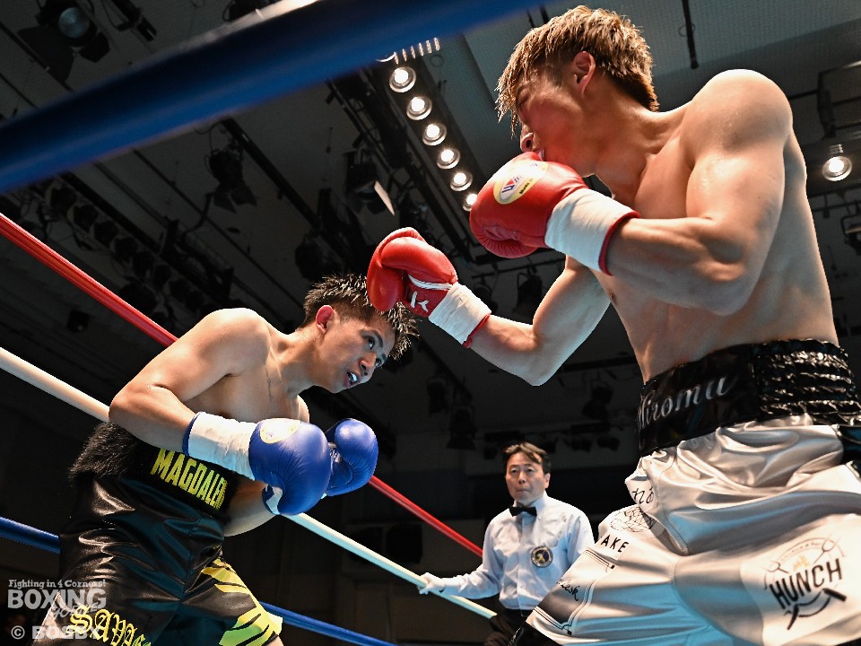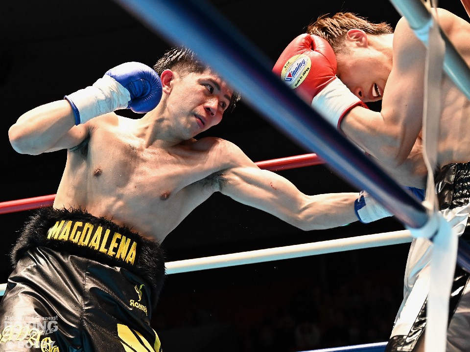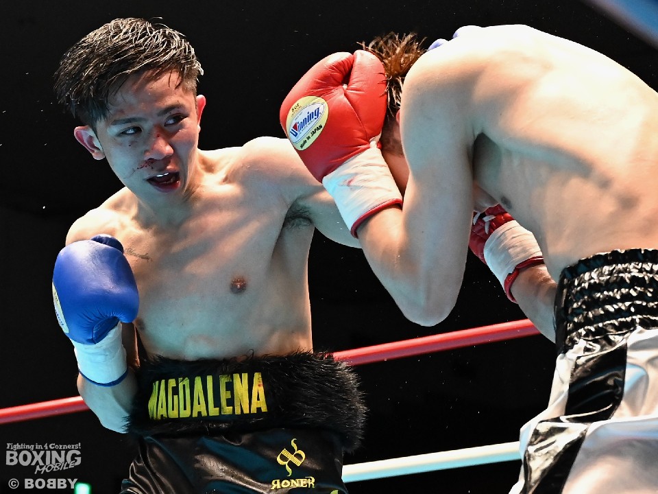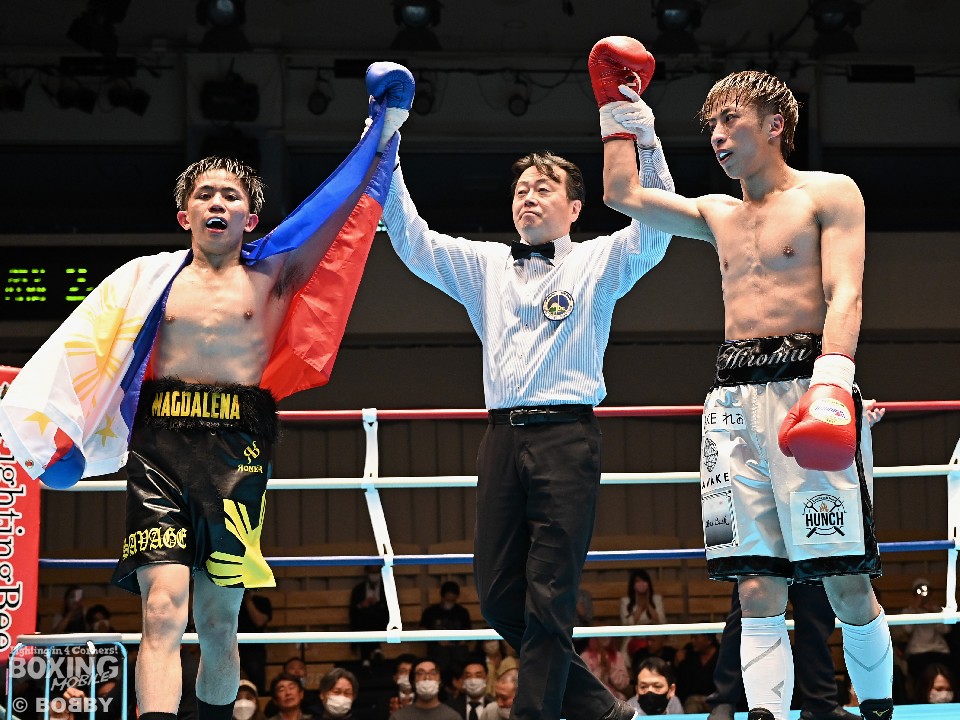 試合:サウスポー荒木がキレのある右フックから左ストレートを叩きつけるが、フィリピン出身のマグダレナはガッチリとガードを固めるとコンパクトな左ボディで応戦。2回、マグダレナはプレスをかけてボディ攻撃で体力を削りに行くが、荒木はカウンターの右フックでグラつかせると右フックを強振。3回、マグダレナはなおも左ボディに狙いを定める。ガードの上だが効果は十分。我慢の時間が続いた荒木だが、ラウンド終盤に右ショートアッパーでガクッと腰を沈めさせた。最終4回、マグダレナは回転力を活かした連打で攻勢。荒木も最後まで意地を見せた。ジャッジ2者が引き分けとしたが、激戦を繰り広げた両者にこの日、一番の歓声が沸き起こった。