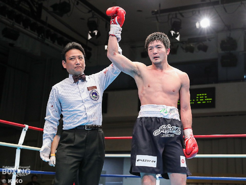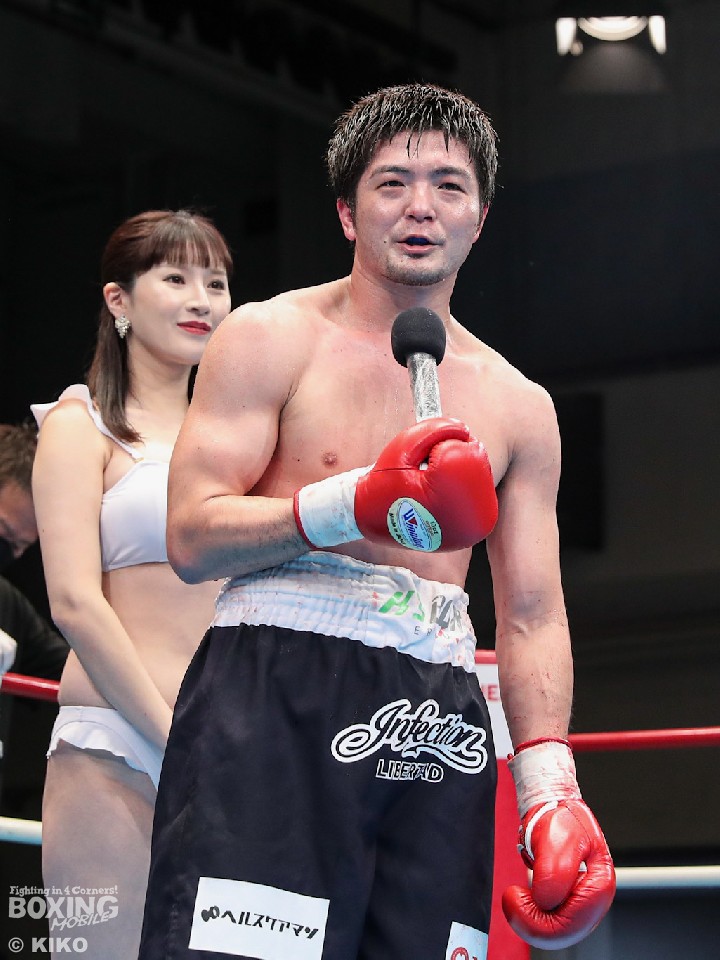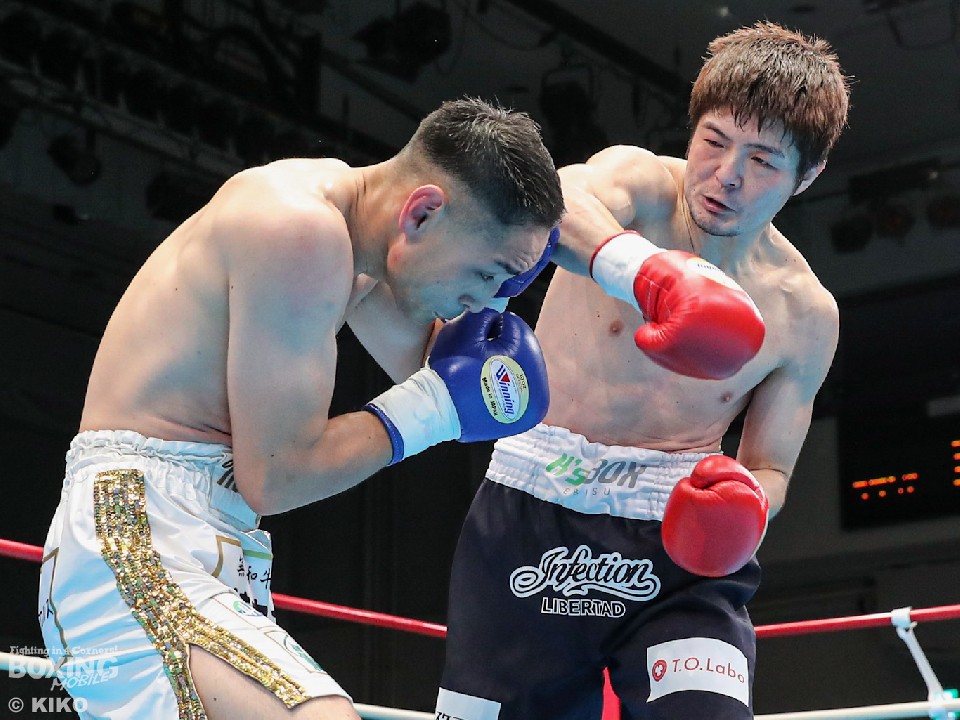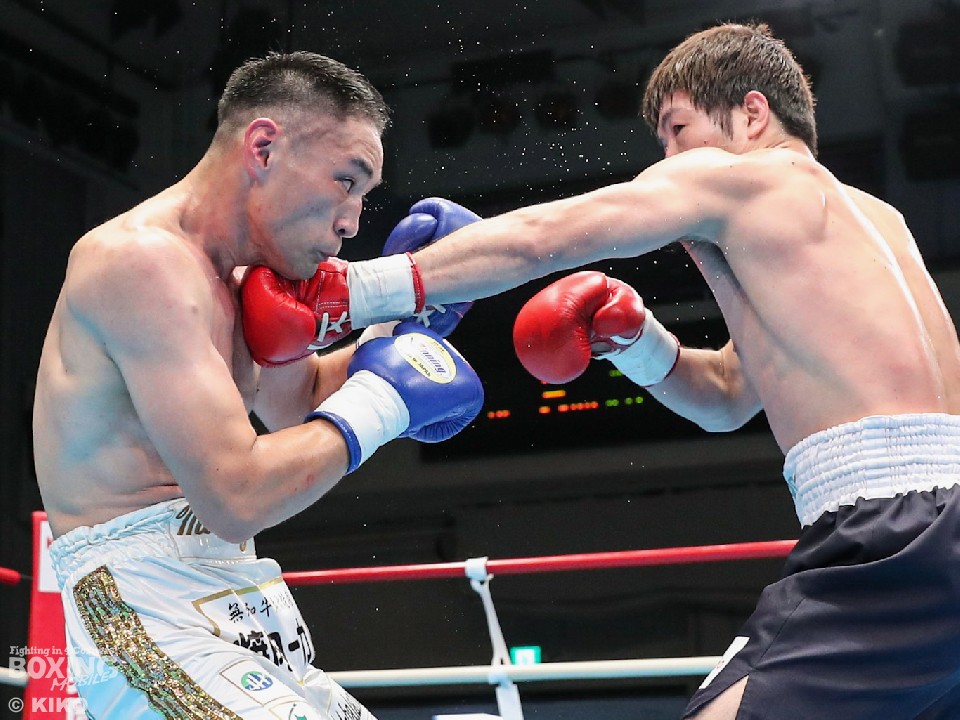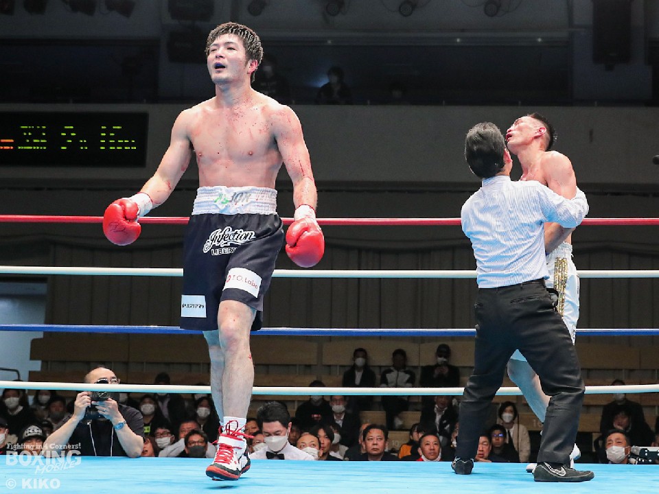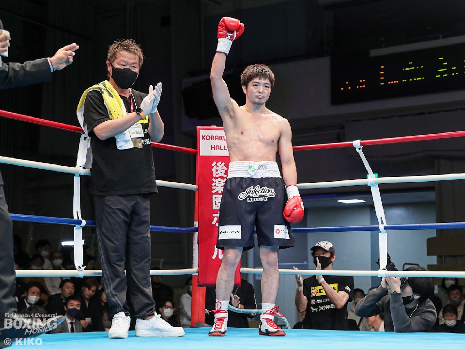 試合:大島が右ボディストレートから切り込めば、左右田も打ち終わりに右ストレートで応戦。2回、左右田は相手のプレスに上手く対応しながら、単発の左フックをヒット。続く回もジャブから左ボディにつなげて試合運びの上手さを見せた。後手に回った大島は4回、ボディ攻撃で反撃を試みるが、左右田は押し負けず右ボディから右ショートアッパーを好打。パンチをまとめて攻勢を印象付けた。逆転を狙う大島は6回、手数を増やして攻め立てるが、左右田は冷静に対応。ワンツーから連打でレフェリーストップに持ち込んだ。
