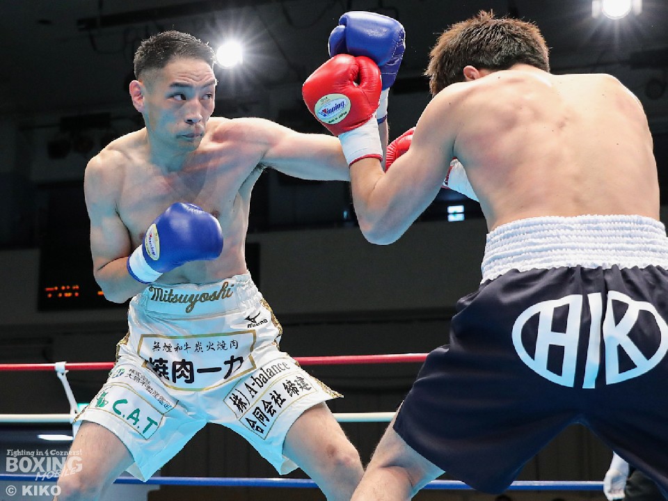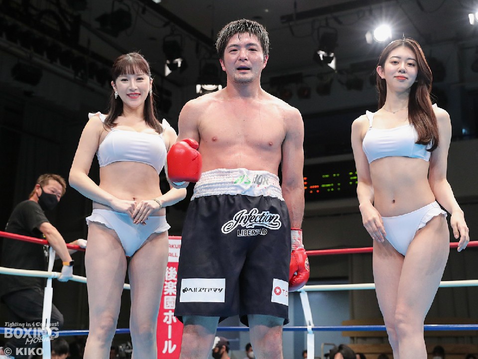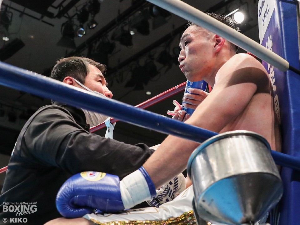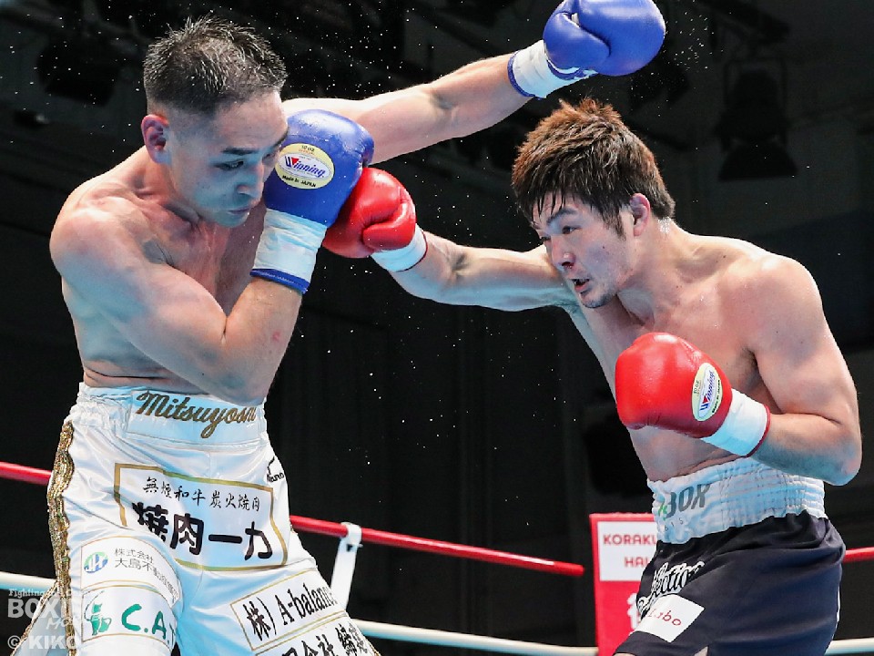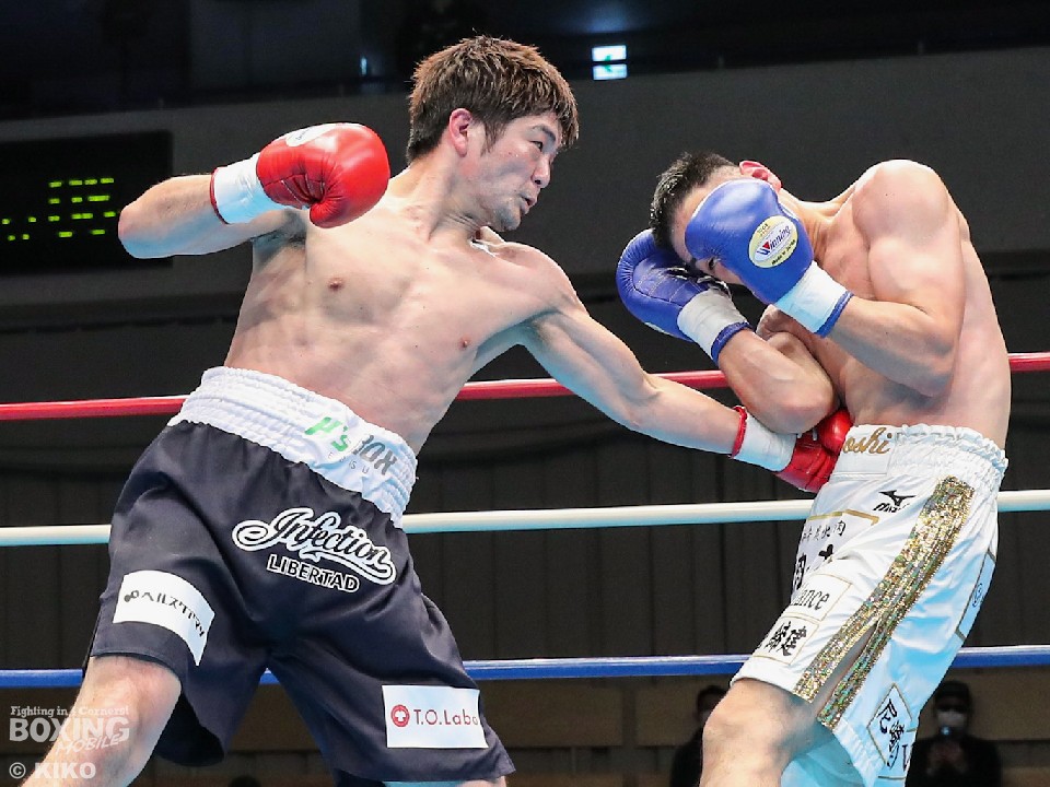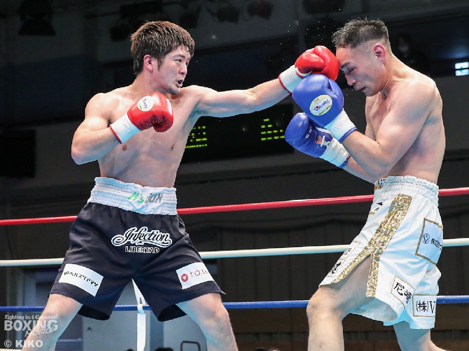 試合:大島が右ボディストレートから切り込めば、左右田も打ち終わりに右ストレートで応戦。2回、左右田は相手のプレスに上手く対応しながら、単発の左フックをヒット。続く回もジャブから左ボディにつなげて試合運びの上手さを見せた。後手に回った大島は4回、ボディ攻撃で反撃を試みるが、左右田は押し負けず右ボディから右ショートアッパーを好打。パンチをまとめて攻勢を印象付けた。逆転を狙う大島は6回、手数を増やして攻め立てるが、左右田は冷静に対応。ワンツーから連打でレフェリーストップに持ち込んだ。