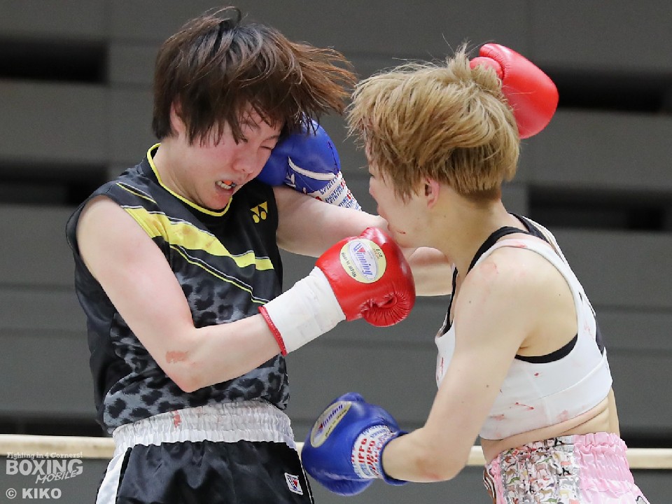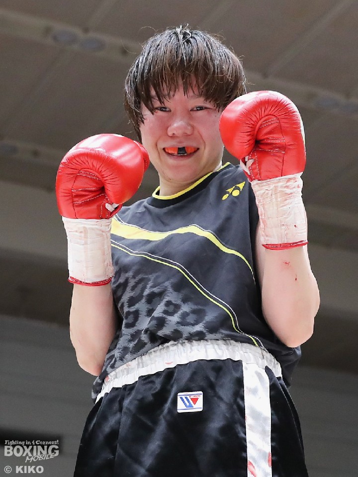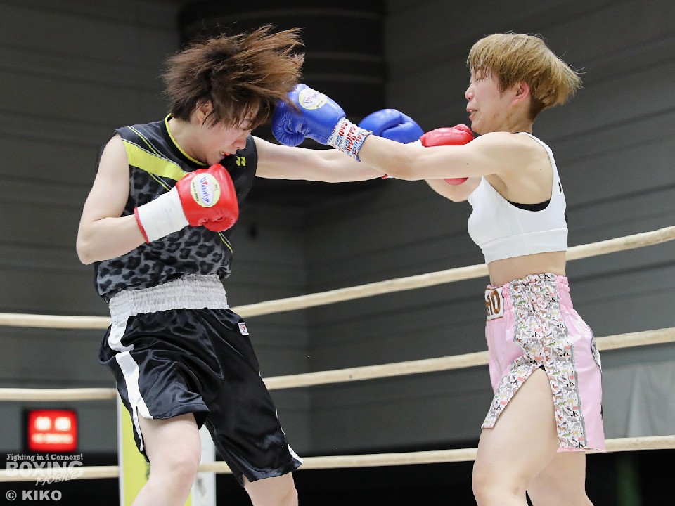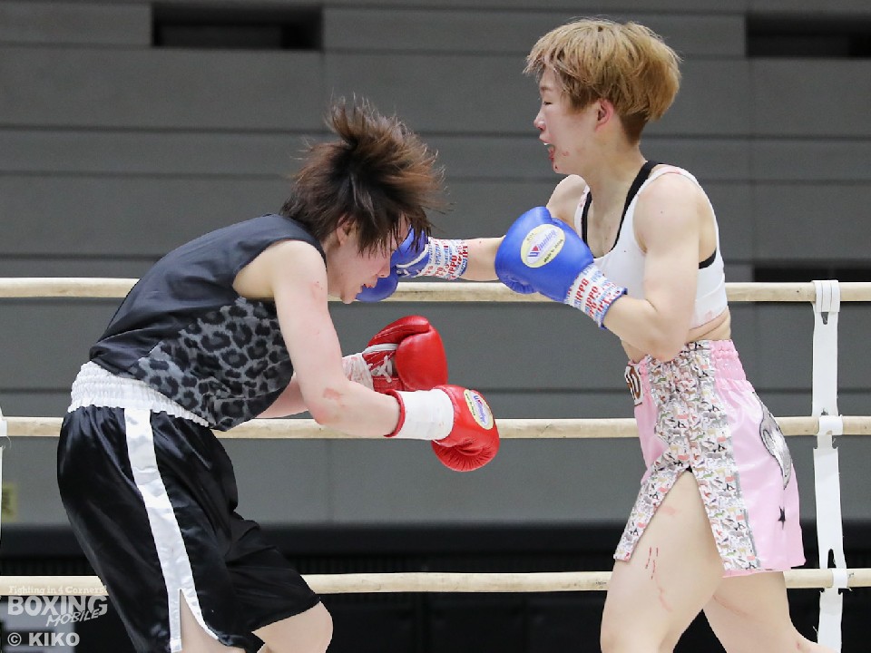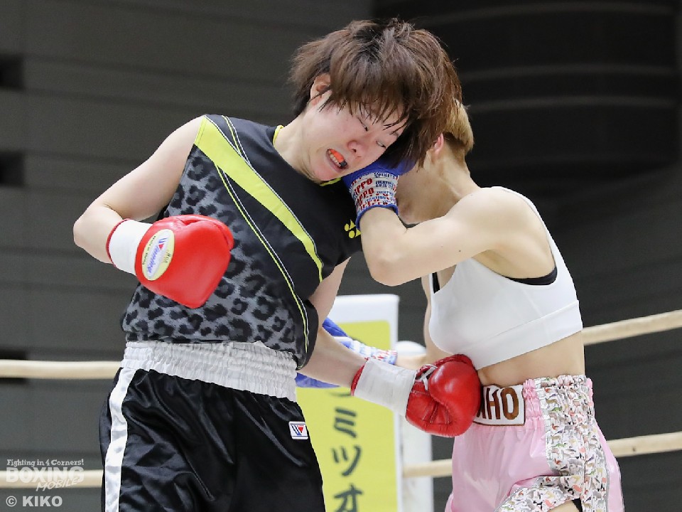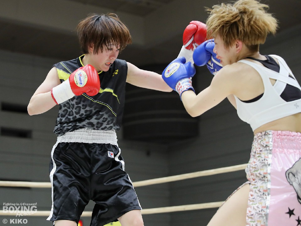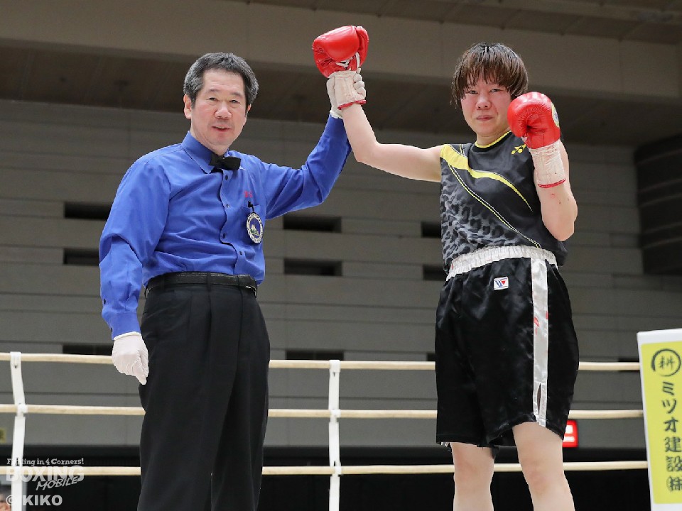 試合:長崎は開始早々、グイグイと前に出てワンツーから連打で攻勢をかける。右ストレートを差し込み上々の立ち上がりを見せた。宗利はジャブをついて立て直しを図るが、長崎のプレスに後手に回ってしまう。2回、宗利は鼻血を流しながら前に出てクロスレンジで左右フックをねじ込むが、長崎はお構いなしにプッシュして右ストレートを再三好打した。3回、両者とも疲労の色が見える中、互いにパンチが顔面を捉えて意地がぶつかり合う打ち合いに。4回、最後まで死力を尽くした打ち合いの中、宗利の右ストレートが再三頬を弾いた。ジャッジ3者とも長崎を支持。嬉しい初勝利を挙げた。