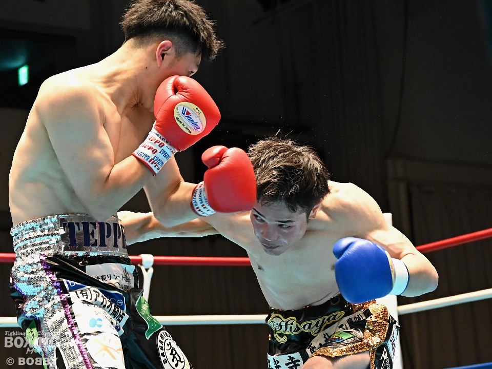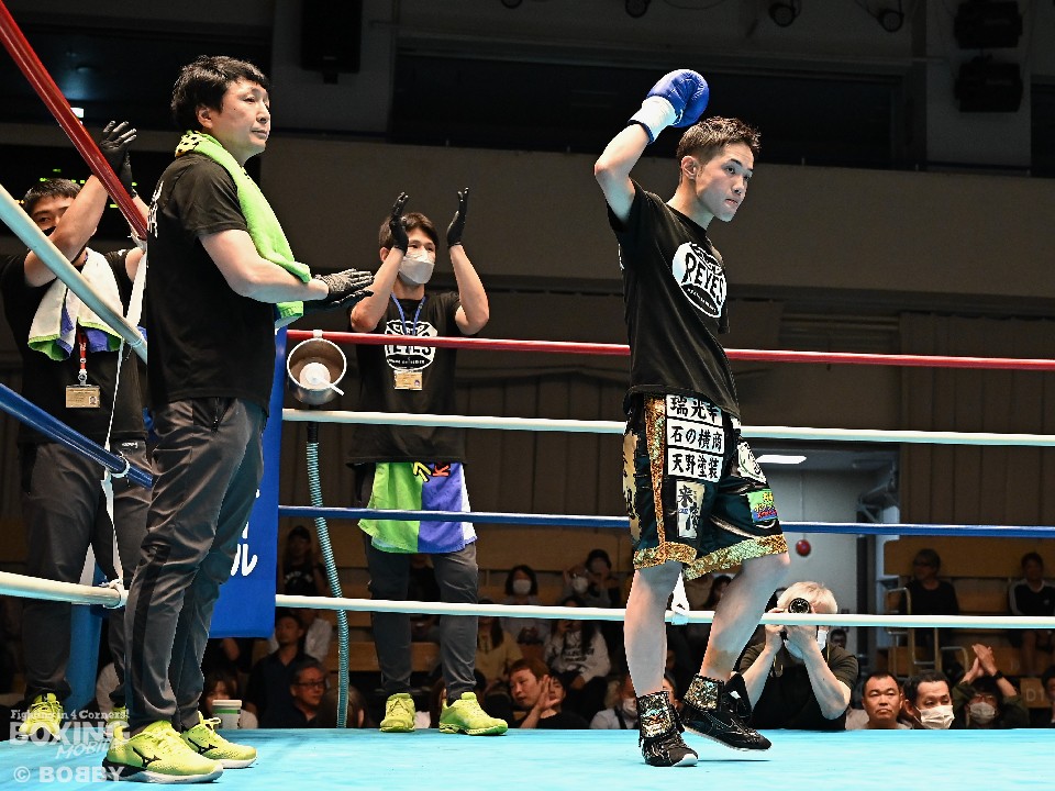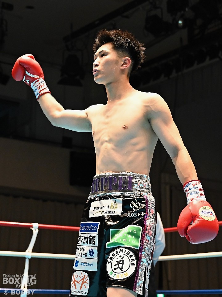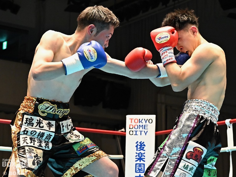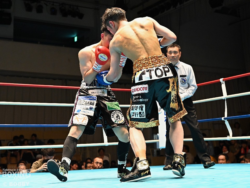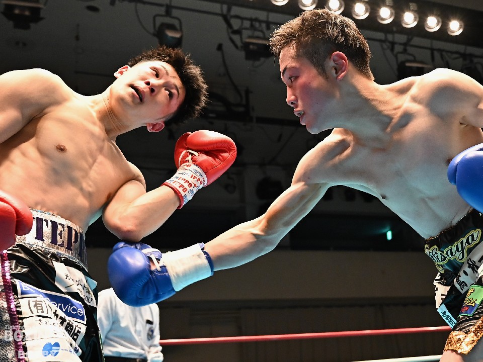 試合:岸部がジャブから右クロスで膝を揺らすと左を軸に組み立てる。後手に回った齋藤だがワンツーを返した。2回、岸部はプレスをかけてボディにパンチを集めると齋藤は失速。グイグイと攻め込んだ。3回、ショートパンチをぶつけ合うが、ここでも打ち勝ったのは岸部。気持ちがこもった打ち合いに会場はヒートアップした。4回、ギアを上げた岸部は右ボディをこれでもかと打ち込みフィニッシュを狙う。しかし、齋藤も勝利への執念を見せた。勝負が決まったのは5回。岸部がラストスパート!細かいパンチを浴びせるとダメージの深さを考慮したレフェリーが抱きかかえた。