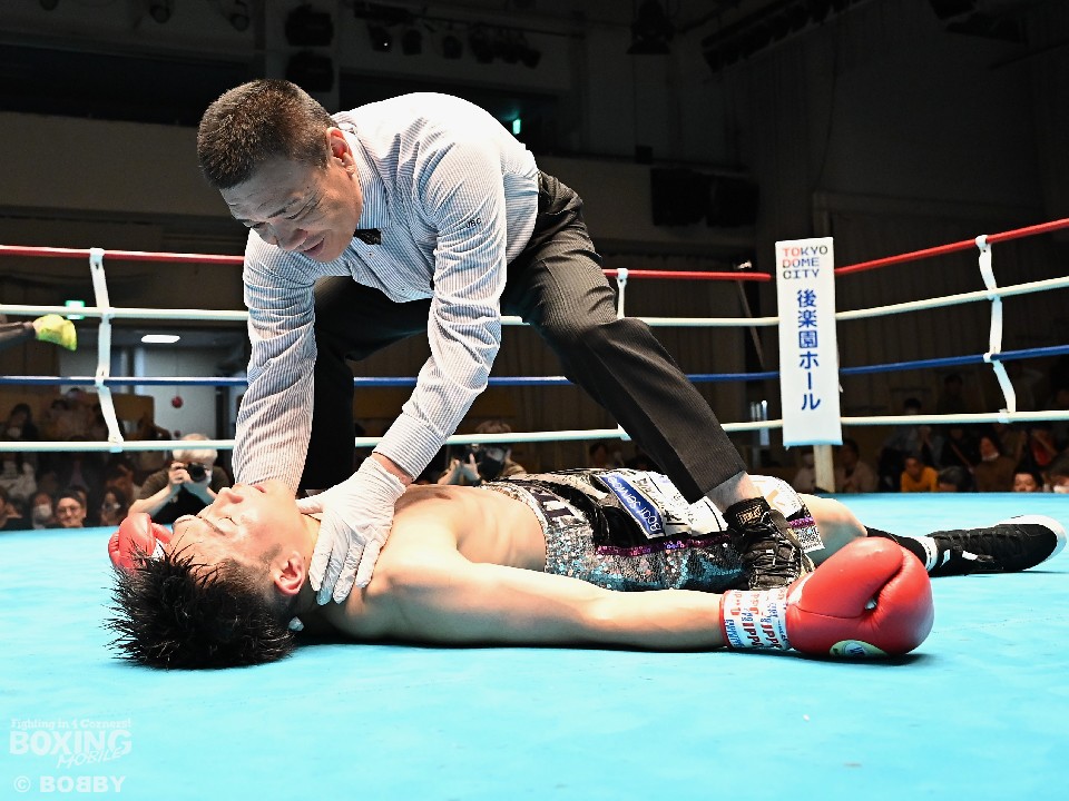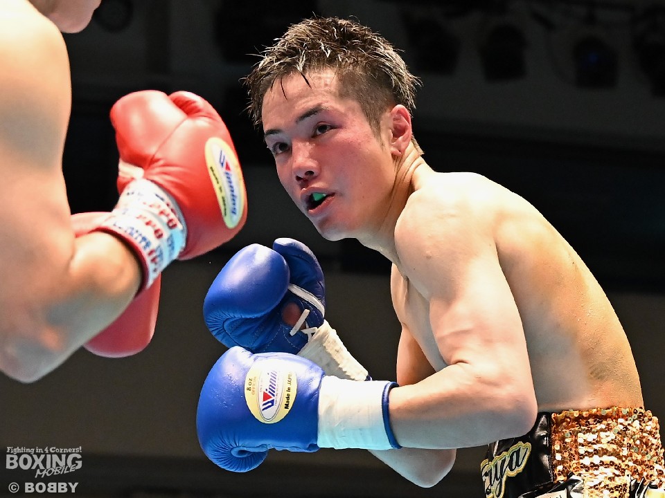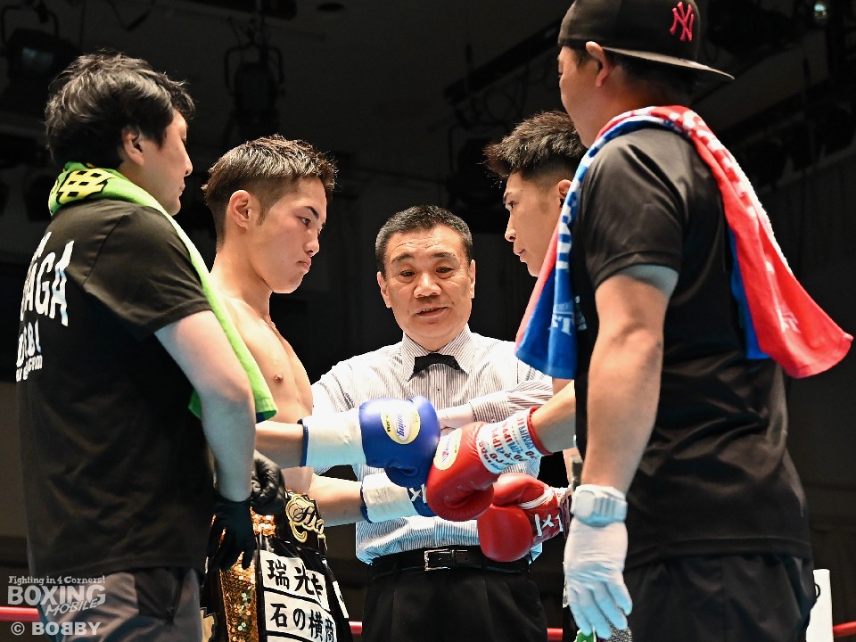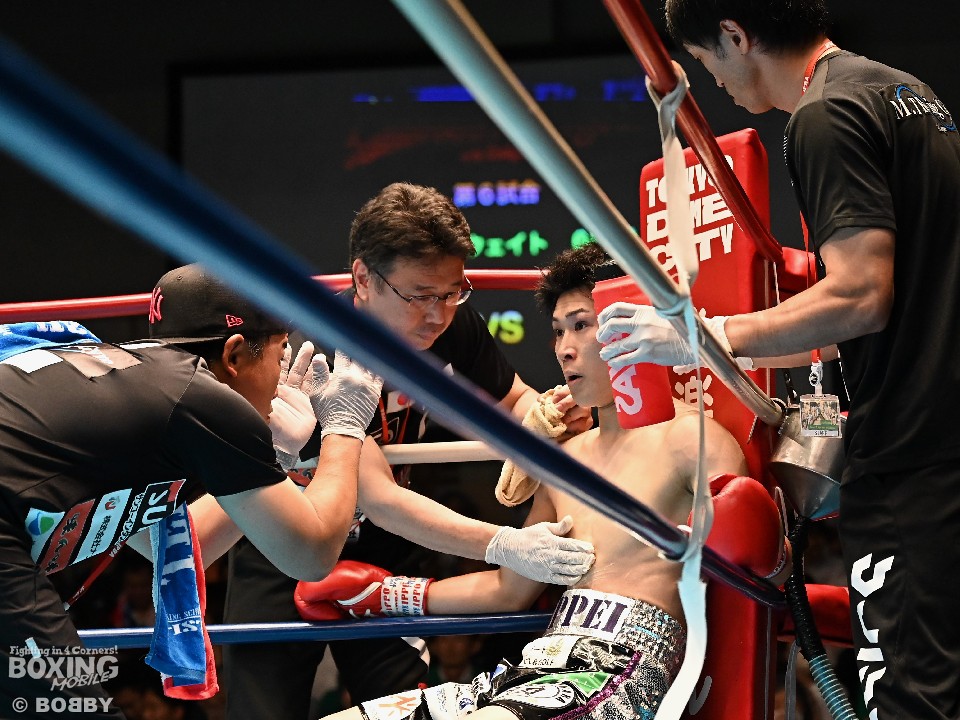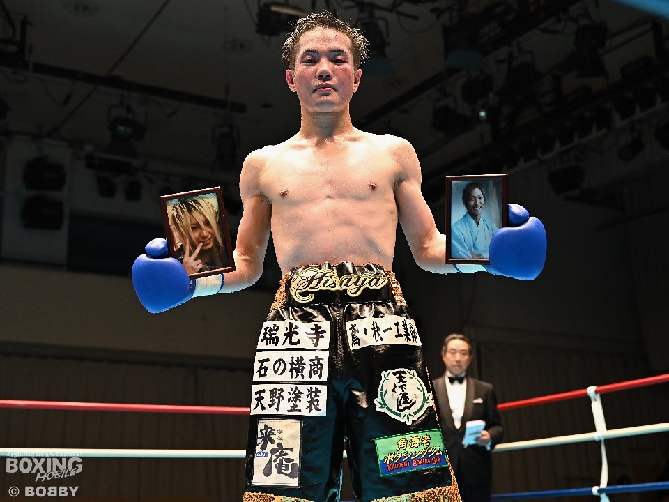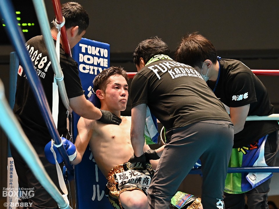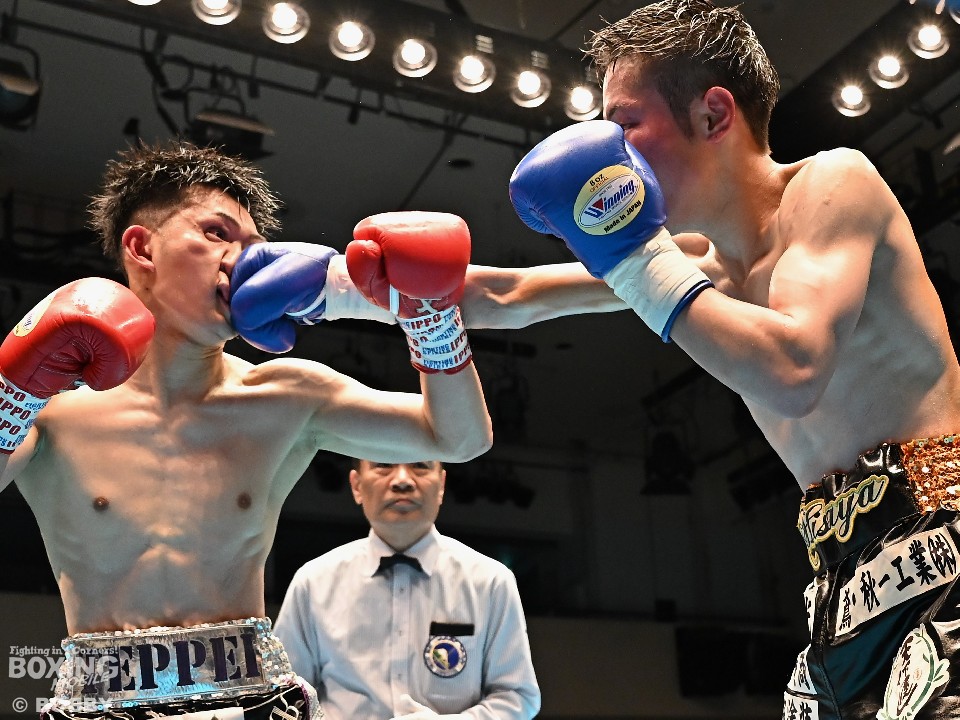 試合:岸部がジャブから右クロスで膝を揺らすと左を軸に組み立てる。後手に回った齋藤だがワンツーを返した。2回、岸部はプレスをかけてボディにパンチを集めると齋藤は失速。グイグイと攻め込んだ。3回、ショートパンチをぶつけ合うが、ここでも打ち勝ったのは岸部。気持ちがこもった打ち合いに会場はヒートアップした。4回、ギアを上げた岸部は右ボディをこれでもかと打ち込みフィニッシュを狙う。しかし、齋藤も勝利への執念を見せた。勝負が決まったのは5回。岸部がラストスパート!細かいパンチを浴びせるとダメージの深さを考慮したレフェリーが抱きかかえた。