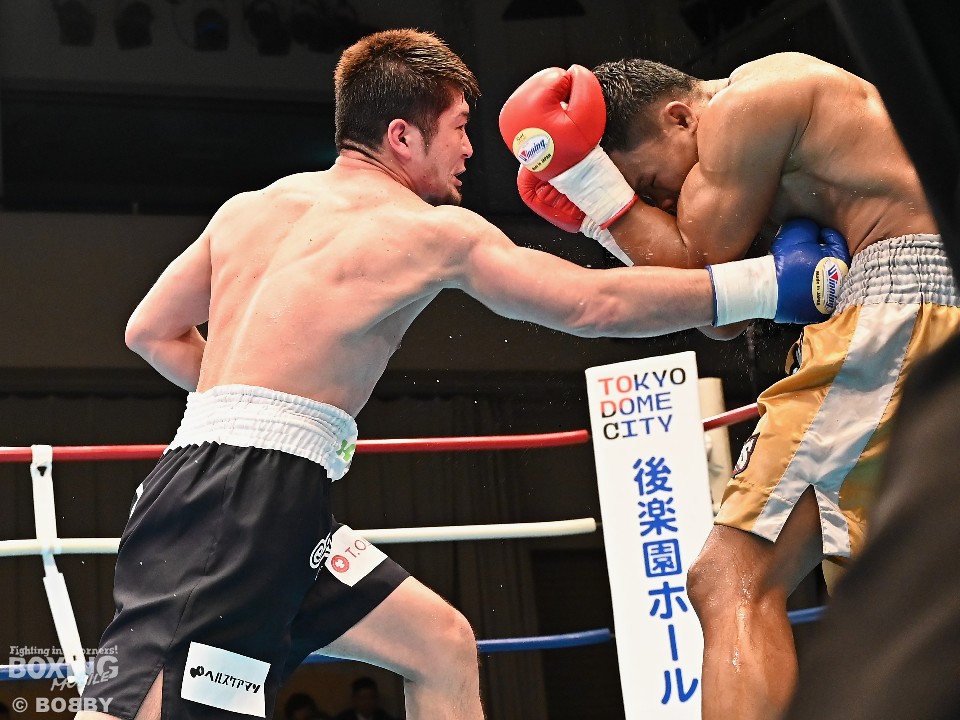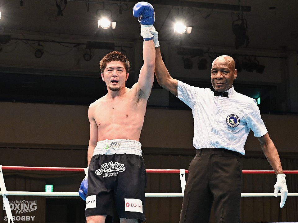 試合:左右田がジャブを飛ばしながら左ボディを好打し先制攻撃。リズムを作ると右ショートでダウンを奪った。2回、左右田は左ボディを痛打しジワリジワリと攻めたてると、ラウンド終盤に右を合わせてダウンを追加した。ポイントを挽回したいチャンは3回、プレスをかけて右フックから切り込むが、左右田は右アッパーでグラつかせると連打から右アッパーで再び倒した。5回、左右田はコンビネーションを決めて、これでもかと打ち込むが粘り強いチャンを仕留めきるまでには至らず。それでも最後まで手数を落とさず攻め切った。大差判定勝ちで左右田はA級昇格を決めた。