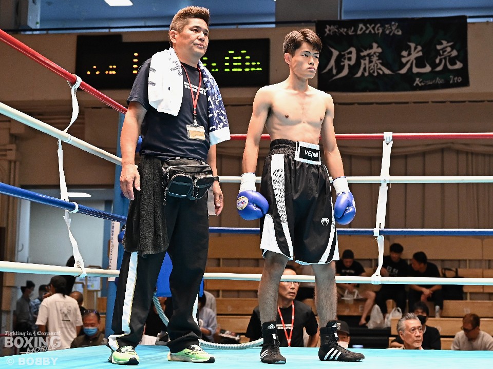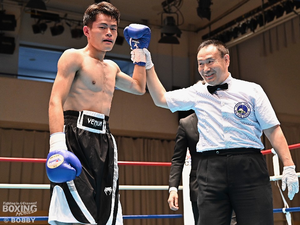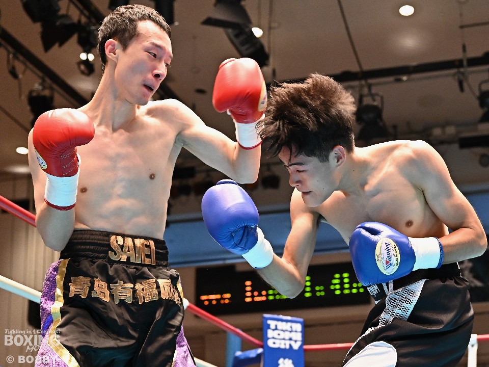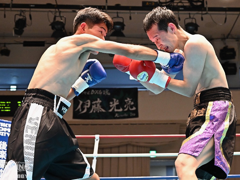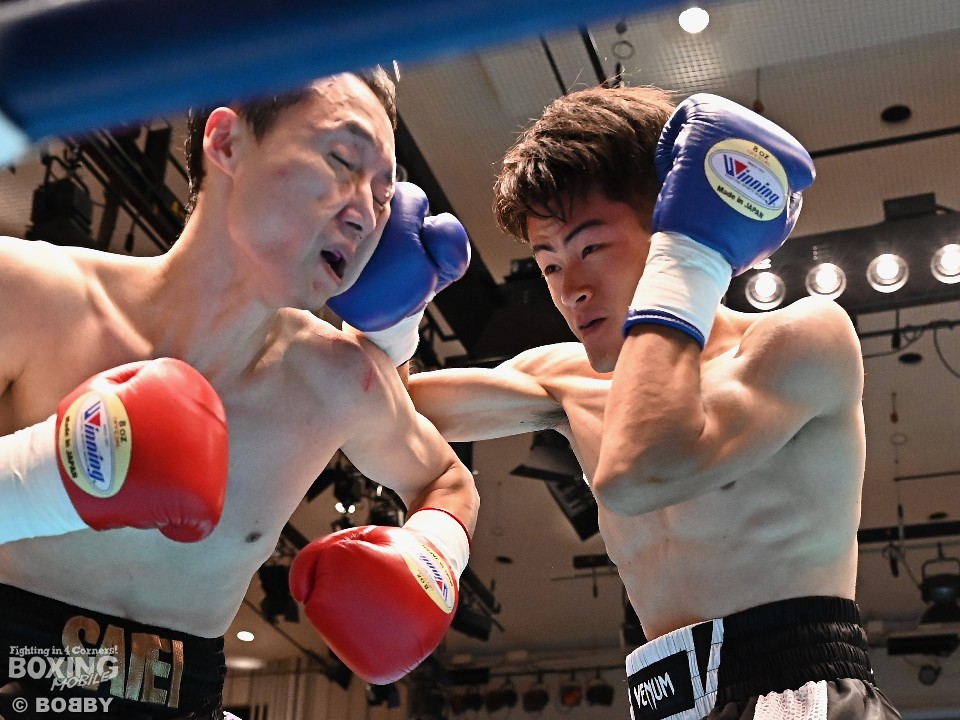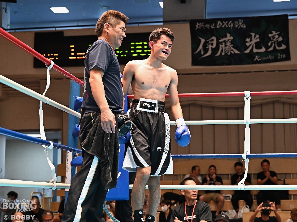 試合:今治が重心を落として右フックから左ボディをヒット。最初からエンジン全開でグイグイと攻め立てる。ペースを取られた斉は、右フックを返すが相手の勢いを止めることができず。2回も今治は攻撃の手を緩めずテンポよく左右を浴びせて攻勢。連打でレフェリーストップに持ち込んだ。17歳の今治が初勝利した。