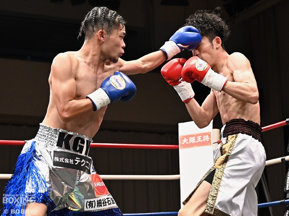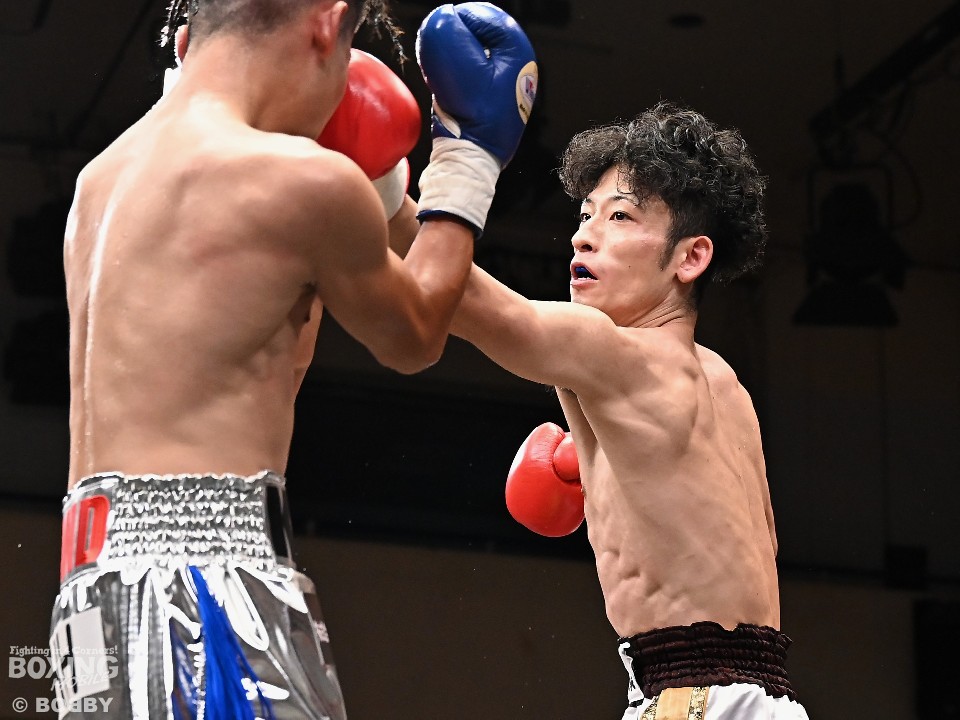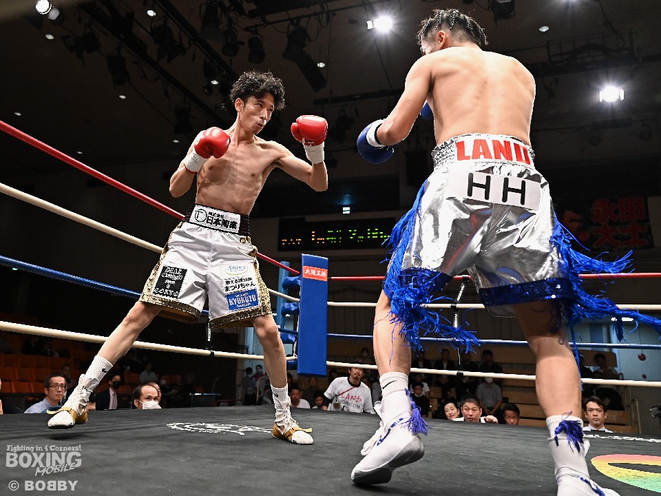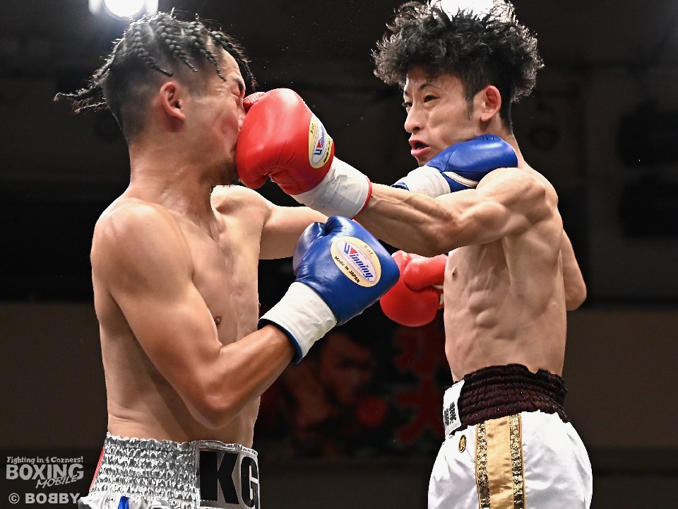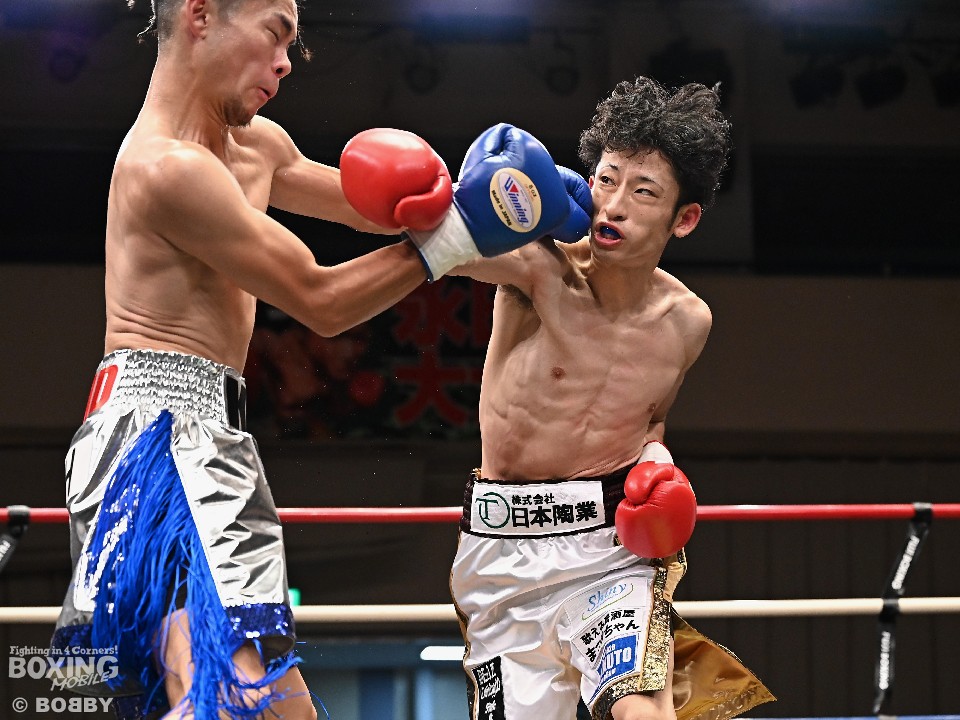 試合:加賀谷が距離を詰めながら左ボディから仕掛けるのに対し、佐藤はジャブからタイミングを図るとワンツーを好打。足を使いながら軽快な動きを見せた。2回、佐藤は右アッパーで迎え撃つとワンツーで突き放しペースを維持。打ち合いに持ち込みたい加賀谷だが思い通りの展開を作れず。それでも積極的な攻撃を繰り広げた。4回、加賀谷は右フックでガクッと腰を沈めさせて形勢逆転。パンチをまとめにいくが、あと一発を打ち込めず。ピンチの佐藤は左フックを返して試合終了のゴングを聞いた。ジャッジ2者が引き分けとしたため勝敗がつかなかった。