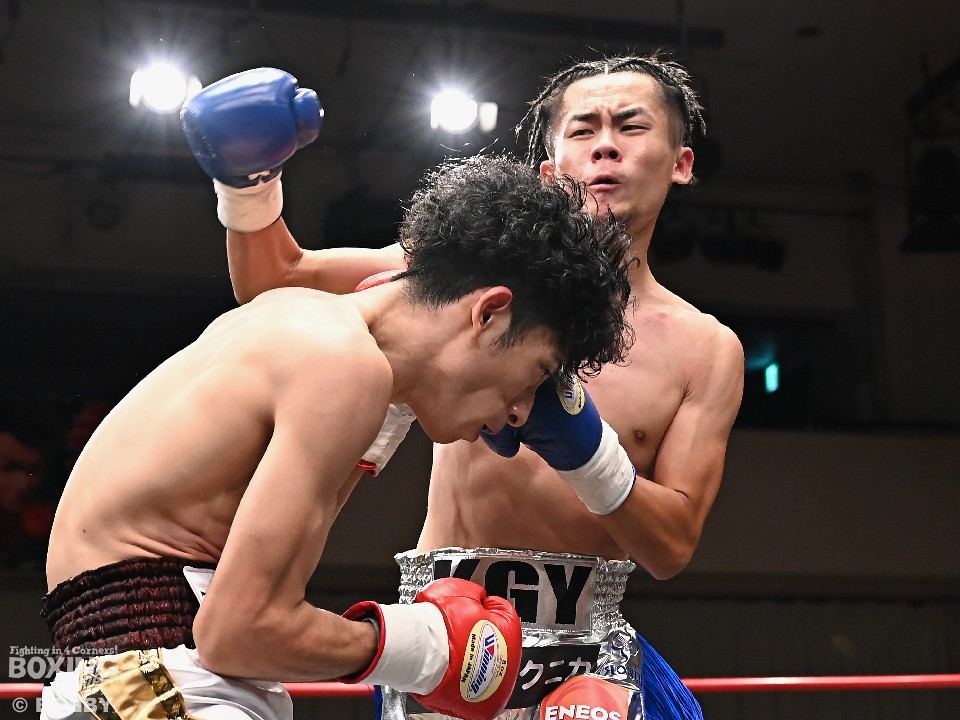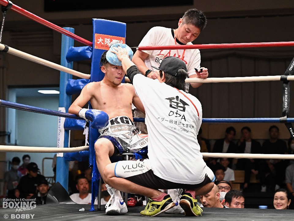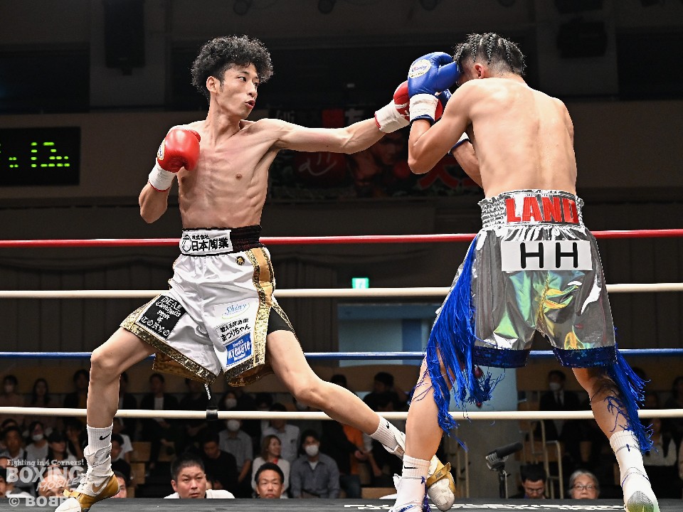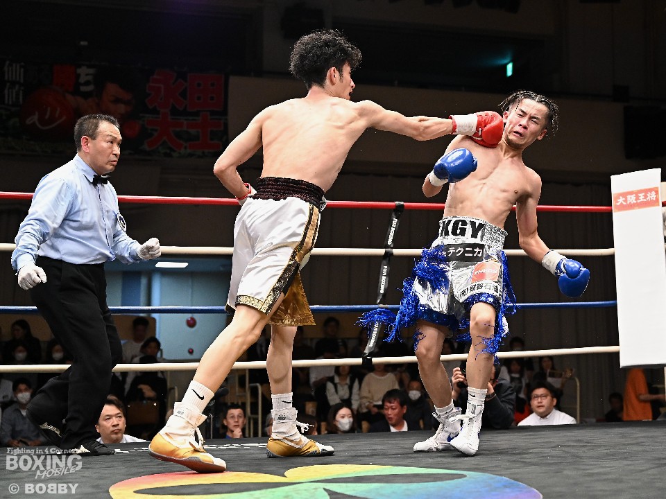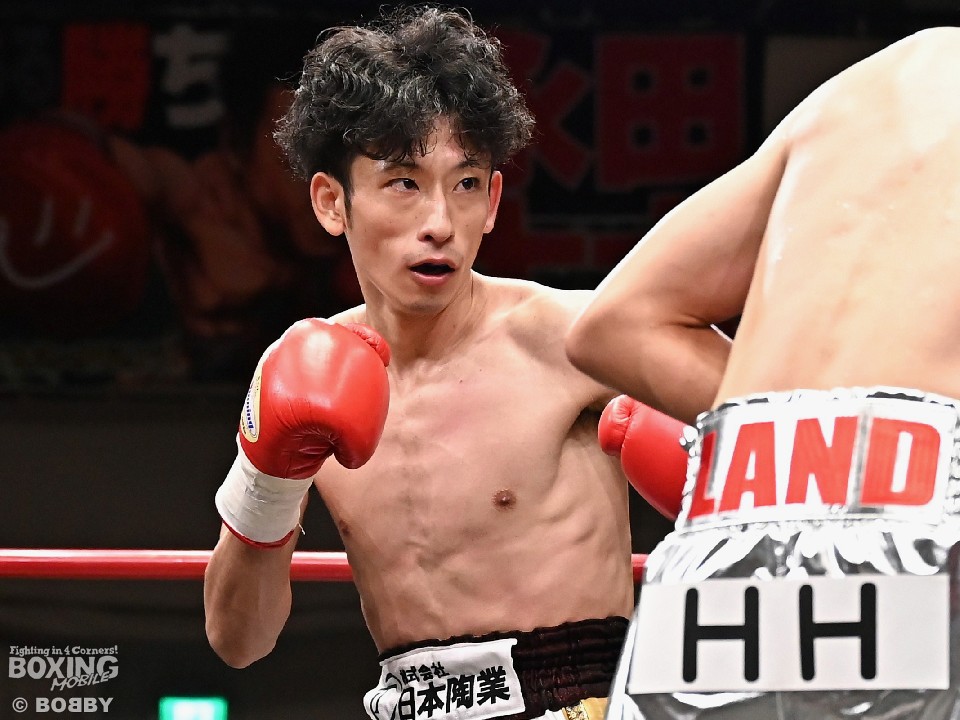 試合:加賀谷が距離を詰めながら左ボディから仕掛けるのに対し、佐藤はジャブからタイミングを図るとワンツーを好打。足を使いながら軽快な動きを見せた。2回、佐藤は右アッパーで迎え撃つとワンツーで突き放しペースを維持。打ち合いに持ち込みたい加賀谷だが思い通りの展開を作れず。それでも積極的な攻撃を繰り広げた。4回、加賀谷は右フックでガクッと腰を沈めさせて形勢逆転。パンチをまとめにいくが、あと一発を打ち込めず。ピンチの佐藤は左フックを返して試合終了のゴングを聞いた。ジャッジ2者が引き分けとしたため勝敗がつかなかった。