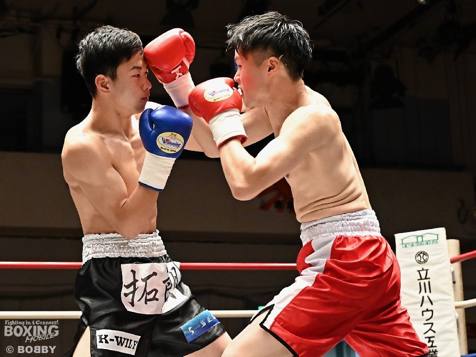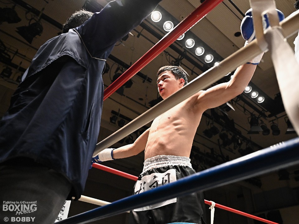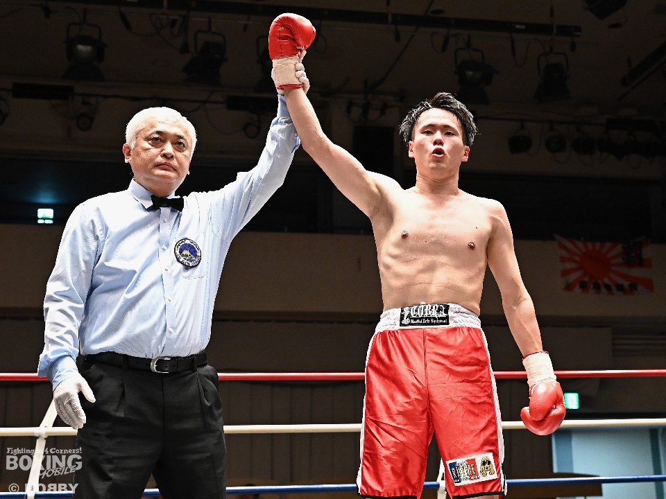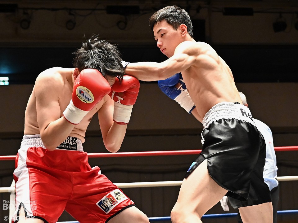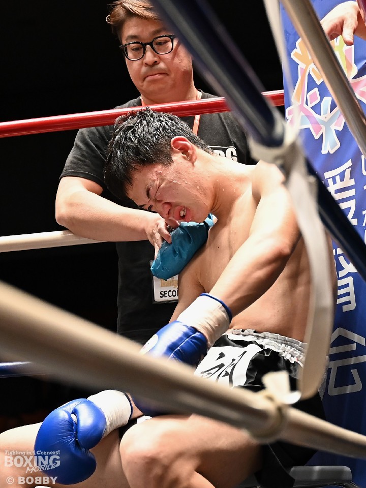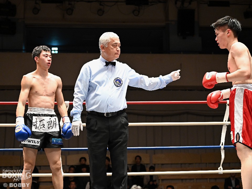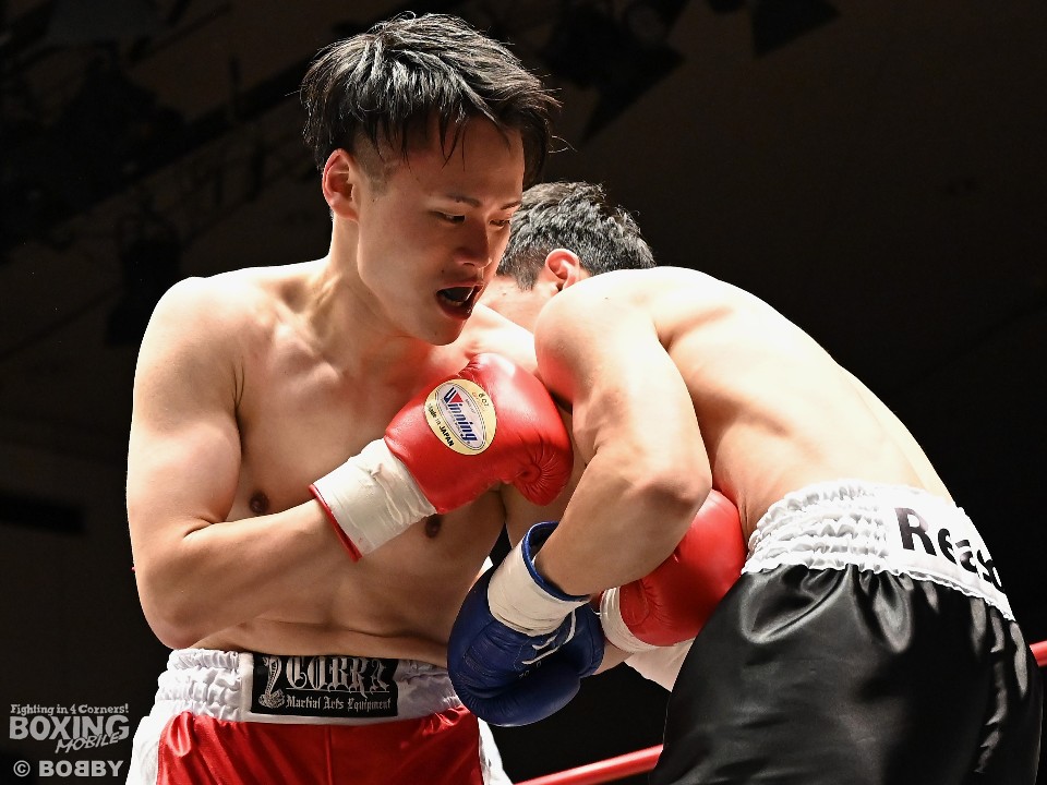 試合:保木井が距離を詰めて左ショートフックをコツコツと当てて先制。ジャブから組み立てたい松村だが左右フックを浴びて思い通りの展開を作れず。2回、松村は足を使いながらサウスポーにスイッチすると左ショートを合わせて反撃。保木井は負けじとパンチを返した。3回開始早々、松村は右肩を負傷。ドクターチェックの末、これ以上の試合続行は不能と判断したレフェリーが試合を止めた。