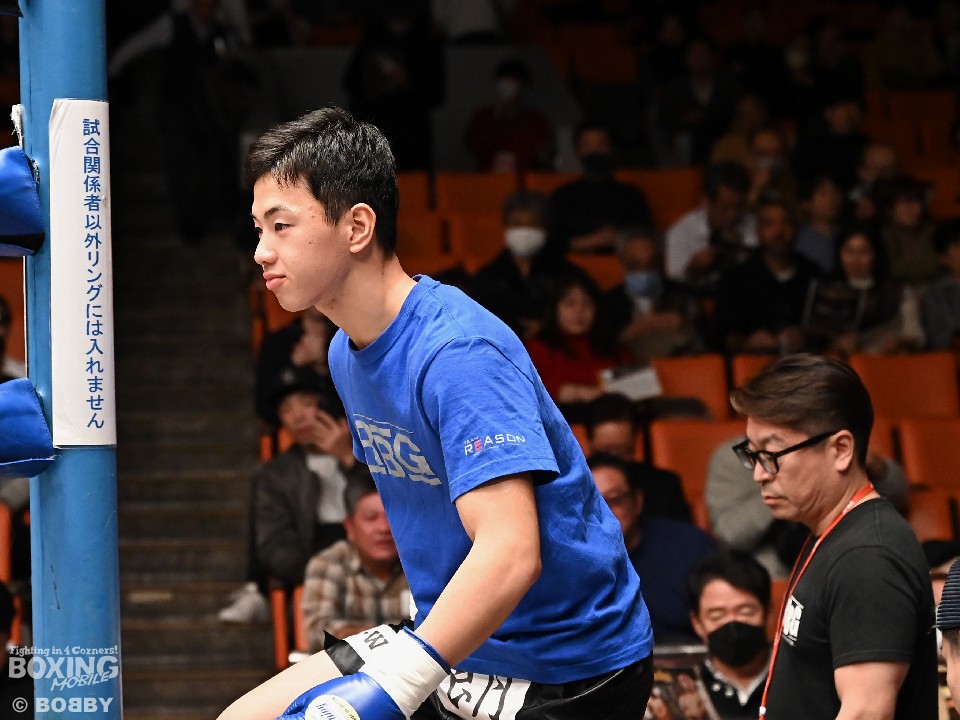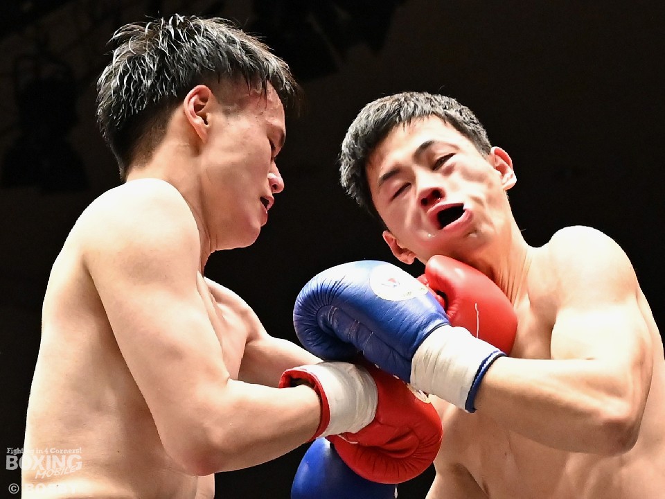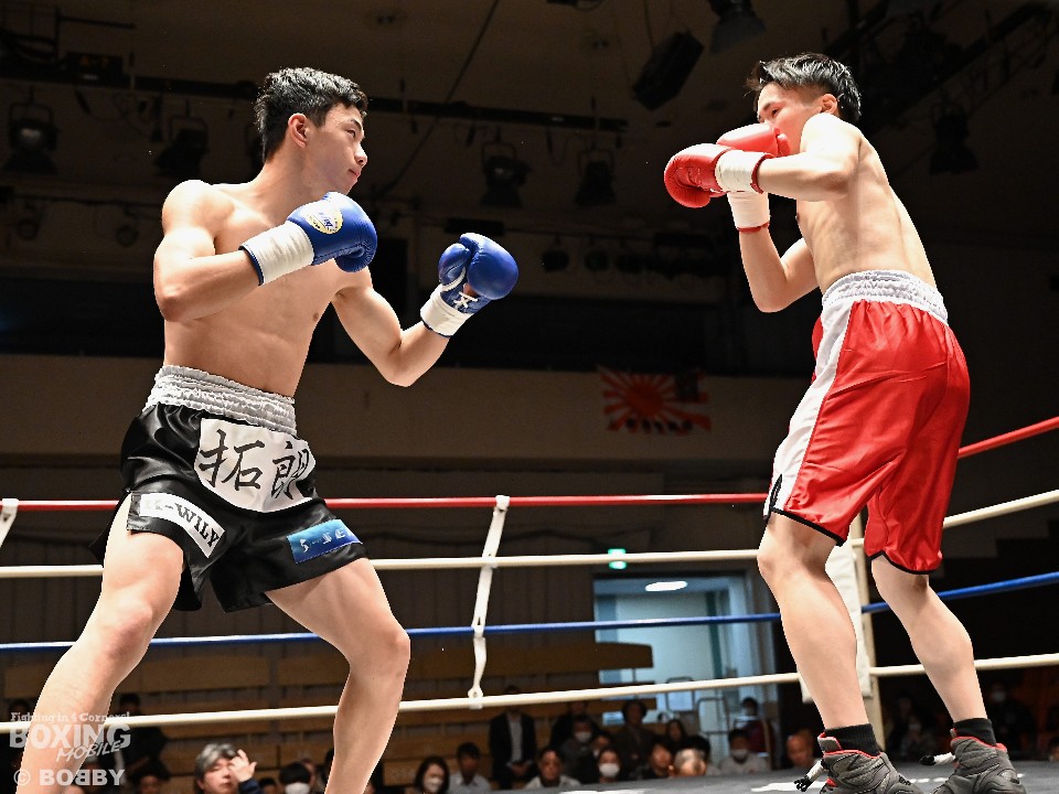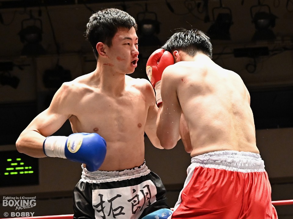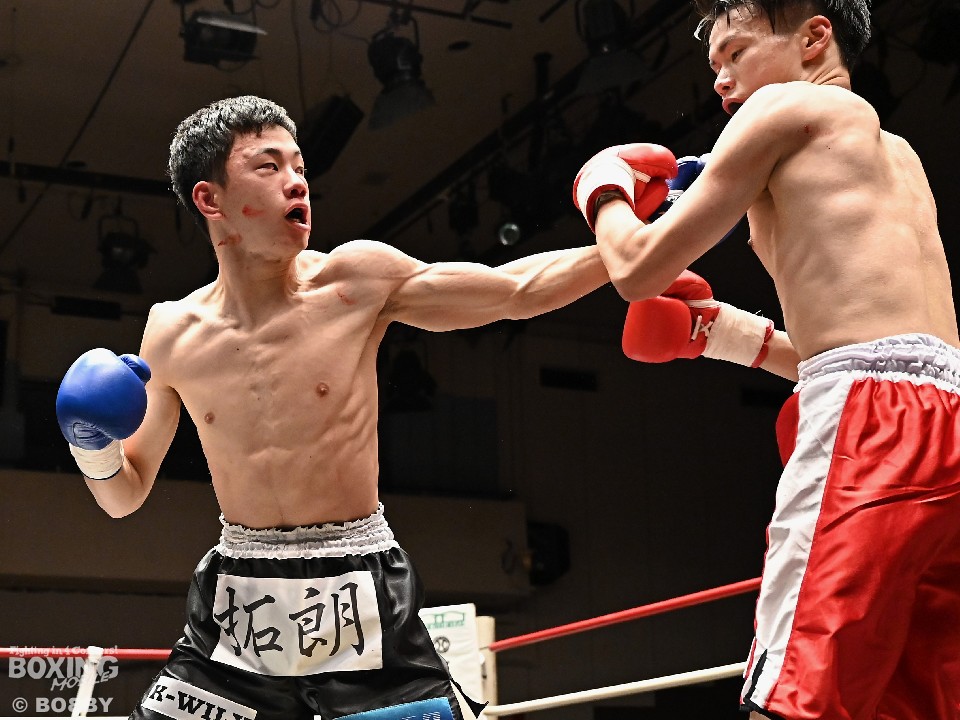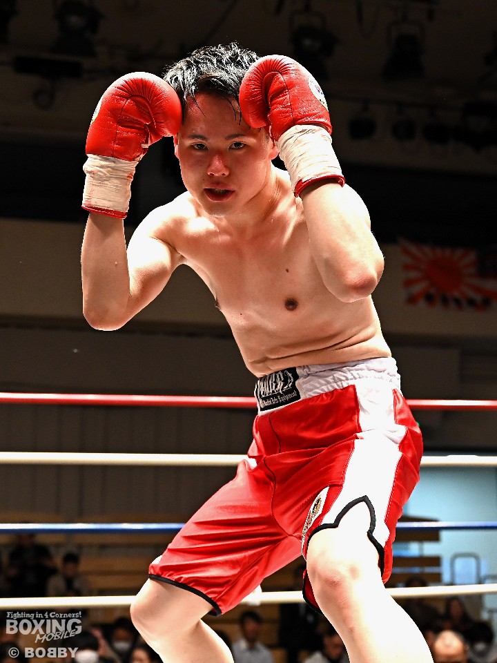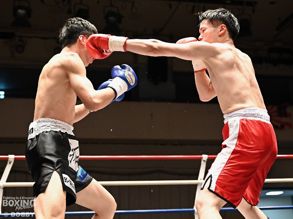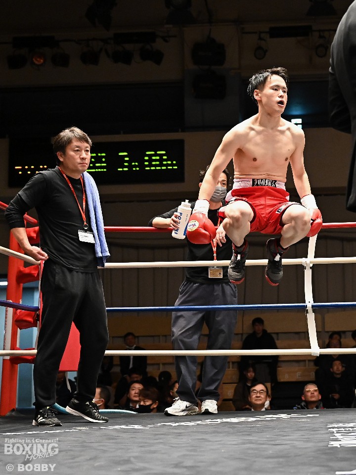 試合:保木井が距離を詰めて左ショートフックをコツコツと当てて先制。ジャブから組み立てたい松村だが左右フックを浴びて思い通りの展開を作れず。2回、松村は足を使いながらサウスポーにスイッチすると左ショートを合わせて反撃。保木井は負けじとパンチを返した。3回開始早々、松村は右肩を負傷。ドクターチェックの末、これ以上の試合続行は不能と判断したレフェリーが試合を止めた。
