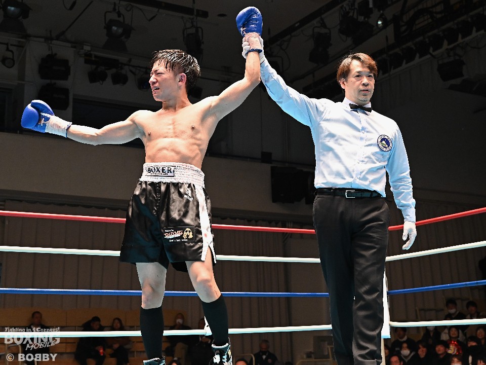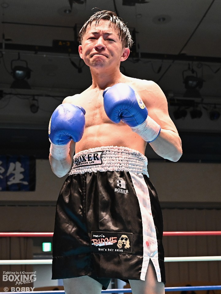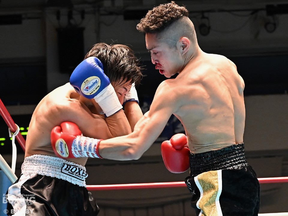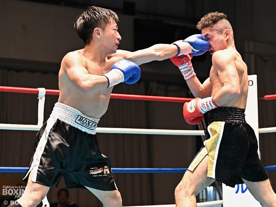 試合:飯塚が力強いワンツーを打ち込むと木下も真っ向から応戦。木下は相撃ちの右でダウンを演出。立ち上がった飯塚はボディにパンチを集めて逆転のチャンスを探った。2回、プレスをかける飯塚に対し、木下は打ち終わりを狙うと右ストレートを合わせて2度目のダウンをゲット。飯塚にとっては痛い失点だ。3回、カウンターを浴びた飯塚だが、気持ちの強さを見せて左右フックで反撃。4回、飯塚はなりふり構わずブンブンとパンチを振り回すが詰め切れず。木下は歯を食いしばりながらジャブを飛ばした。2度のダウンを奪った木下が連勝した。