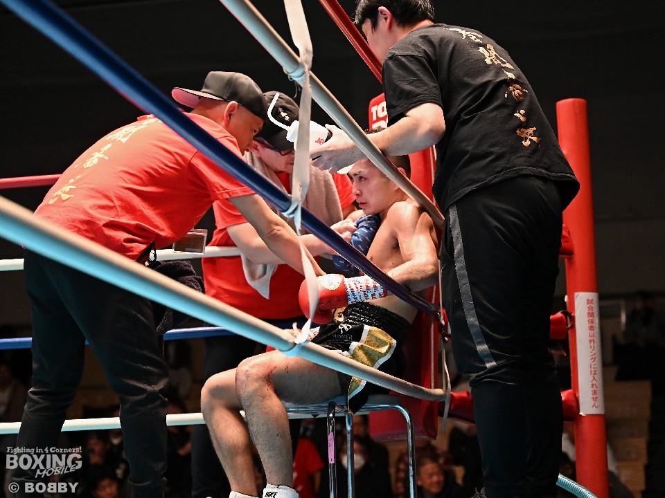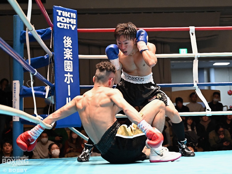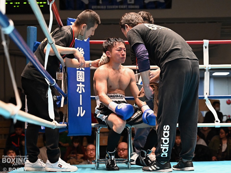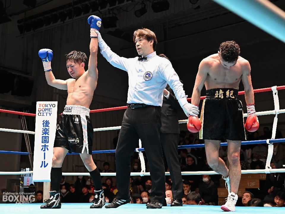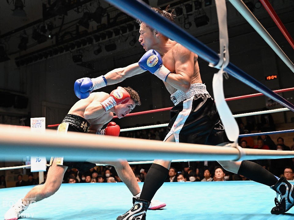 試合:飯塚が力強いワンツーを打ち込むと木下も真っ向から応戦。木下は相撃ちの右でダウンを演出。立ち上がった飯塚はボディにパンチを集めて逆転のチャンスを探った。2回、プレスをかける飯塚に対し、木下は打ち終わりを狙うと右ストレートを合わせて2度目のダウンをゲット。飯塚にとっては痛い失点だ。3回、カウンターを浴びた飯塚だが、気持ちの強さを見せて左右フックで反撃。4回、飯塚はなりふり構わずブンブンとパンチを振り回すが詰め切れず。木下は歯を食いしばりながらジャブを飛ばした。2度のダウンを奪った木下が連勝した。