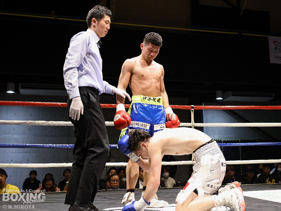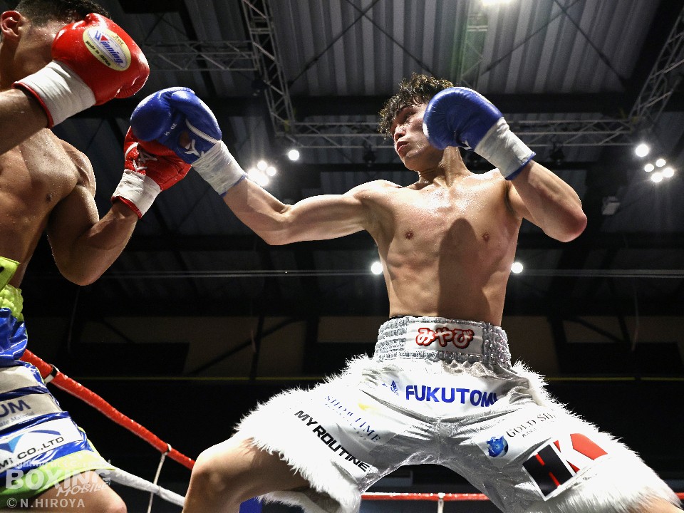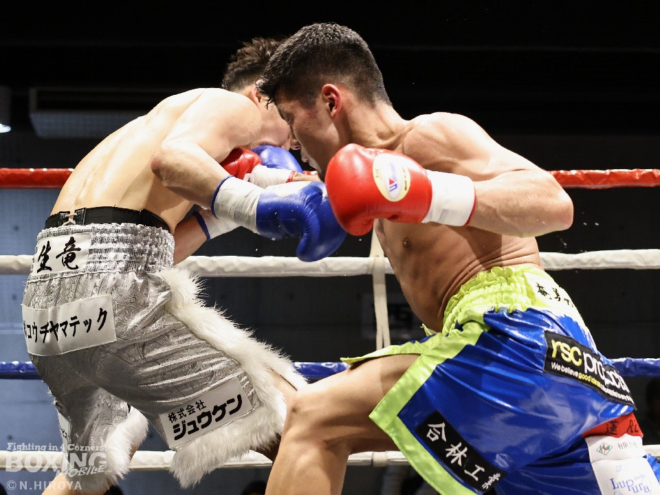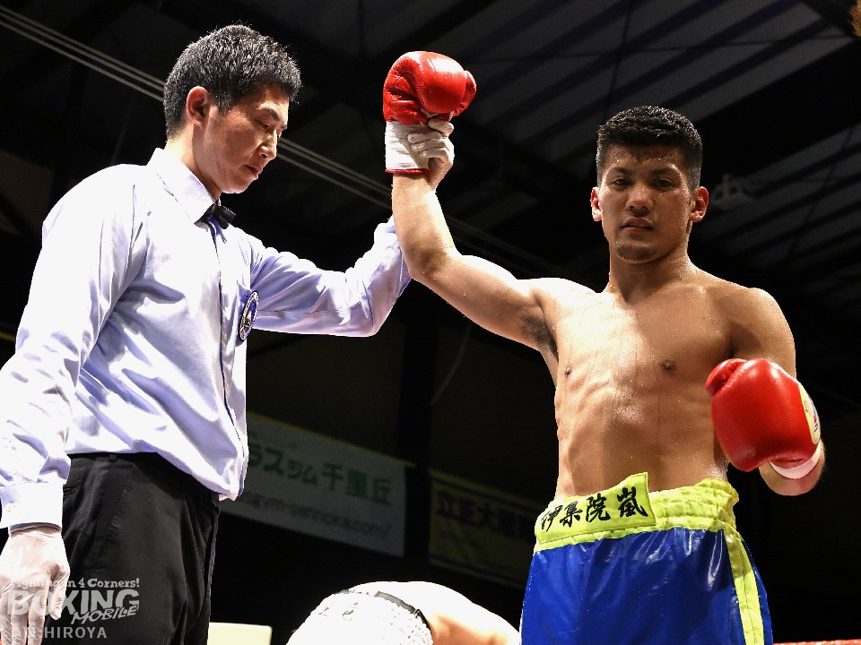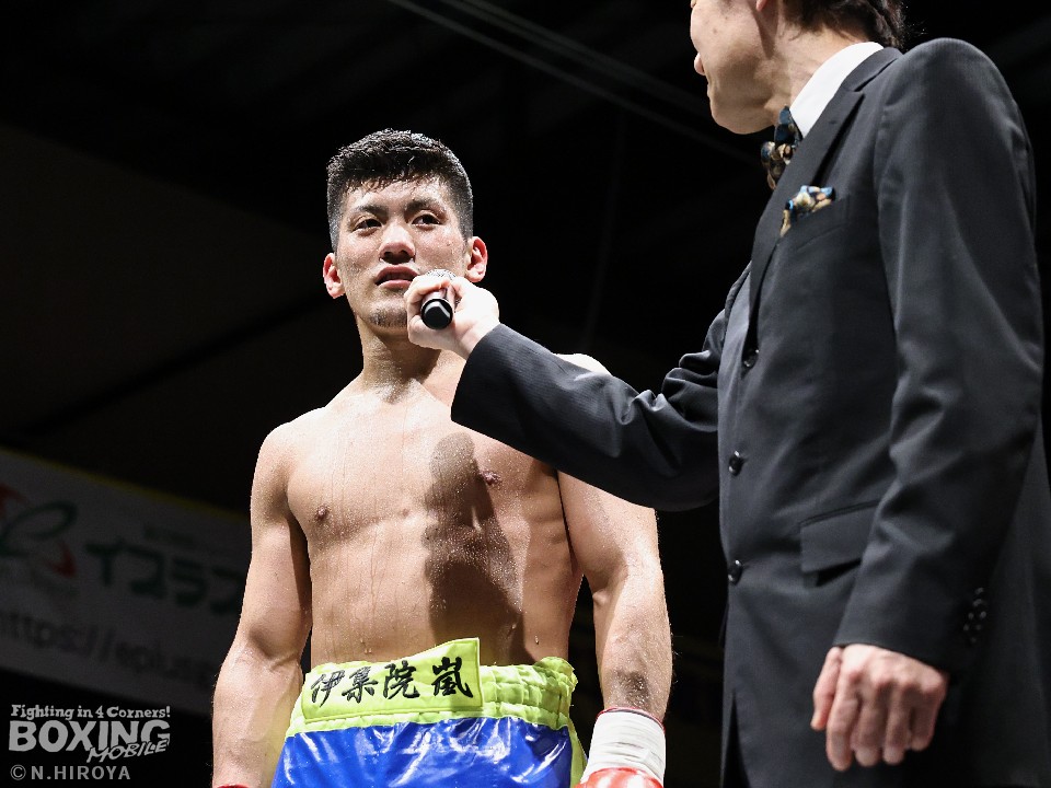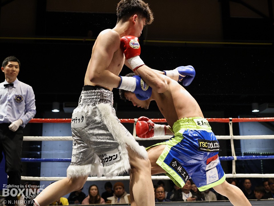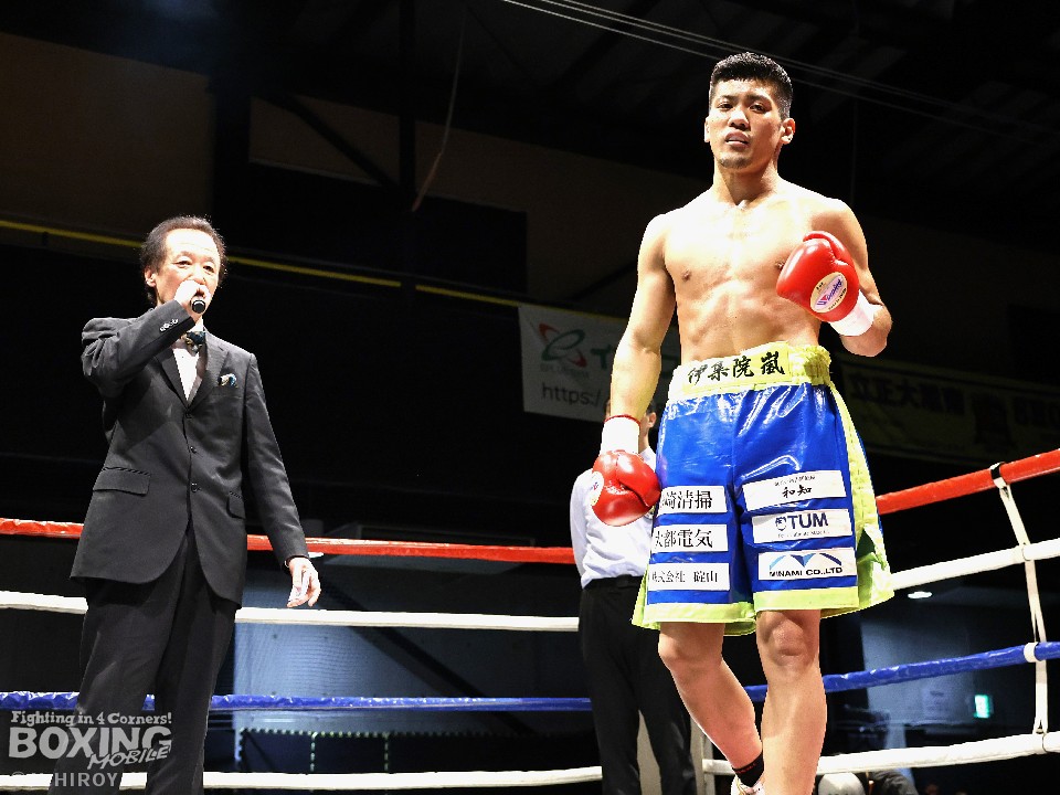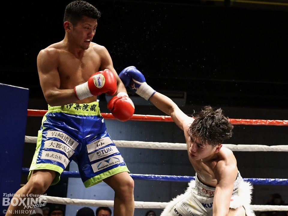 試合:サウスポー山名が前の手で揺さぶりをかけながら、左ボディストレートを差し込むと、ワンツー左アッパーで積極的な攻撃。被弾を最小限に抑えた伊集院だが距離が遠そうだ。2回、山名は頭を上手くずらしながら右フック、左オーバーハンドを好打。4回、伊集院は左フックで倒すとレフェリーはダウンを宣告。再開後、ボディにパンチを集めて攻勢。山名も負けじと打ち返した。5回、山名はミドルレンジからワンツー、左アッパーをヒット。緩急をつけた攻撃で見栄えの良さをアピール。6回、伊集院は右ストレートから返しの左フックで2度目のダウンをゲット。再開後、ボディにパンチを集めて攻勢をかけた。伊集院が3連勝を飾った。