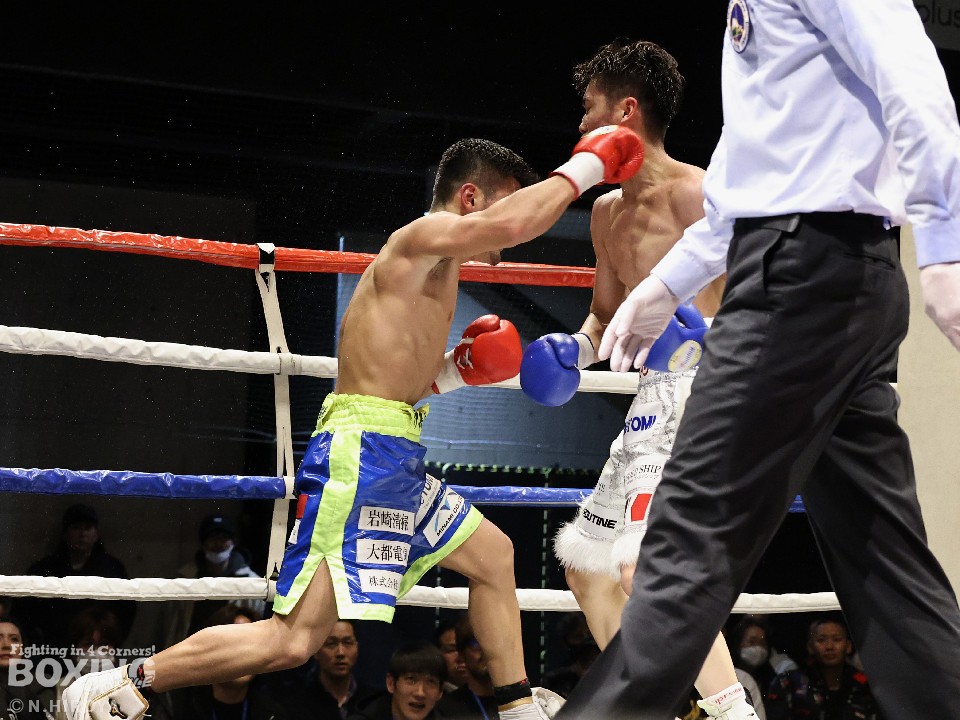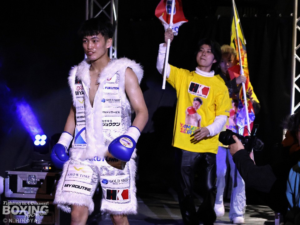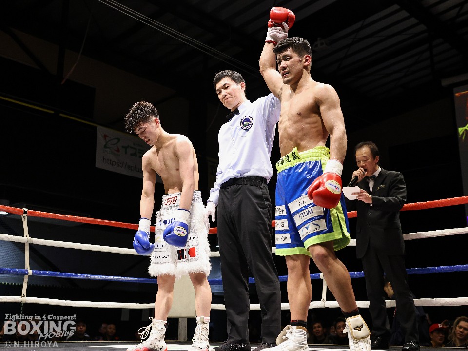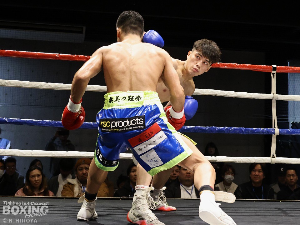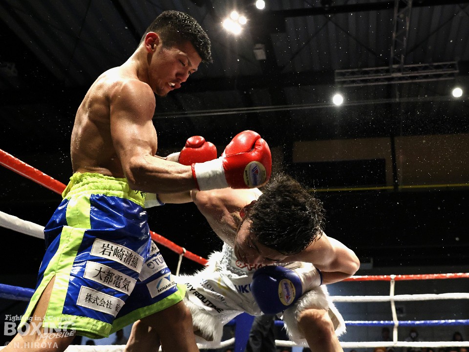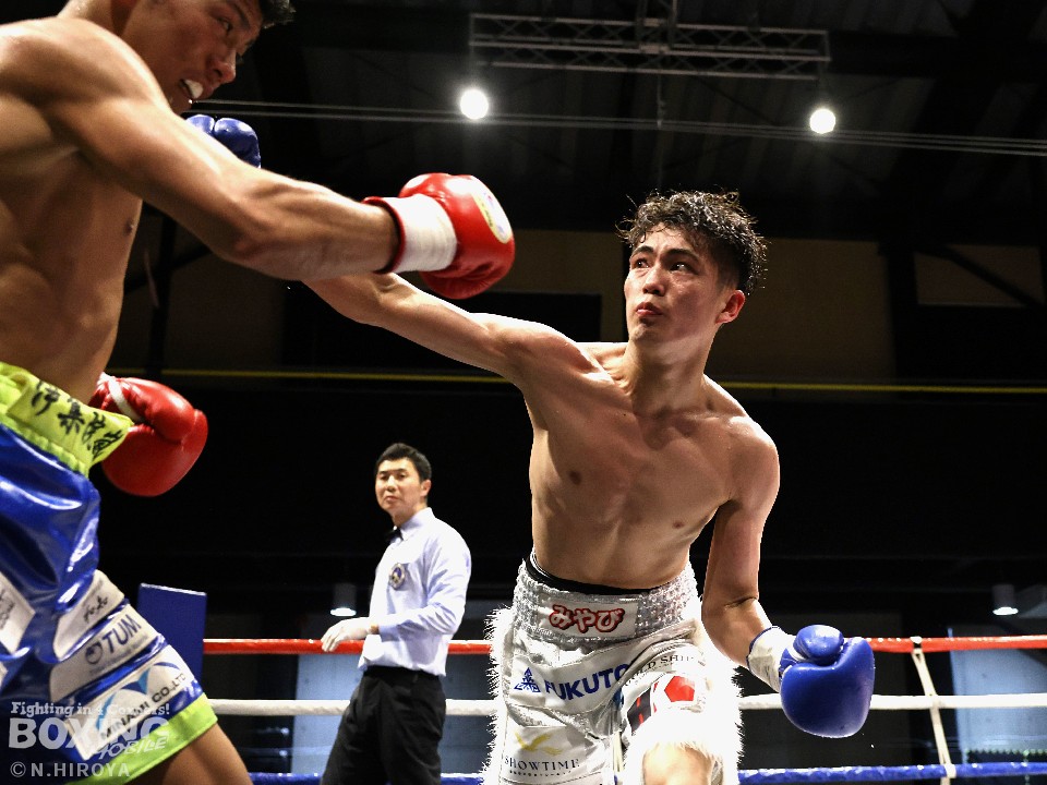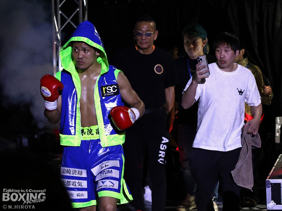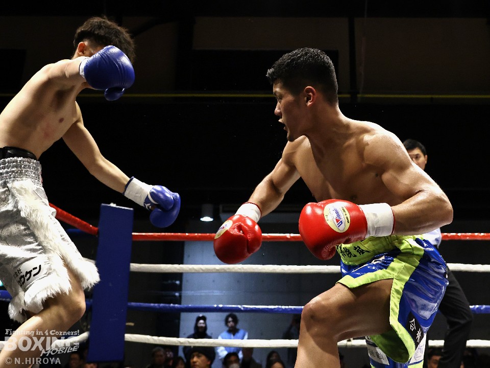 試合:サウスポー山名が前の手で揺さぶりをかけながら、左ボディストレートを差し込むと、ワンツー左アッパーで積極的な攻撃。被弾を最小限に抑えた伊集院だが距離が遠そうだ。2回、山名は頭を上手くずらしながら右フック、左オーバーハンドを好打。4回、伊集院は左フックで倒すとレフェリーはダウンを宣告。再開後、ボディにパンチを集めて攻勢。山名も負けじと打ち返した。5回、山名はミドルレンジからワンツー、左アッパーをヒット。緩急をつけた攻撃で見栄えの良さをアピール。6回、伊集院は右ストレートから返しの左フックで2度目のダウンをゲット。再開後、ボディにパンチを集めて攻勢をかけた。伊集院が3連勝を飾った。