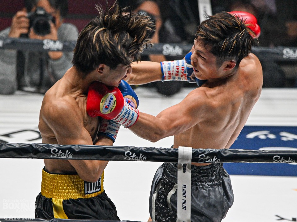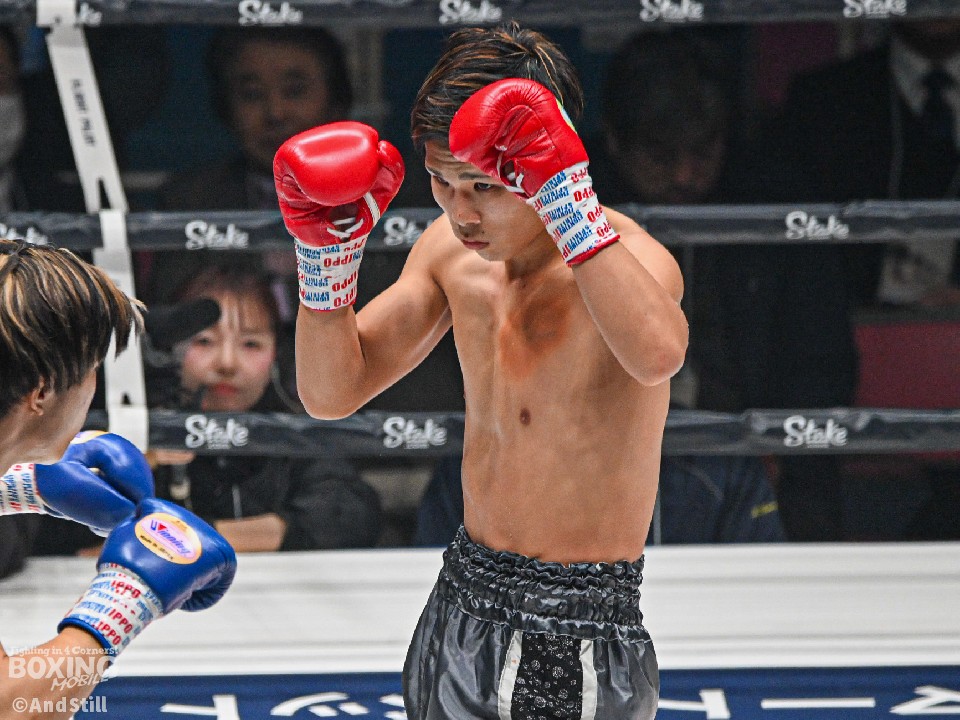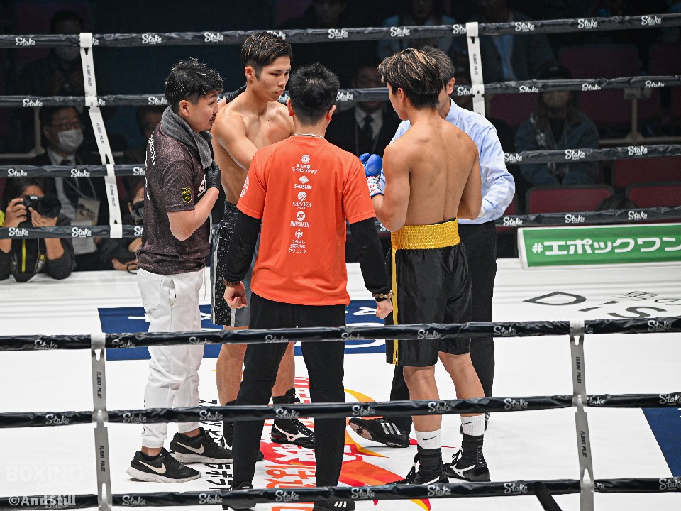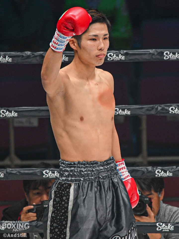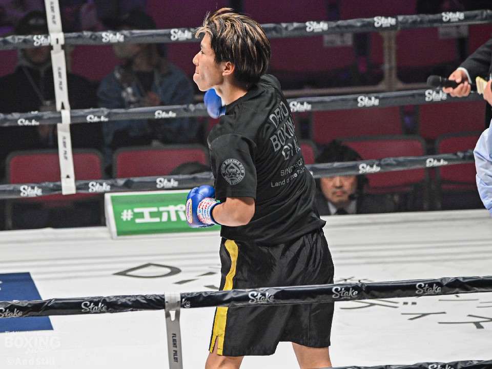 試合:静かな立ち上がりを見せる中、2分過ぎに竹中がワンツーでダウンを先取。幸先の良いスタートを切った。2回、竹中がジリジリと距離を詰めて小田がジャブを返す展開。竹中がジャブから右ボディストレートにつなげてポイントを加点。3回、左フックを合わせた小田だが、竹中は臆することなくプレスをかけてペースを維持。最終4回も竹中がジャブからワンツーを好打し勝利を確実なものとした。