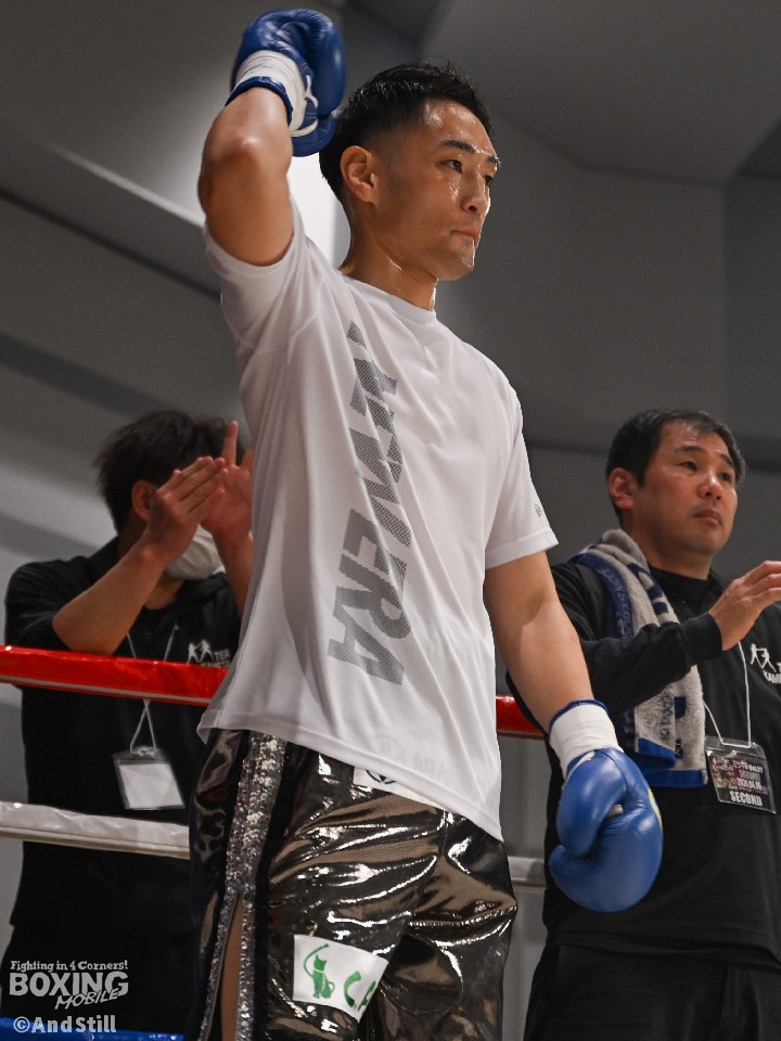 試合:大島がジリジリと距離を詰めて右ボディストレートをヒット。硬さが感じられたサウスポー冨永だが打ち下ろしの左ストレートで応戦。2回、お互いに慎重な試合運びを見せる中、大島が左フックを好打し見栄えの良さをアピール。3回、ガードを固めながらプレスをかけた大島に対し、冨永は単発の左ストレートをヒット。4回、冨永は左フックを叩きつけてダウンを演出。その後も、相手の左フックに対応しながらジワリジワリと攻め立てた。5回、大島は圧力を強めて左フックをねじ込むと積極的な攻撃で挽回。最終6回、大島は右フックで起死回生のダウンを演出。なんとか立ち上がった冨永だったが、レフェリーは10カウントを数え上げた。大島が逆転KO勝ちでランカーを撃破!リング上で勝利の雄たけびを上げた。