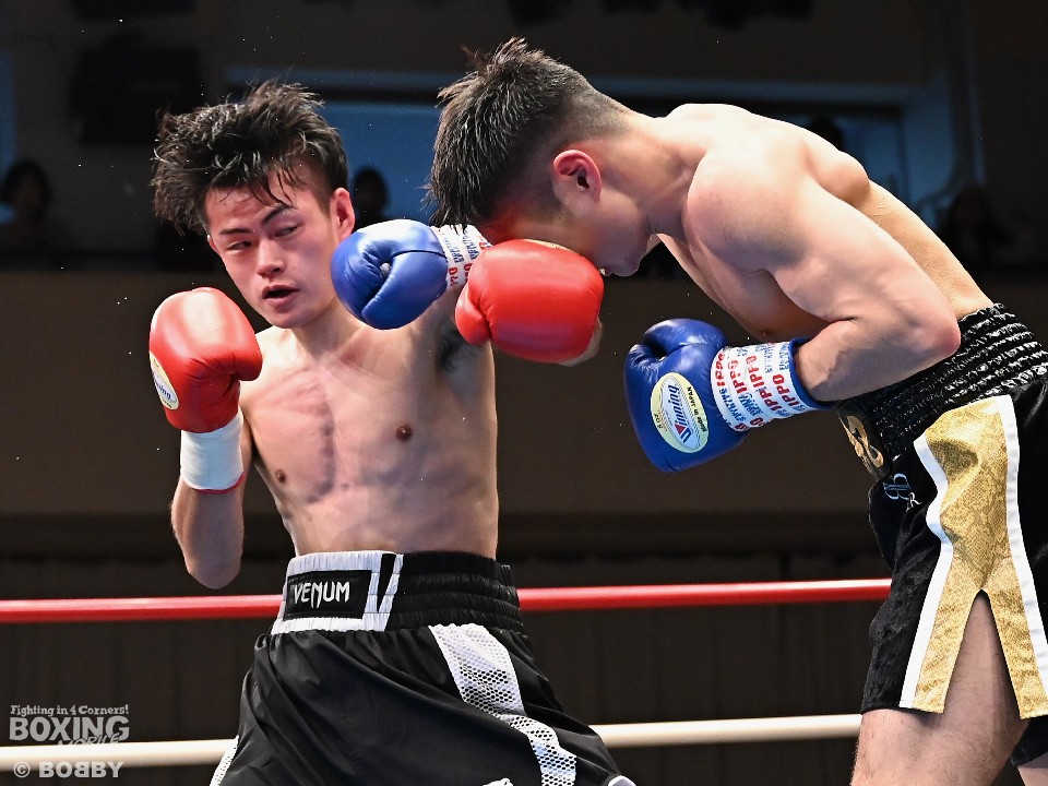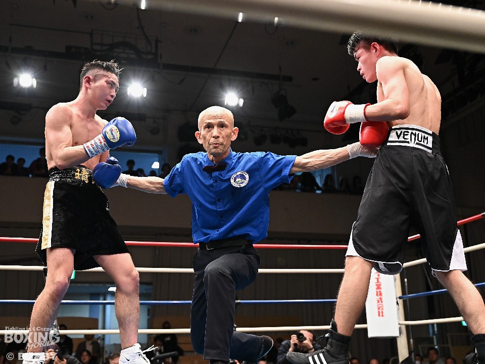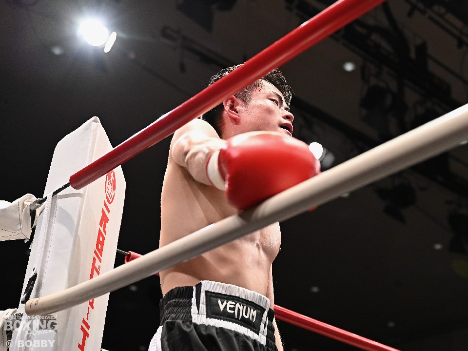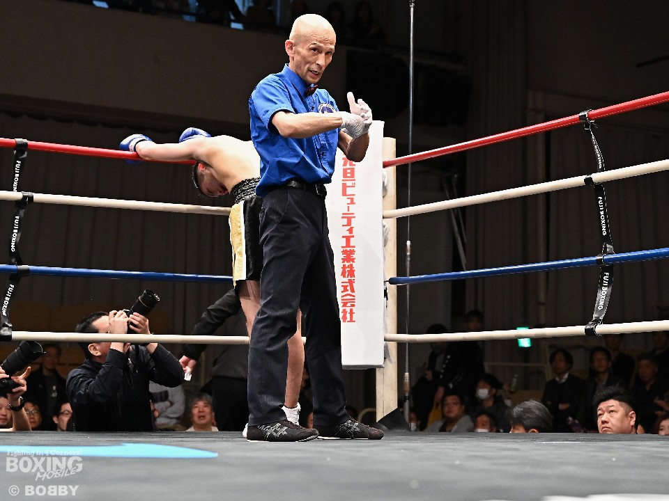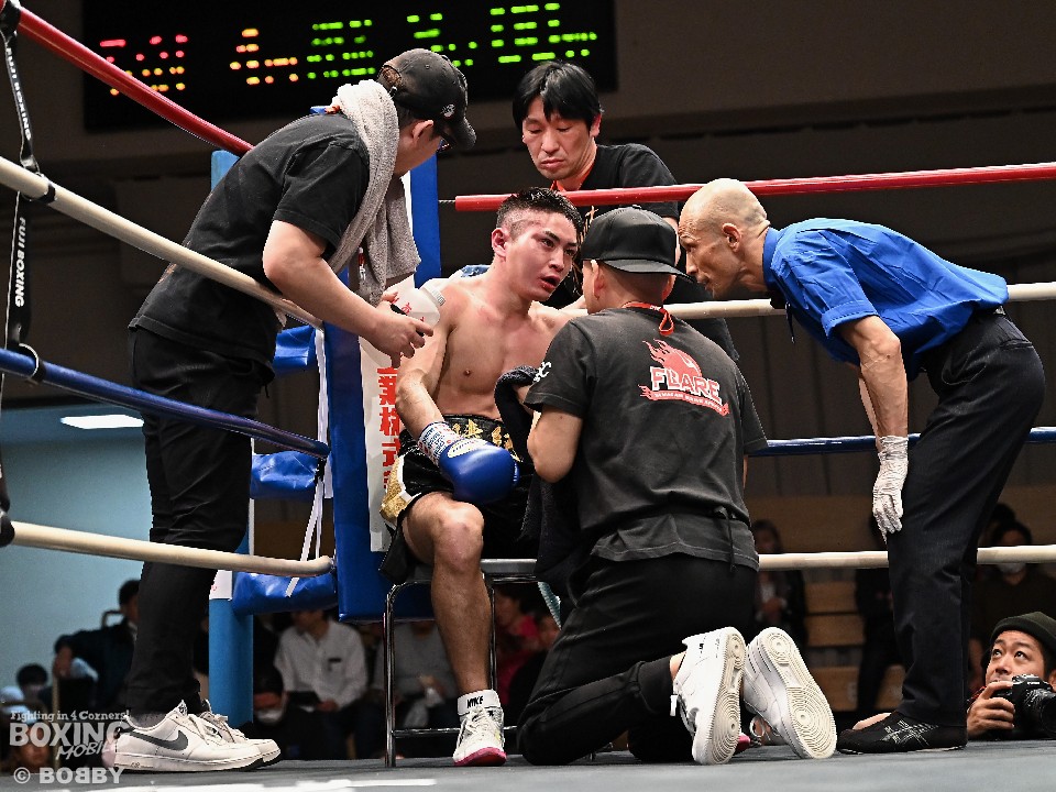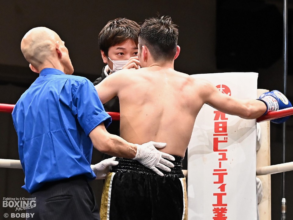試合:右ストレートから切り込む今治に対し、飯塚は右で迎え撃つと左ボディをヒット。前に出てくる相手に上手くパンチを合わせて有効打で上回った。2回、飯塚は左右フックで押し込み攻勢をかけたが、ここを踏ん張った今治は右ストレートで顔を弾きペースを手繰り寄せた。3回、体力の消耗が激しい中、今治の手数が上回った。飯塚は顎を痛めたようだ。4回、今治の攻勢が続く中、飯塚の顎の腫れがひどくレフェリーはドクターチェックを要請。これ以上の試合続行を不能としたレフェリーが試合をストップした。