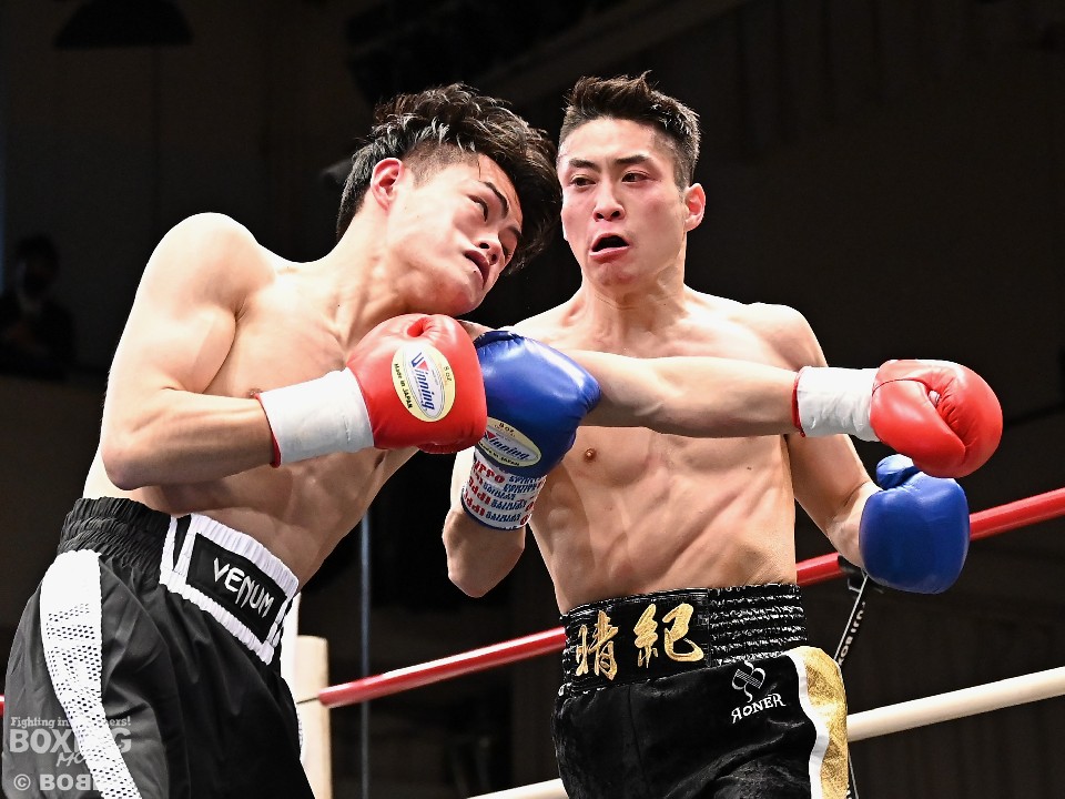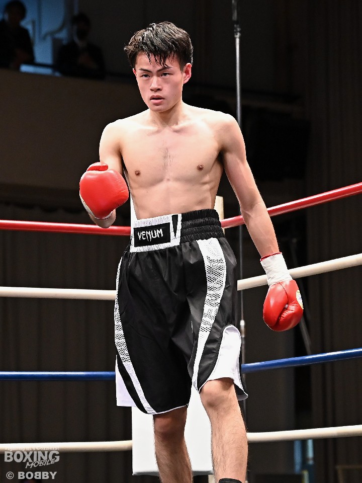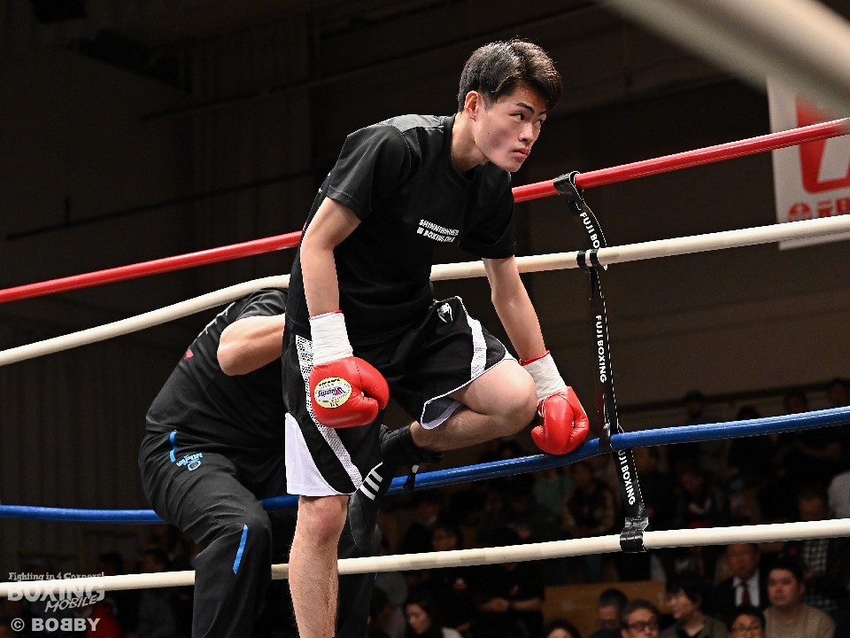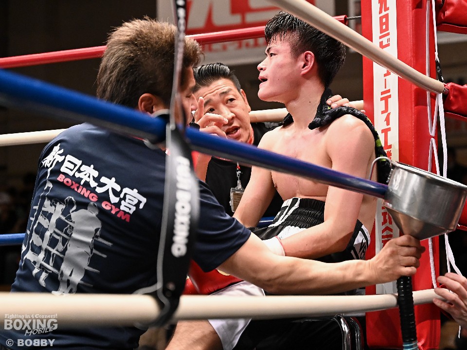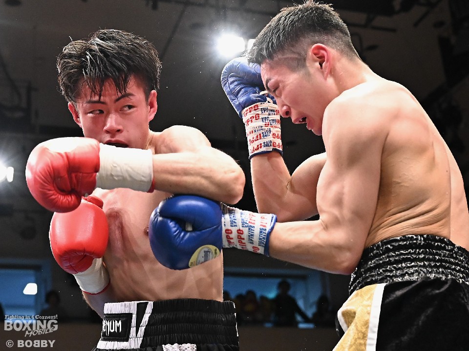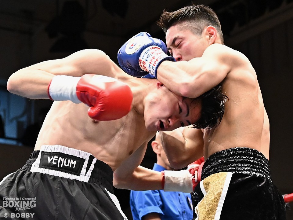 試合:右ストレートから切り込む今治に対し、飯塚は右で迎え撃つと左ボディをヒット。前に出てくる相手に上手くパンチを合わせて有効打で上回った。2回、飯塚は左右フックで押し込み攻勢をかけたが、ここを踏ん張った今治は右ストレートで顔を弾きペースを手繰り寄せた。3回、体力の消耗が激しい中、今治の手数が上回った。飯塚は顎を痛めたようだ。4回、今治の攻勢が続く中、飯塚の顎の腫れがひどくレフェリーはドクターチェックを要請。これ以上の試合続行を不能としたレフェリーが試合をストップした。