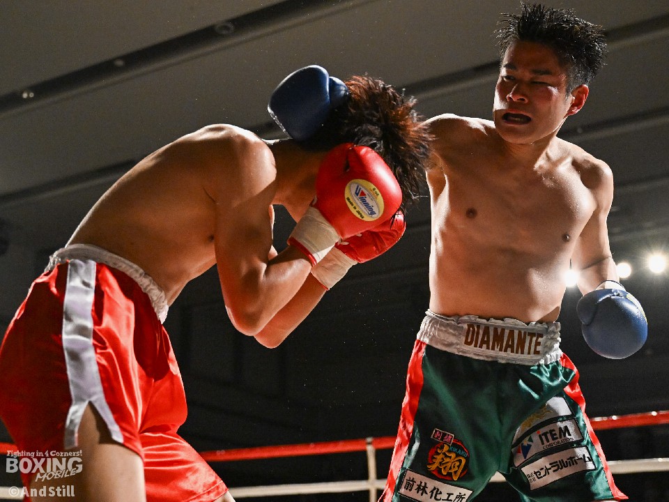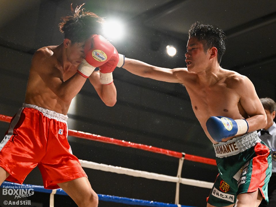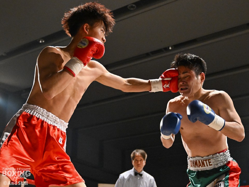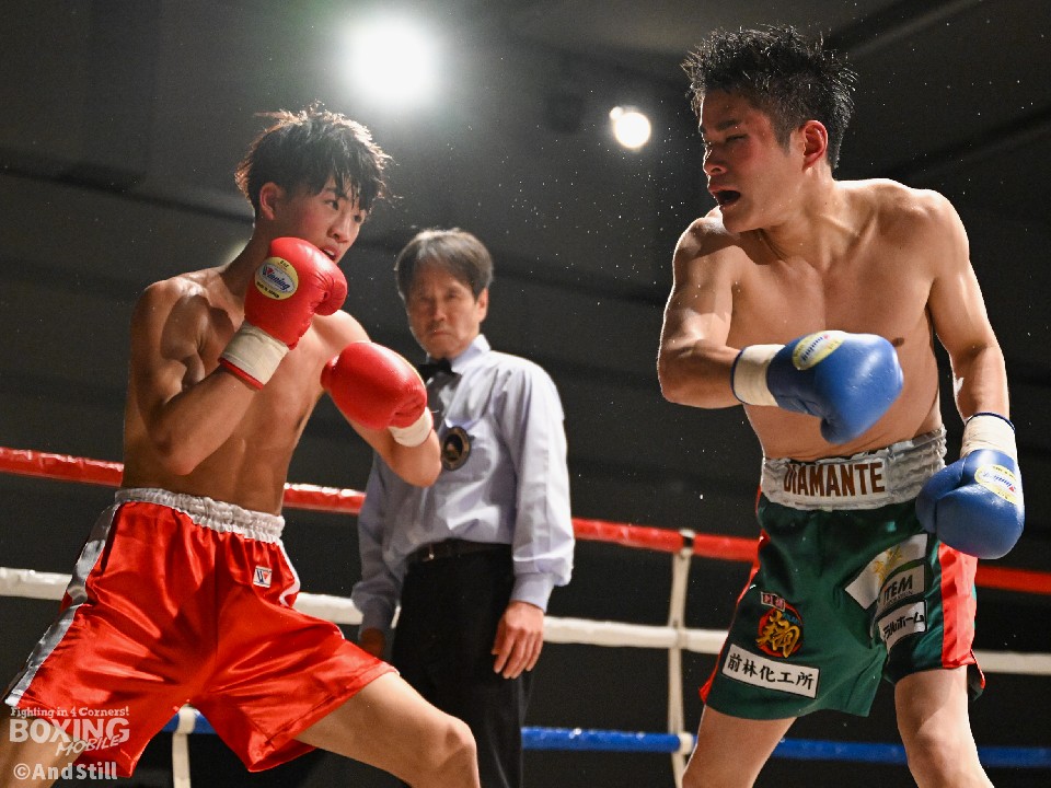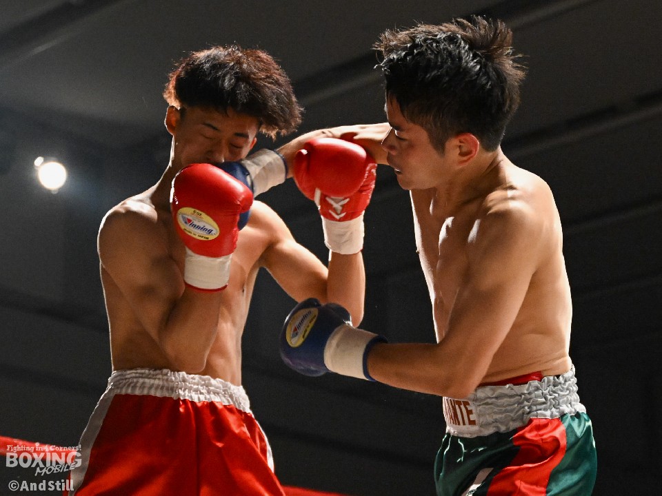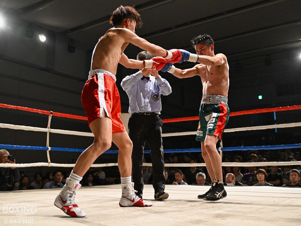 試合:中原がジャブから左ボディにつなげて先制攻撃。前林は左右フックを叩きつけて対抗。初回は中原のテンポの良さが光った。2回、前林はブンブンと左右を振ったが、中原は左ボディから上下に打ち分け優勢をアピール。3回、中原はジャブを軸に足を使って回り込むが、前林は圧力をかけて回転数を上げた。4回、前林はボディにパンチを集めて積極的な攻撃。中原はジャブを忘れずコツコツと当ててペースを渡さず。6回、「良則」コールに後押しされた前林は最後の力を振り絞ったが、中原はアウトボクシングを徹底した。終始、有効打で上回った中原が勝利した。