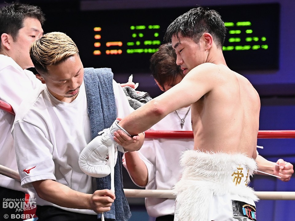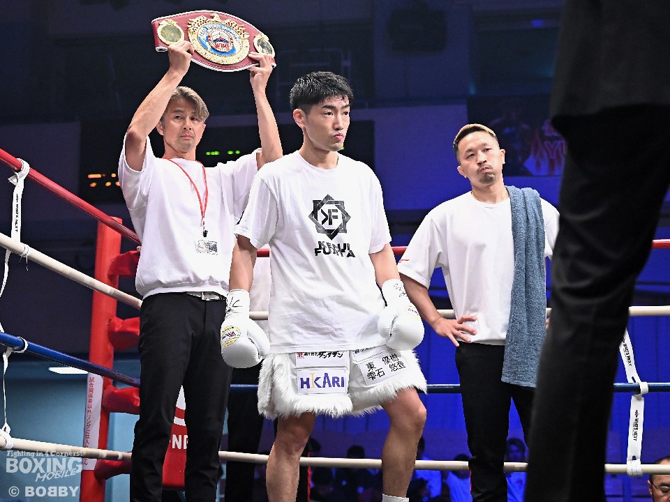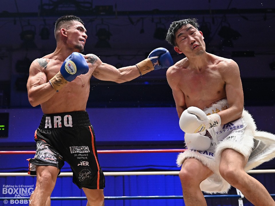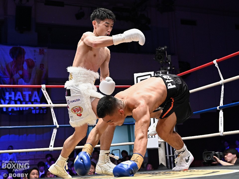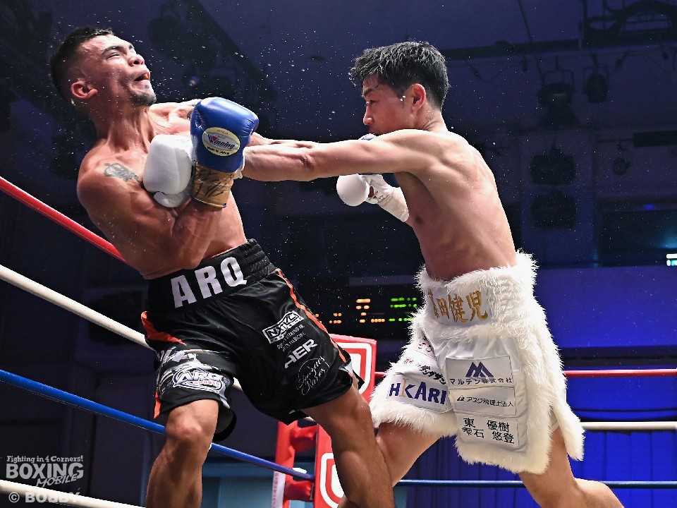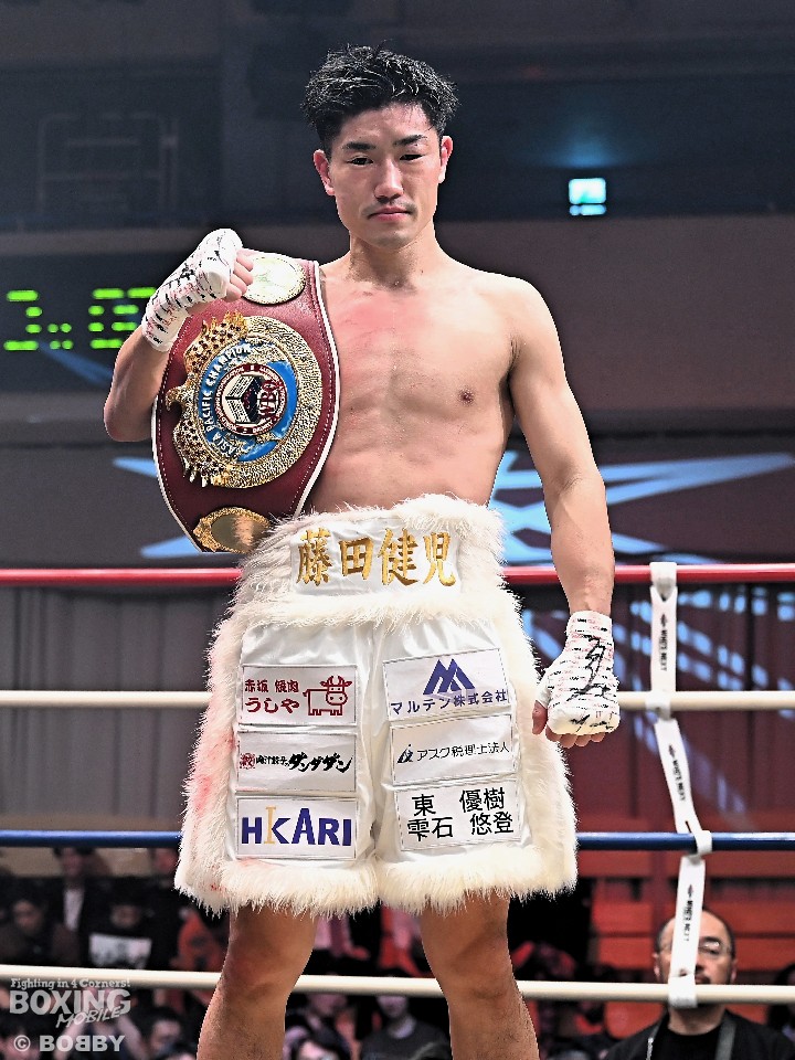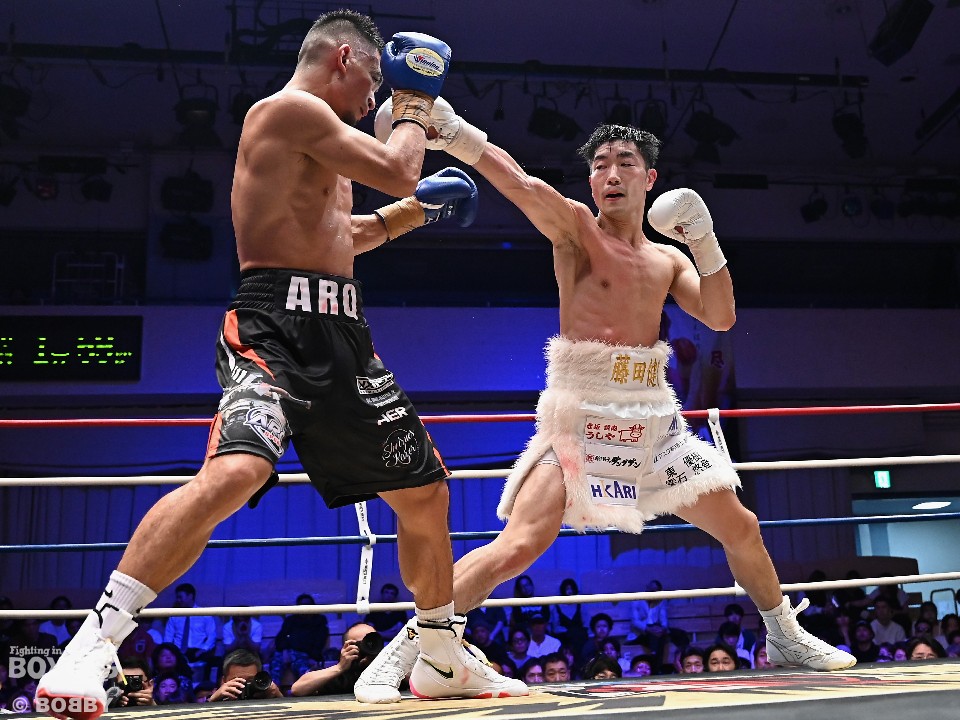 試合:WBOアジアパシフィック・フェザー級王者の藤田の初防衛戦。挑戦者は10戦全勝(1KO)のピアラ。初回、藤田が前の手で揺さぶりをかけながら左ボディストレートを好打。返しの左フックをボディワークで対応した。2回、前に出た藤田だが頭がぶつかり倒れ込んでしまう。レフェリーは藤田に数分間の休憩を与えた。再開後、藤田は打ち下ろしの左で倒すとレフェリーはダウンを宣告した。3回、藤田はステップインから左ボディを軸に攻め立てると上下に散らして攻勢。4回、藤田はキレ味鋭い左アッパーでガクッと腰を沈めさせると打ったら動くを意識。5回、ピアラは伸びのある右オーバーハンドで反撃。ヒヤリとさせたが藤田はリズムを取り戻すとボディにパンチを集めた。しかし、ヒッティングで左目上をカットした。7回、ピアラは軌道を変えながら右を強振。それでも藤田は集中力を切らさず冷静に対応。要所、要所で左ボディストレートを差し込み体力を削った。9回、KOにつなげたい藤田だが、攻めあぐねてしまい右フックを浴びてしまう。偶然のバッティングでピアラは左目上をカット。11回、ピアラは元気が出てきたのか叫びながら右フックを強振。藤田はパンチこそもらわなかったが、手数が少ない。12回、藤田は無理をせずフットワークを駆使しながら距離をキープ。相手の大振りをかわし続けた。藤田は判定勝ちで初防衛に成功した。