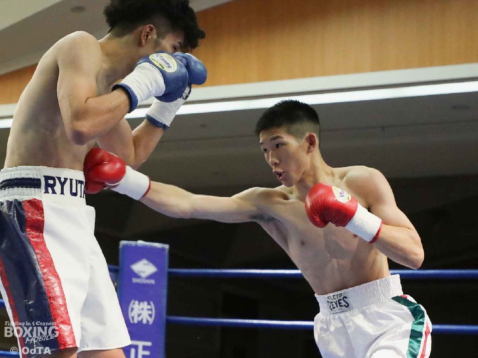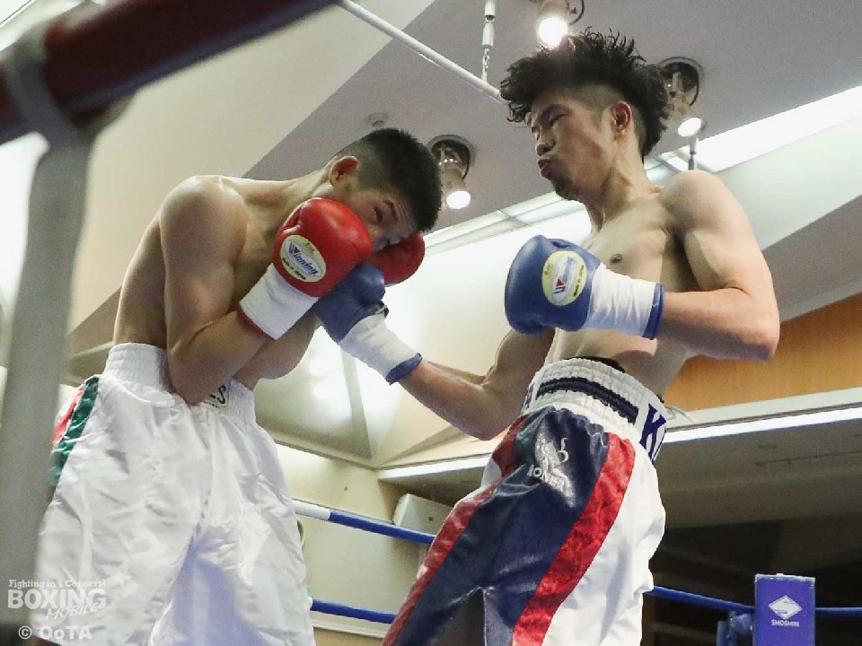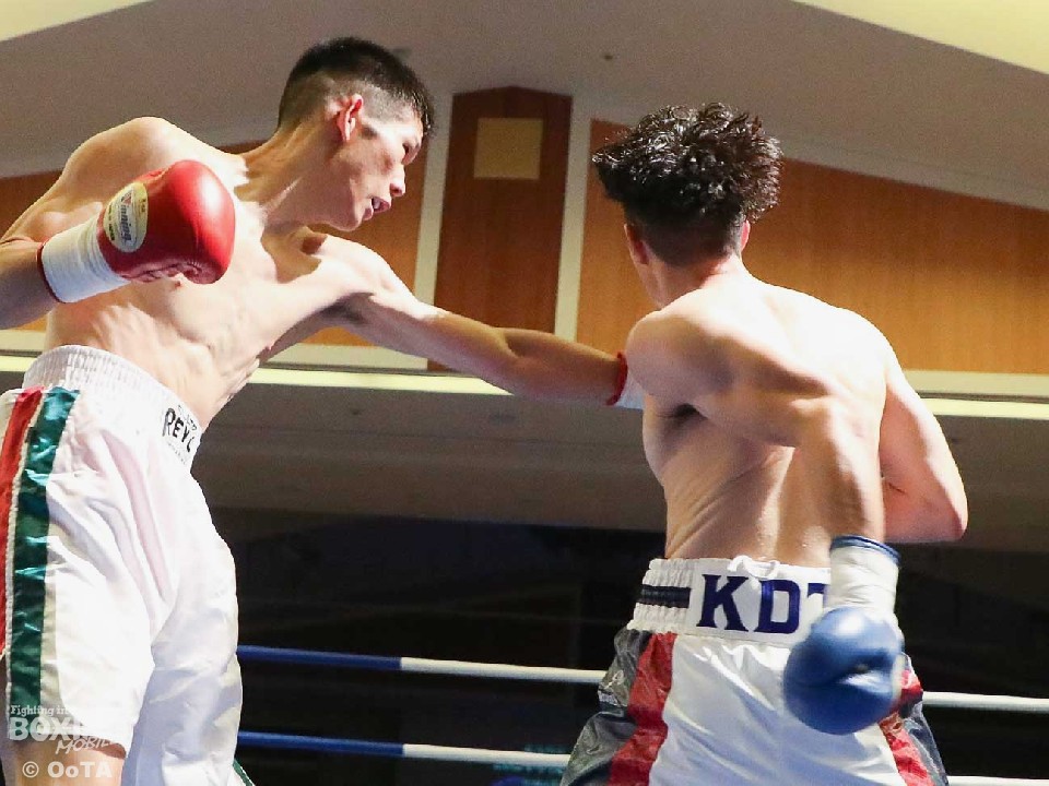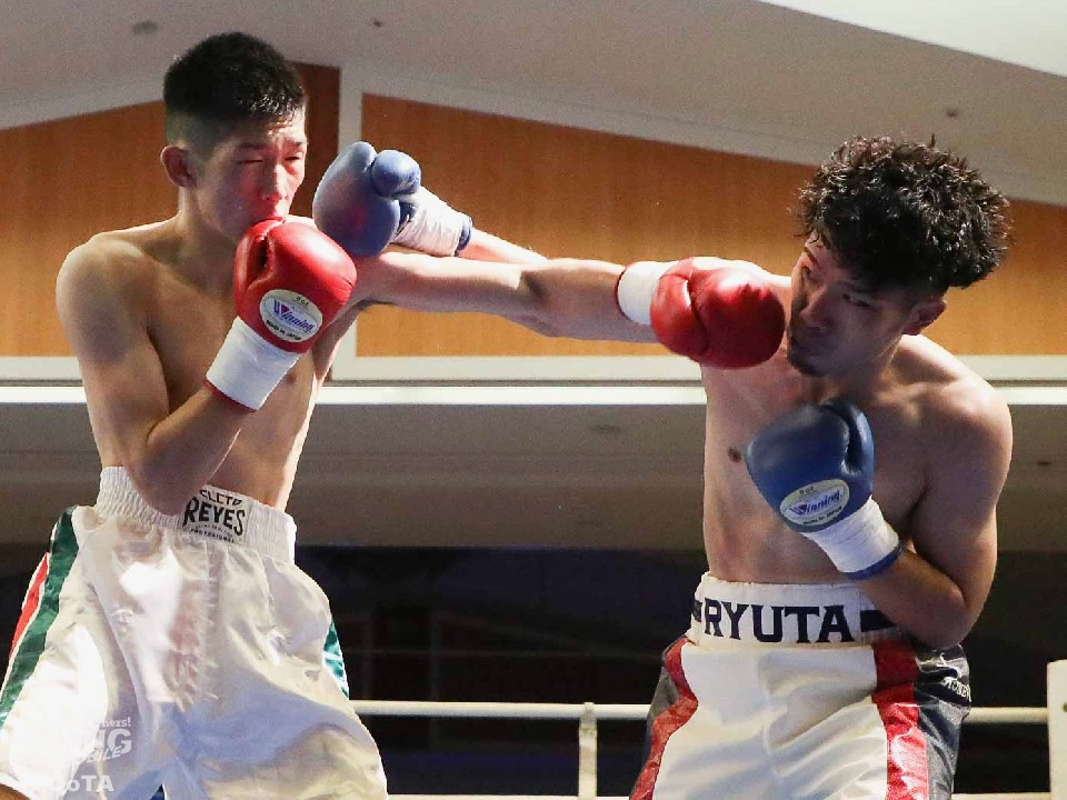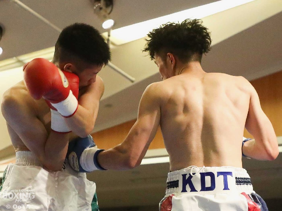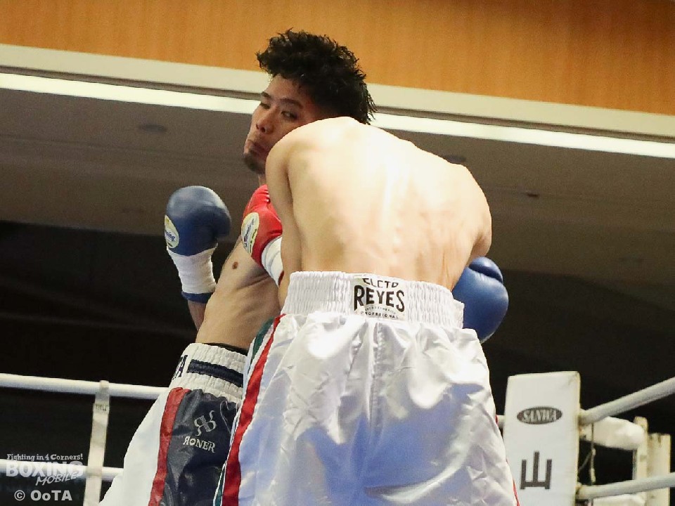 試合:金城がスイッチを織り交ぜながらロングフックで一発を狙うのに対し、竹山はジャブからワンツーを返して丁寧な組み立て。2回、金城は左ボディを突き刺すと大きく振りかぶってアグレッシブな姿勢。3回、金城はボディをしつこく叩くが、ここを耐えた竹山は打ち終わりに右アッパー、左ボディをヒット。4回、竹山は相手の空振りを誘うとワンツー、左ボディを好打。試合終了直前にロープに詰めて連打を浴びせて勝利を決定づけた。