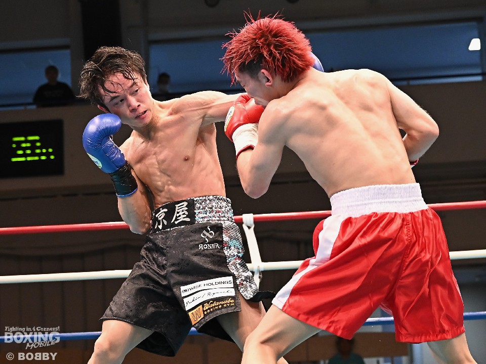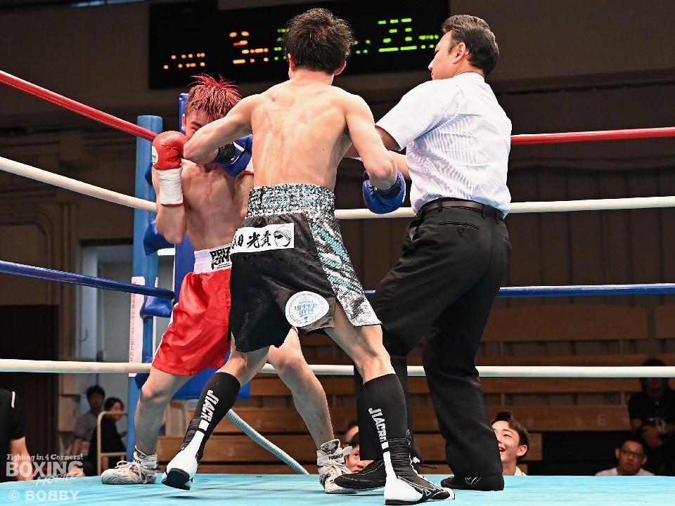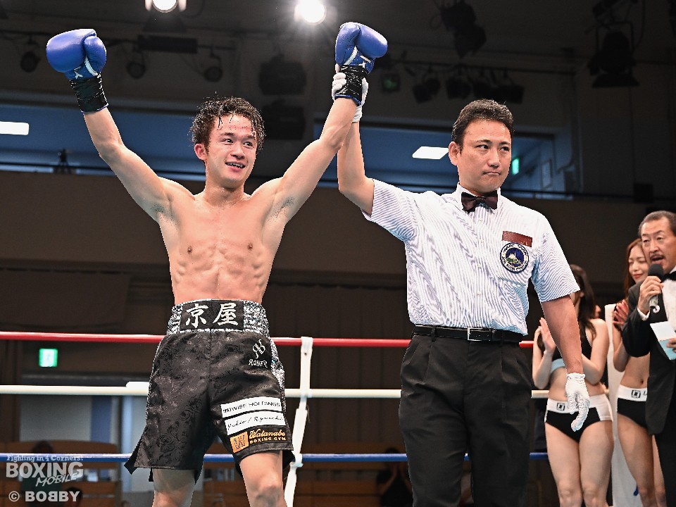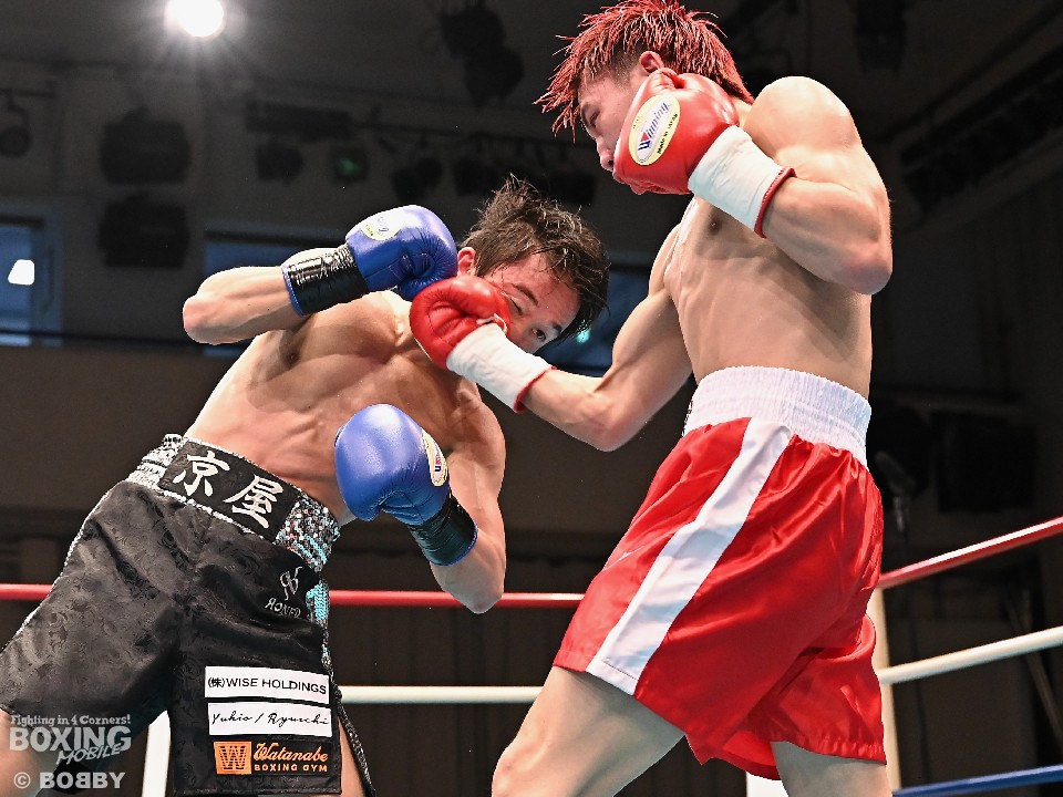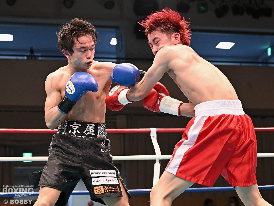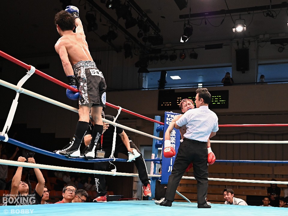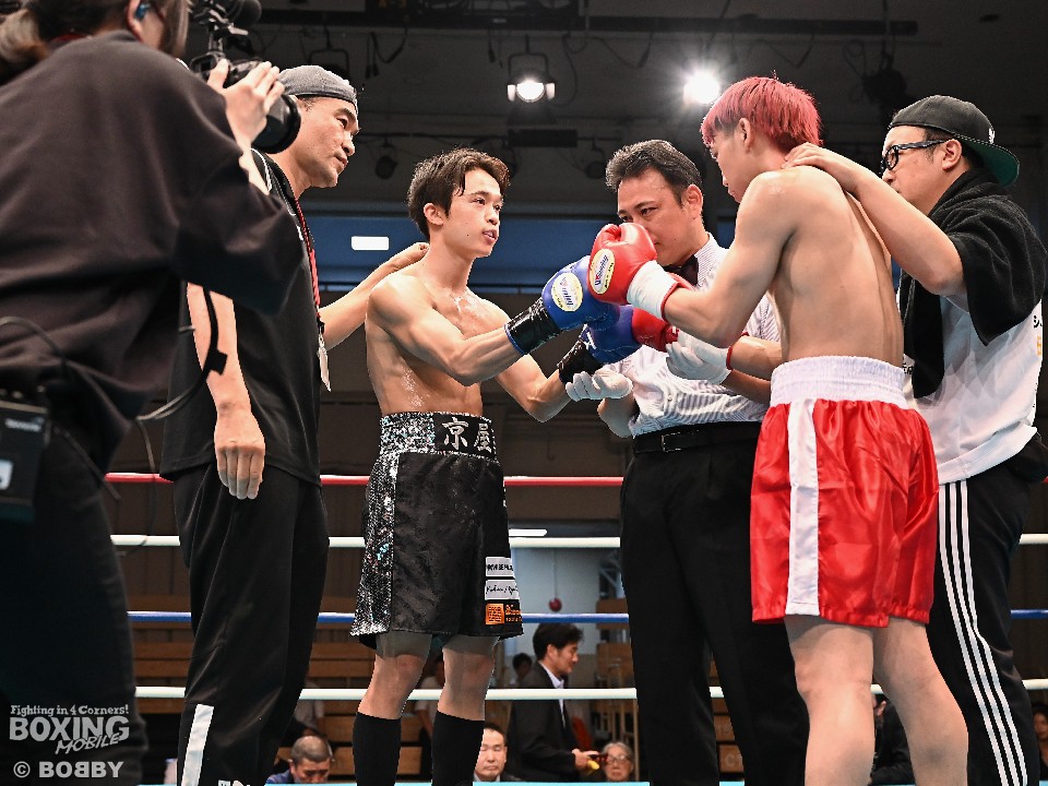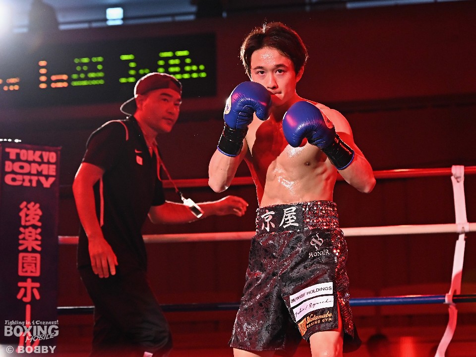 試合:山田がジャブとワンツーで前に出てきたのに対して、京屋は右ストレートと、左ボディに加えて右アッパーをカウンターに合わせた。2回はワンツー、左フックとテンポよく手を出した山田に対して、京屋は左右のアッパーを多用して、アゴを捉えた。左右のボディを叩き合った3回、左フックで顔面を捉えた京屋がパンチをまとめたところでレフェリーが試合を止めた。
