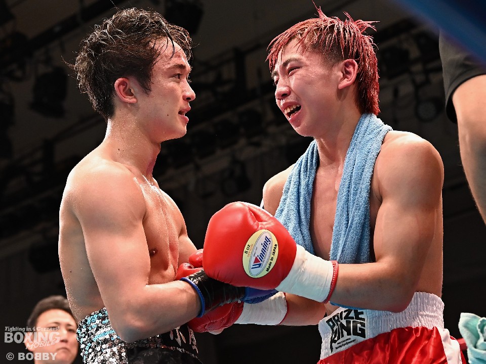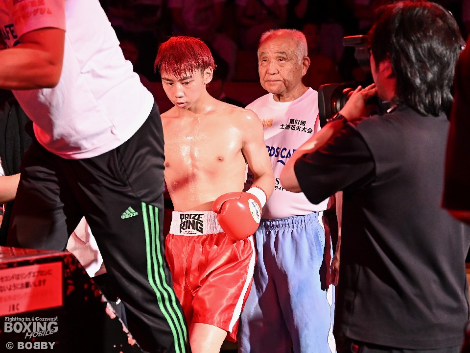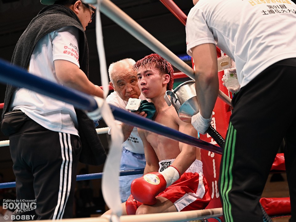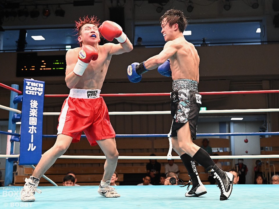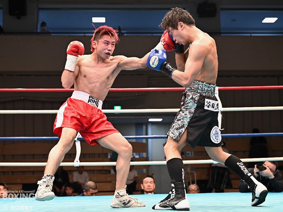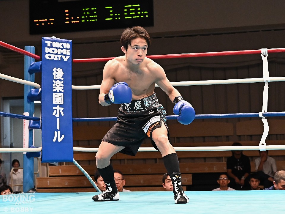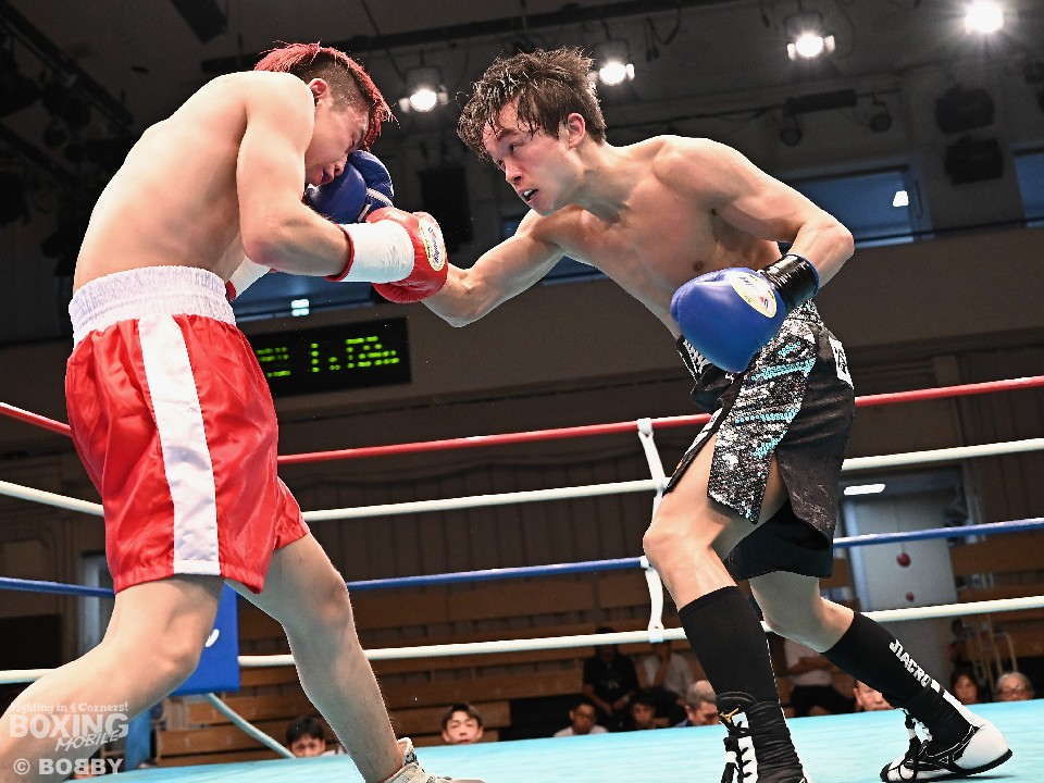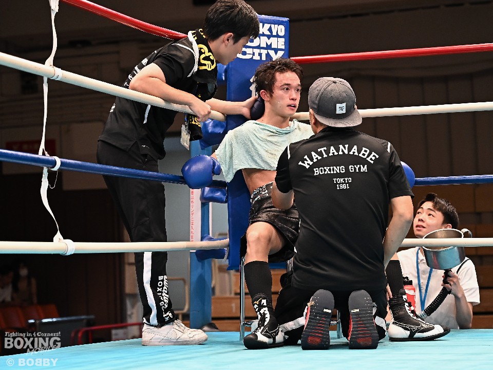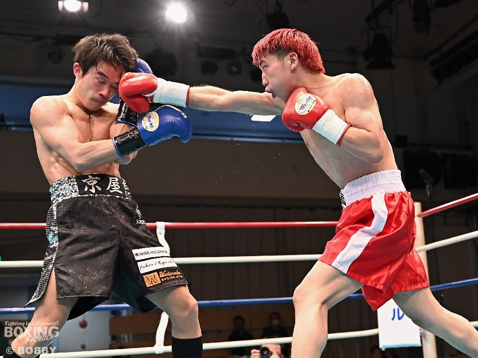 試合:山田がジャブとワンツーで前に出てきたのに対して、京屋は右ストレートと、左ボディに加えて右アッパーをカウンターに合わせた。2回はワンツー、左フックとテンポよく手を出した山田に対して、京屋は左右のアッパーを多用して、アゴを捉えた。左右のボディを叩き合った3回、左フックで顔面を捉えた京屋がパンチをまとめたところでレフェリーが試合を止めた。