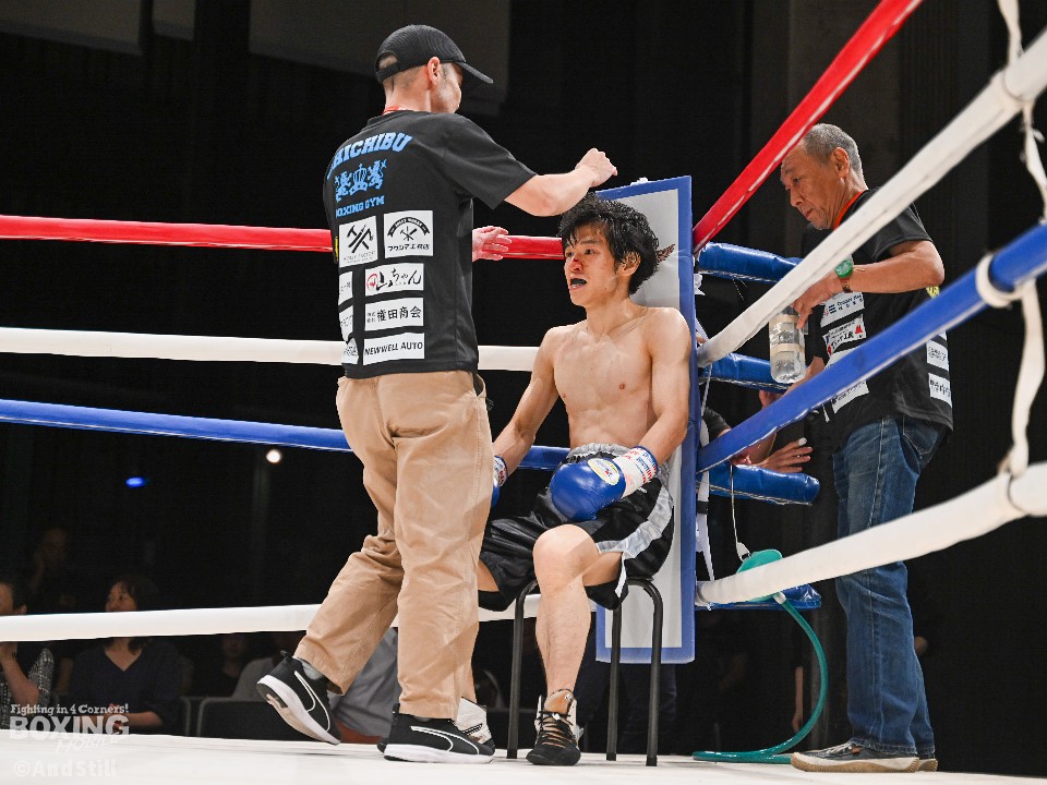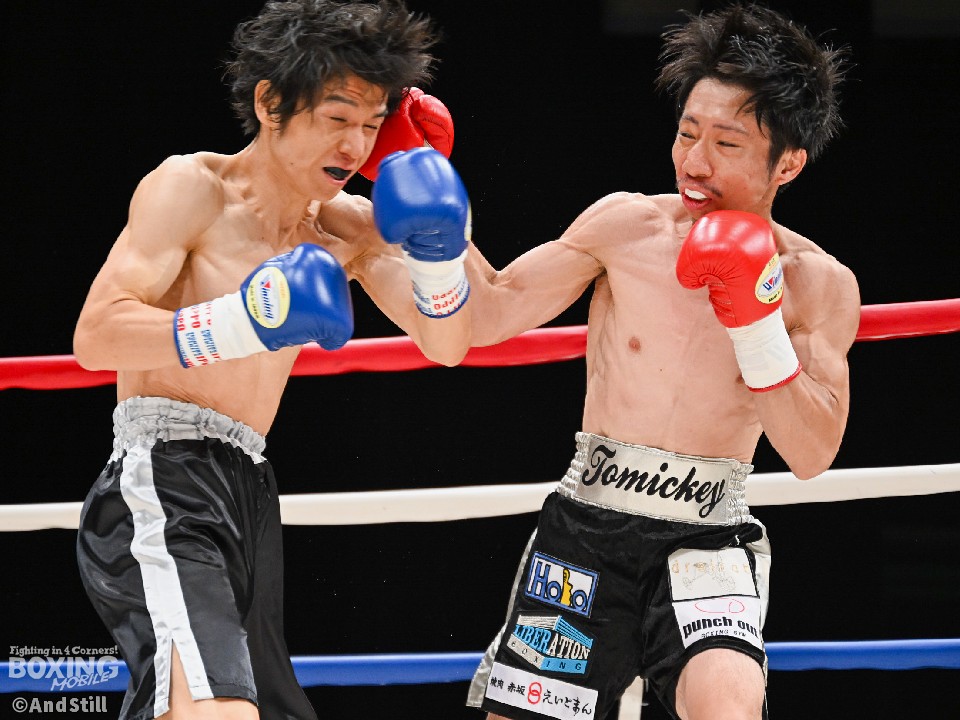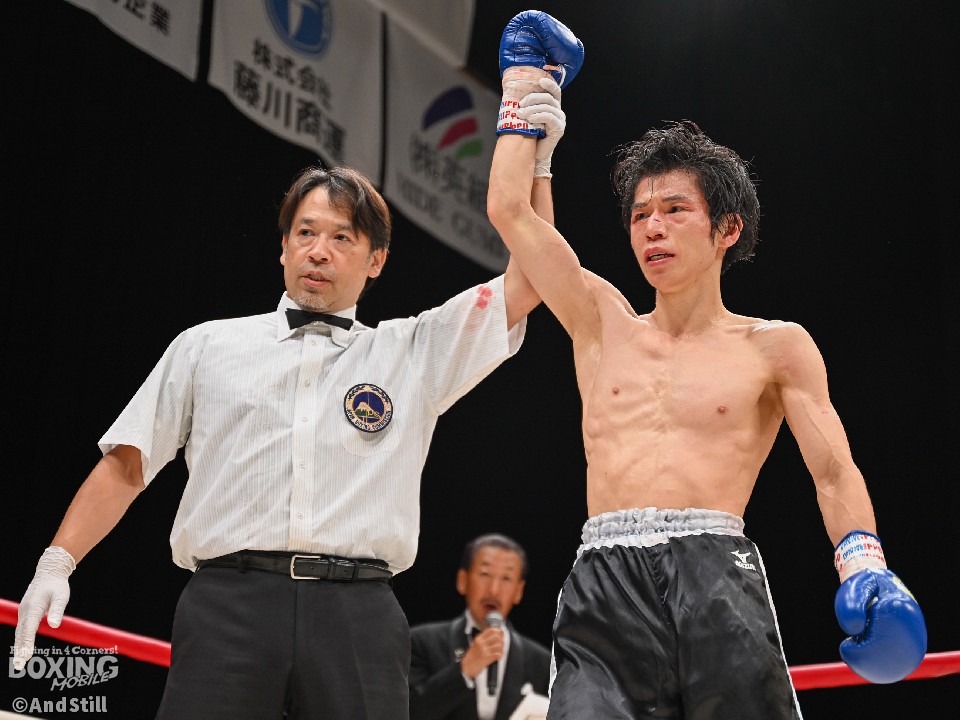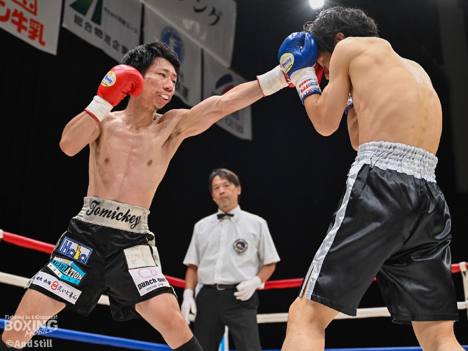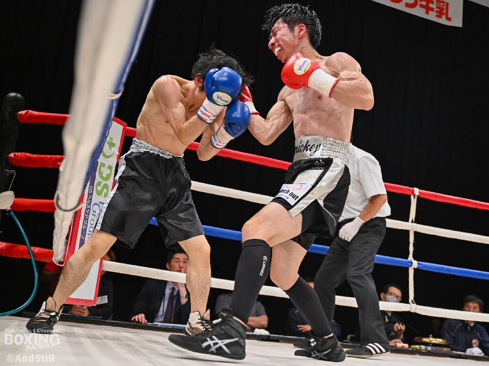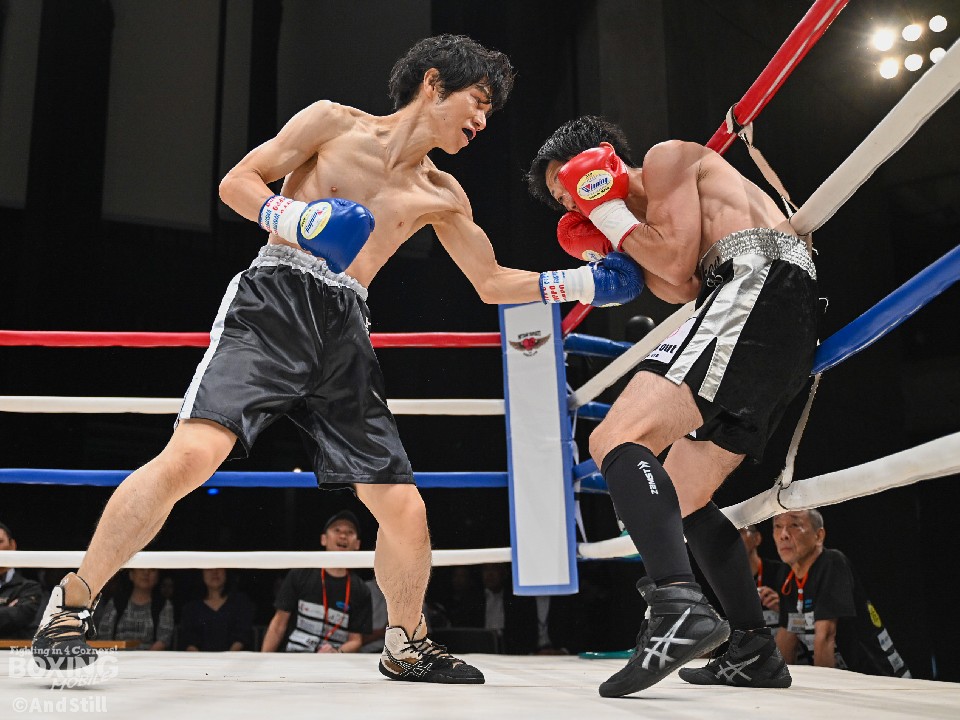 試合:山本がプッシュしながら左右フックで先制攻撃。冨木も真っ向から打ち合うが、勢いを止めるまでには至らず。山本は右クロスでダウンを奪う絶好のスタートを切った。冨木はヒッティングで右目上をカットした。2回、山本はフィニッシュを狙い手数をまとめるが、ここを踏ん張った冨木は左右フックを返して反撃。その後はお互いにフラフラになりながら必死にパンチを繰り出した。このラウンド、山本はパンチを浴びて鼻をカットした。3回、冨木がコーナーに押し込み連打を繰り出せば、ピンチを乗り切った山本も怒涛の反撃。どっちが倒れてもおかしくない総力戦で会場を盛り上げた。3回、山本がスパート!ロープに押し込み左右をまとめると防戦一方になった冨木を見てレフェリーが割って入った。激戦を制した山本は「やっと終わった!」と安堵の表情を浮かべた。