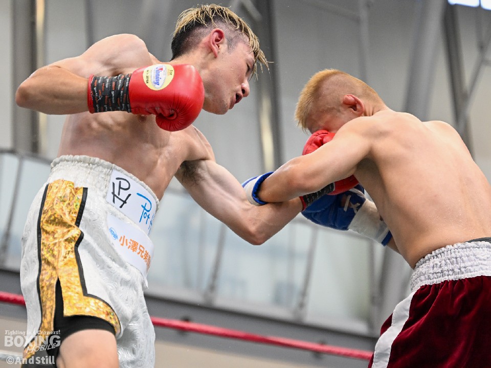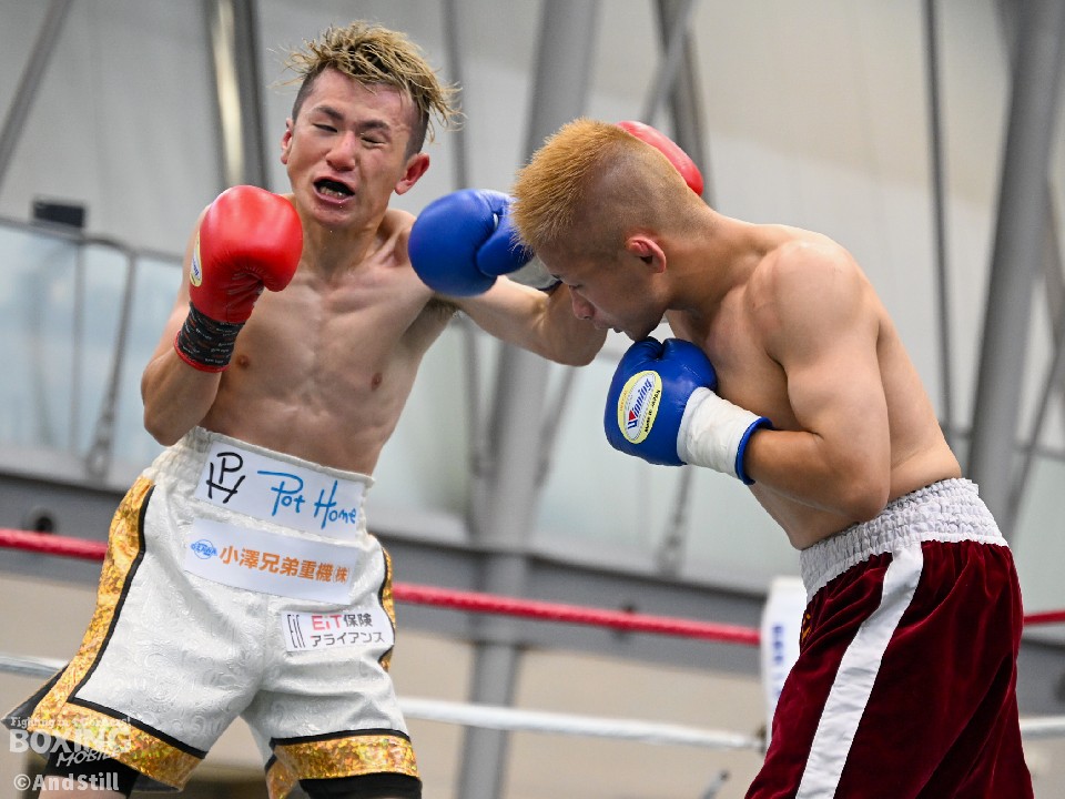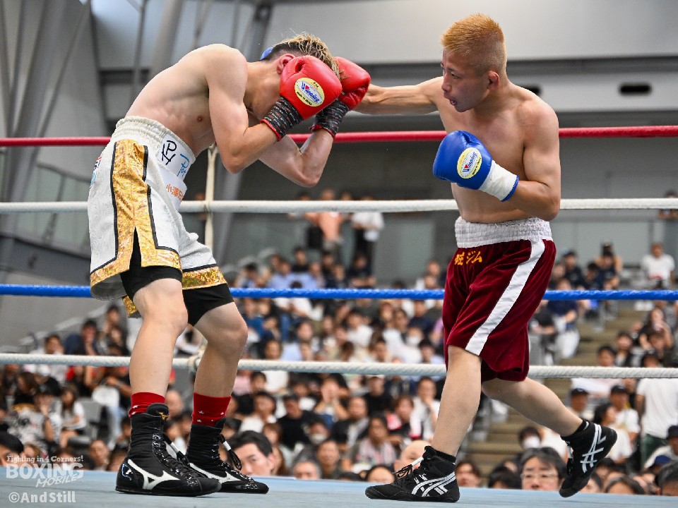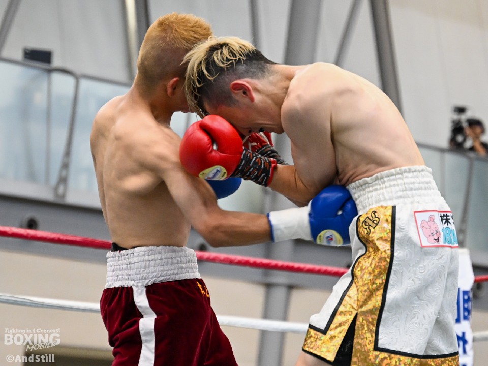 試合:赤塚と根岸のミニマム級の金髪同士の一戦。初回、お互い近い距離で上下にパンチを振る。その中で青コーナー根岸がアッパーをねじ込み、赤コーナー赤塚がシャープなジャブからボクシングを組み立てる。中盤は赤塚が手数を増やし攻勢を強める。根岸も左右フックで応戦。お互い頭をつけ削り合いの消耗戦に突入。最終ラウンドもお互い勝利を掴むため気力を振り絞り打ち合う。盛り上がる歓声の中、終了のゴングが響いた。