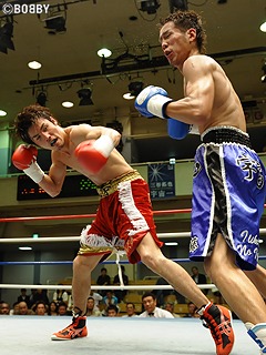 試合:立ち上がりの硬い谷口に対し、速いジャブでペースを作る三谷。フェイントを見せながら、リズムをつくる三谷に対し、突破口を見いだすべく、飛び込みながら右ボディ、ガードの上から右フックを放ってくる谷口。とにかく距離を詰めて打ち合いたい谷口は上下にパンチを放つが、三谷もリズムを崩さず、カウンターを狙うなど、 両者譲らず。中盤、単発で終わってしまう三谷に対し、体ごと預ける勢いで左右フック、ボディ、アッパーと打ち込む谷口。リードが出なくなった三谷は接近戦に持ち込まれ、低い位置でジャブ、ワンツーを受ける。体をうまく入れ替えアッパー、プレッシャーをかけながら相手の出てくるところをカウンター狙いと最後まで手を出 す三谷だが、8Rフルラウンドの打ち合いを制したのは、パワーのあるパンチを的確にヒットさせ、見栄えもよかった谷口に(77-76,77-76,78-75)の軍配が上がった。