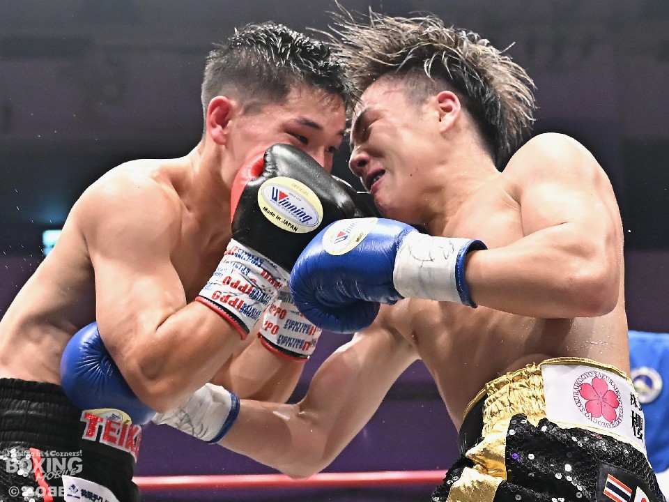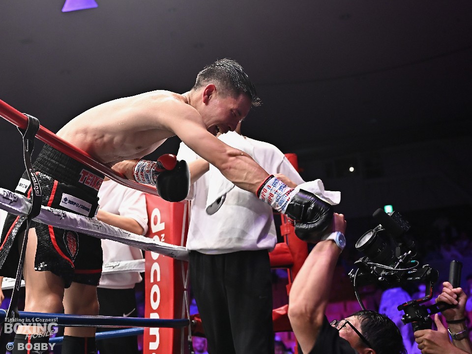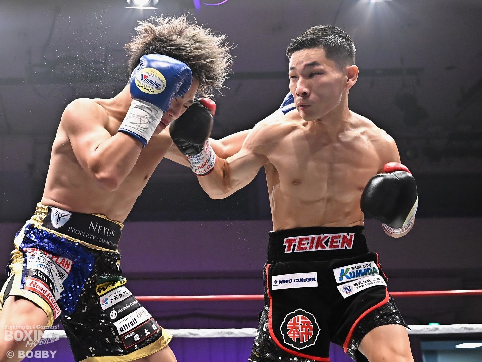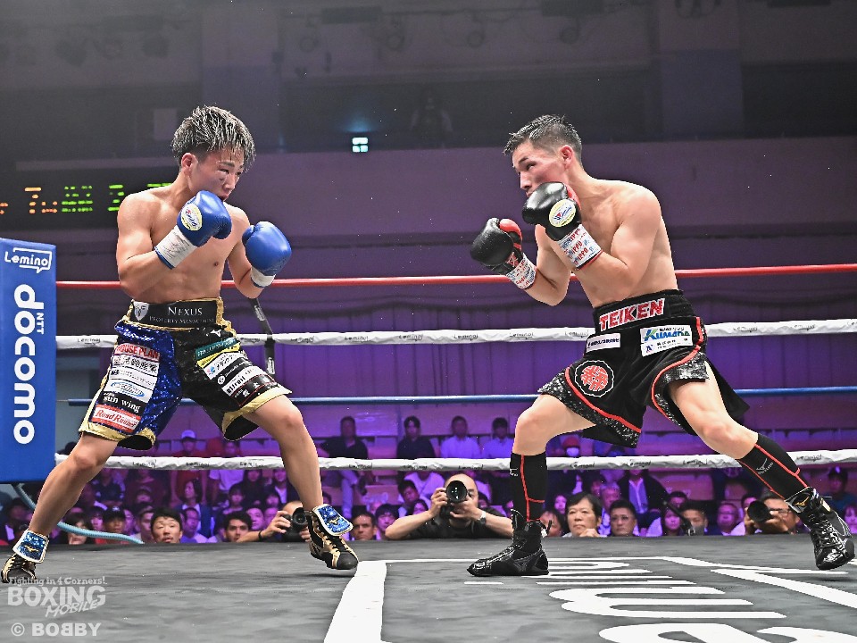 試合:日本ミニマム級王座を懸けて、3度目の挑戦の森とタイトル初挑戦の松本が対峙した。サウスポー松本がワンツー、右アッパーを好打。スピードを活かして先手を奪うことに成功。2回、森は頭を振りながらボディに狙いを定めて反撃。しかし、ラウンド終盤、松本は左カウンターでペースを渡さず。偶然のバッティングで森は右目上をカット。3回、森が距離を潰して右ボディを突き刺すと回転力を上げた。4回、松本は足を使いながら右フック、ワンツーをヒット。打ったらすぐに動き見栄えの良さをアピール。5回、松本は左アッパーで顔を跳ね上げるとアウトボクシングでポイントを加点。前半終了時の公開採点は、49-46×1、50-45×2で松本がリード。6回、松本は打ったらサイドに回り込んでリズム感のある攻撃を披露。森はヒッティングで左目下を腫らした。7回、松本は右フックを合わせるとキャンバスに手を突いた森を見てレフェリーはダウンを宣告。再開後、左ストレートで顔を弾いたところでレフェリーが割って入った。松本が4戦目で日本チャンピオンに輝いた。