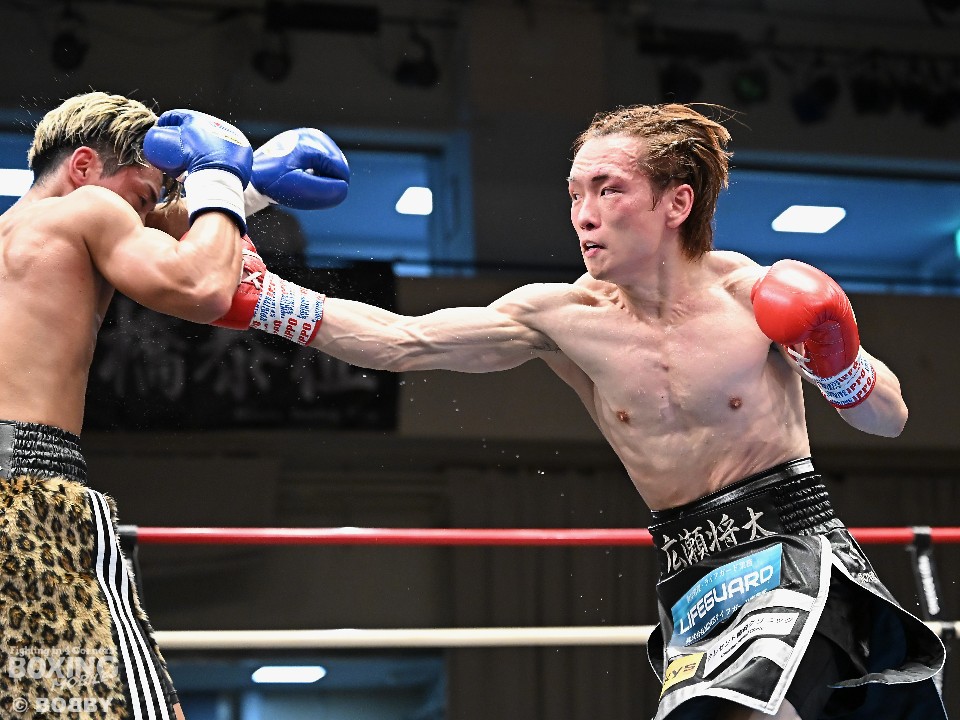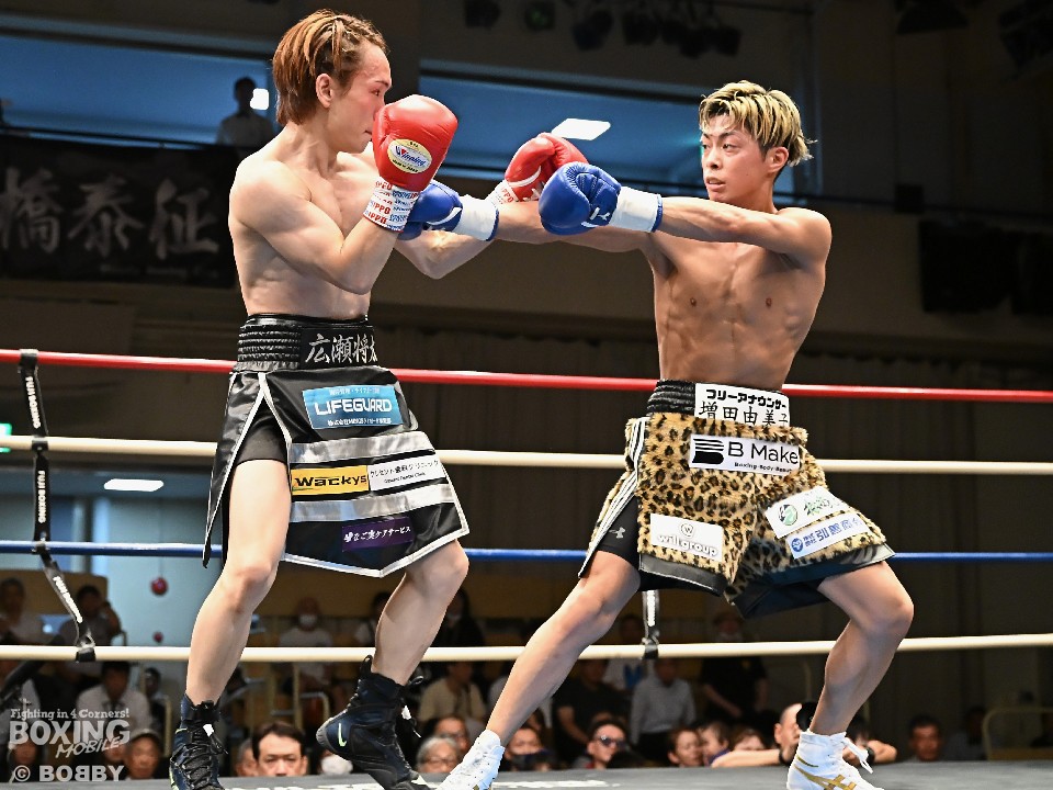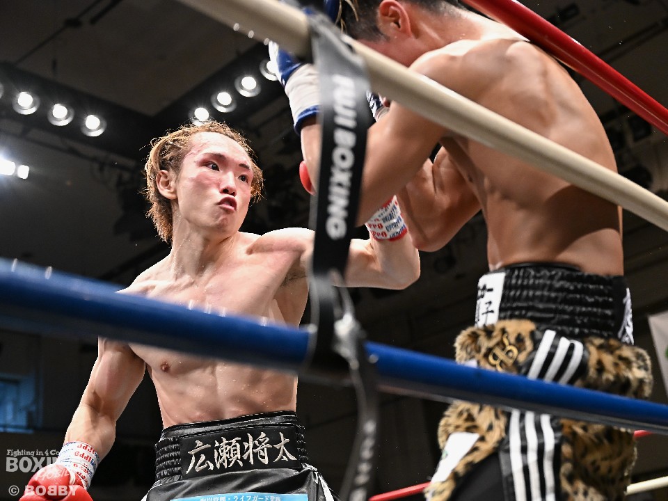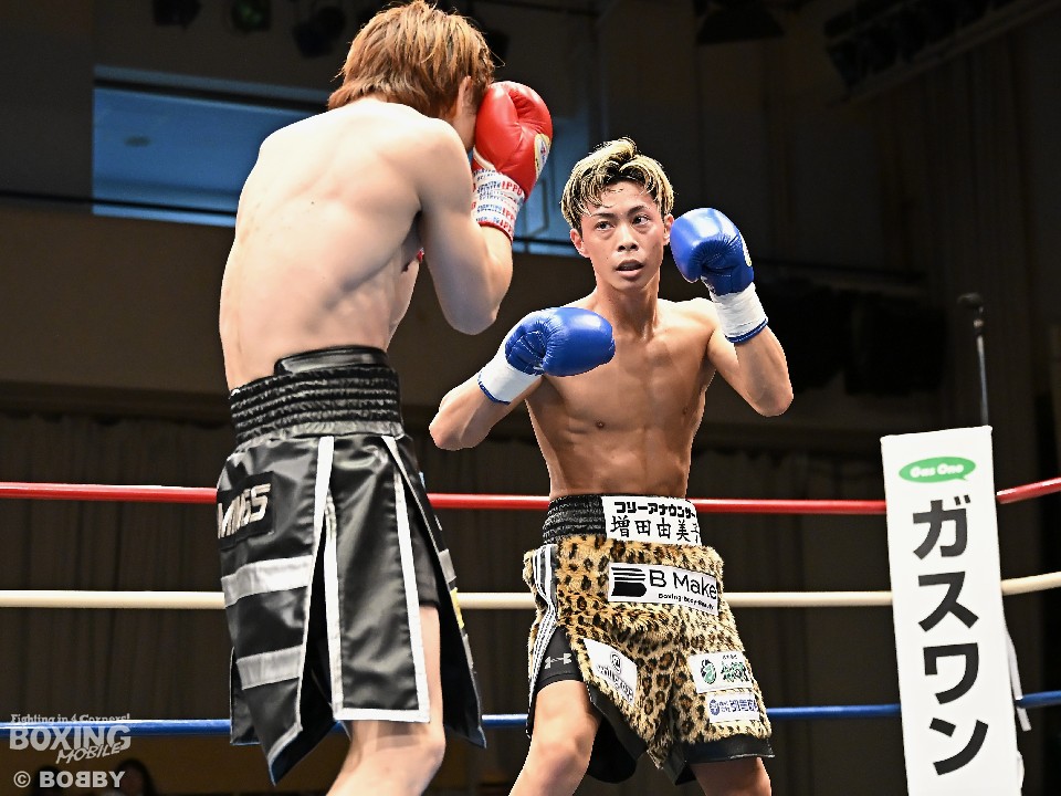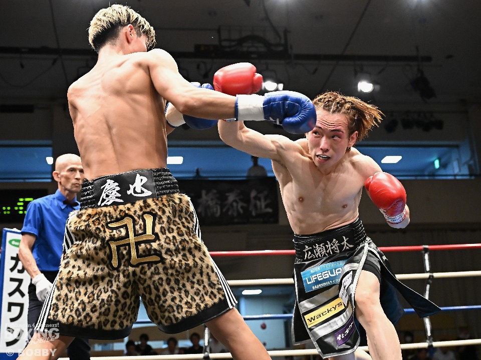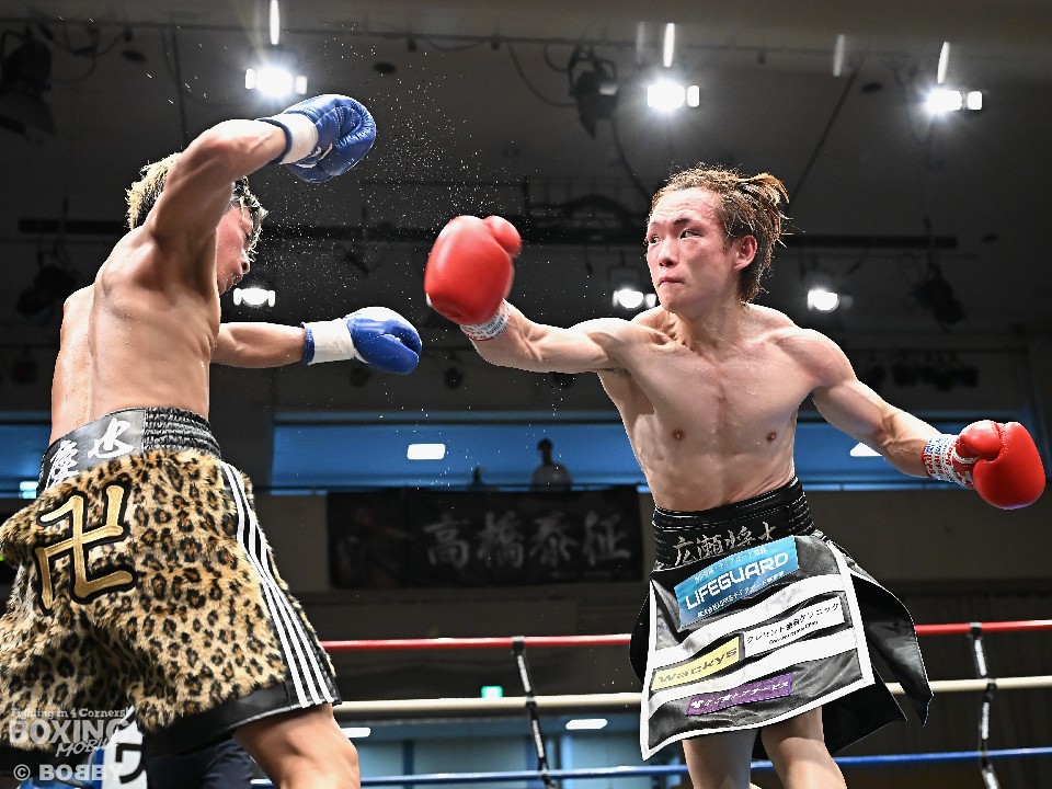試合:広瀬が距離を潰して左右フックで先制攻撃。先手を取られたサウスポー越田だが、左ストレートで迎え撃った。2回、越田は相手の右フックを警戒しながらジャブからワンツーにつなげてアウトボクシングを展開。3回、広瀬は左フックを強振。グイグイと攻め立てたが、越田の左ショートが火を噴きダウンを演出。4回、越田はワンツーで2度目のダウンをゲット。再開後、足を使いながら決定打を避けた。2年ぶりのリングに上がった越田がB級昇格を決めた。
