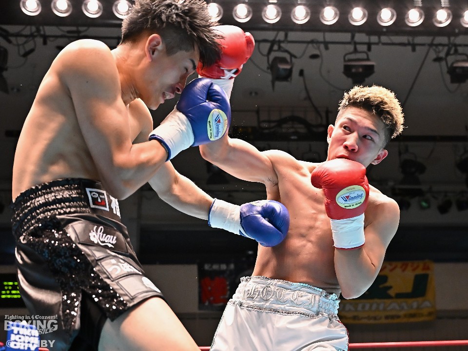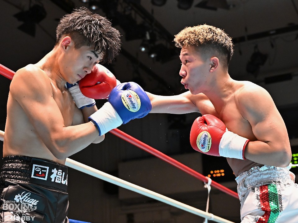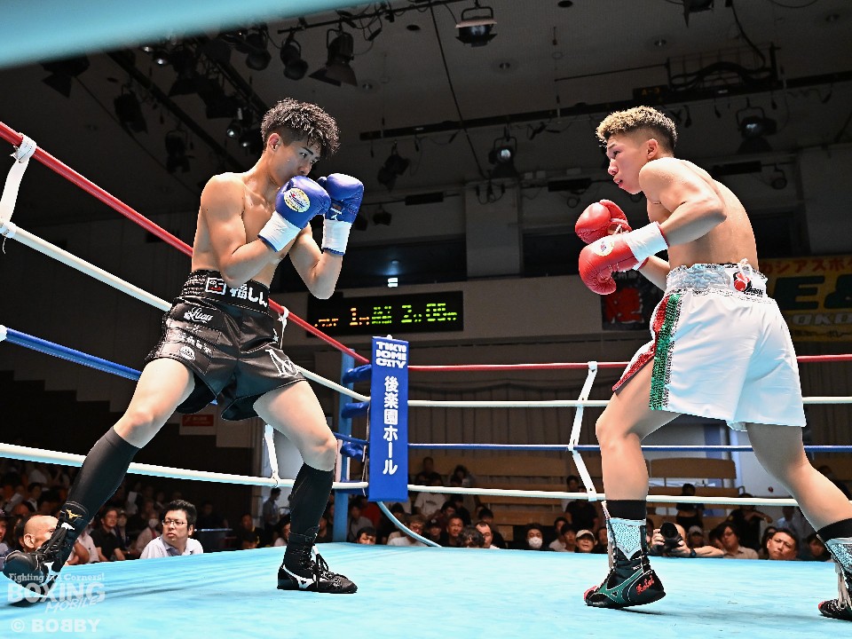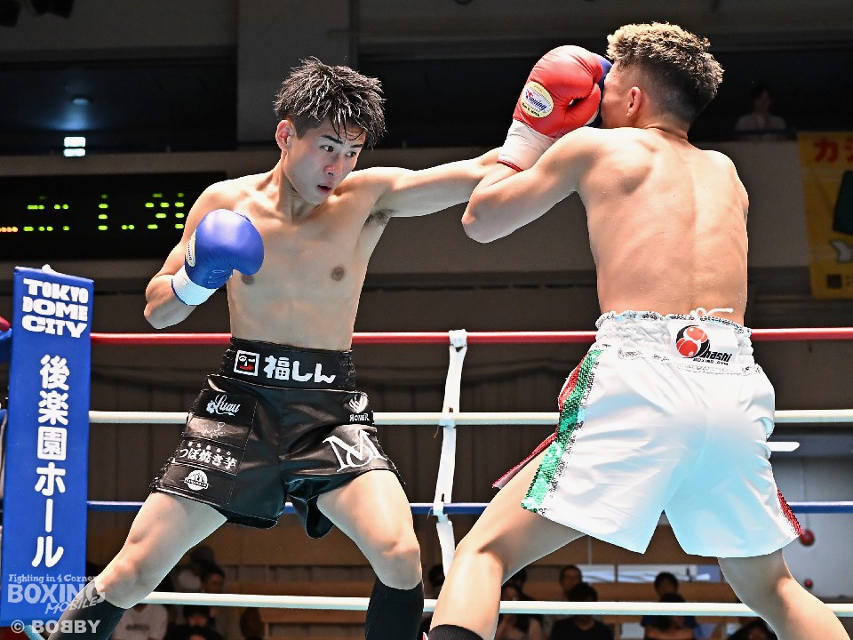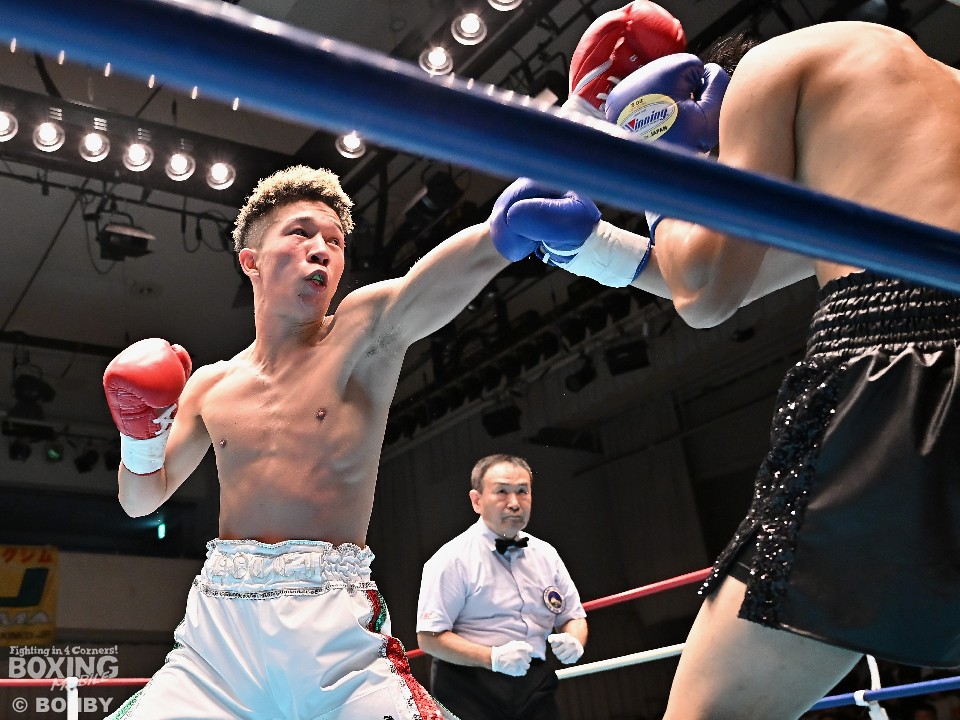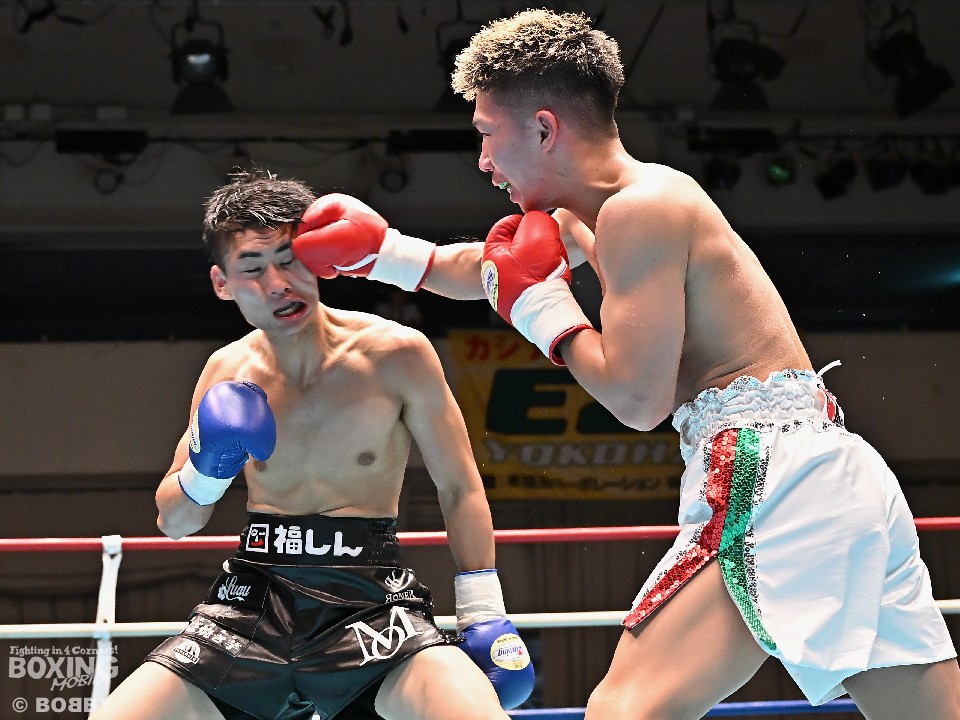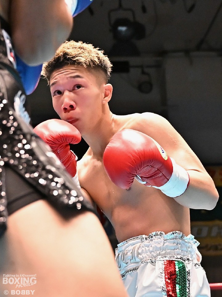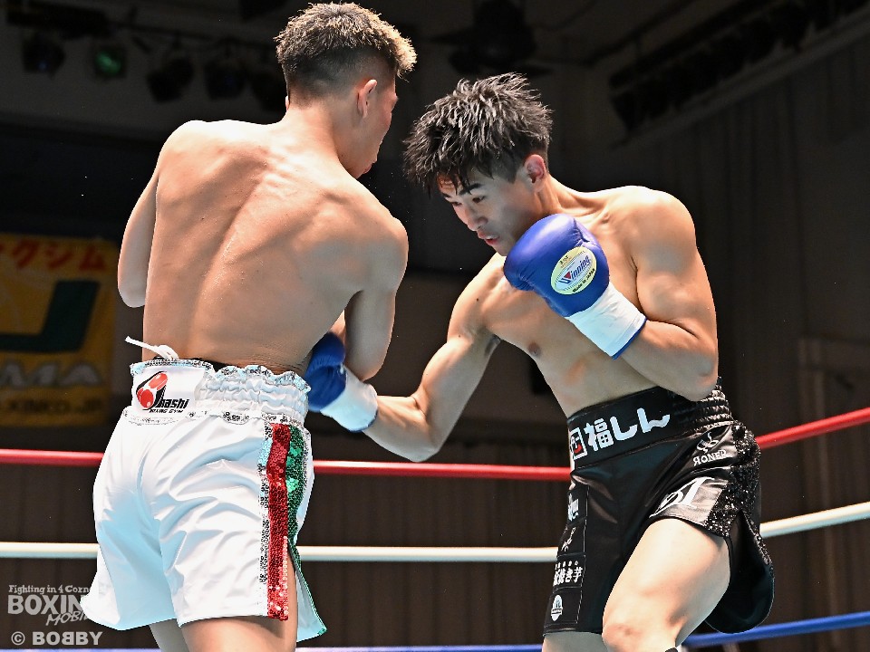 試合:大橋がシャープなジャブからツーワンで顔を弾いて先制。布袋は回転力を活かした連打で強気の姿勢を貫いた。2回、布袋はジリジリと距離を詰めてボディに的を絞るが、大橋はワンツーで顔をのけぞらせるとラウンド終盤には左ボディで一瞬、動きを止めた。3回、接近戦でボディの叩き合い。意地と意地がぶつかった。4回、大橋は右ストレートで押し込むとメリハリのある攻撃で攻勢。布袋も気持ちを切らさなかった。激戦を制した大橋が全勝をキープした。