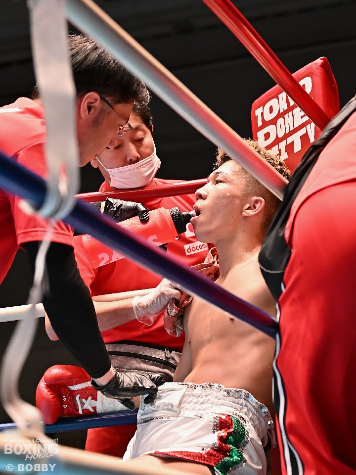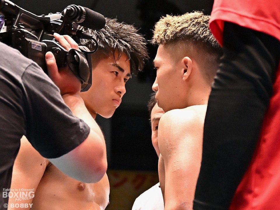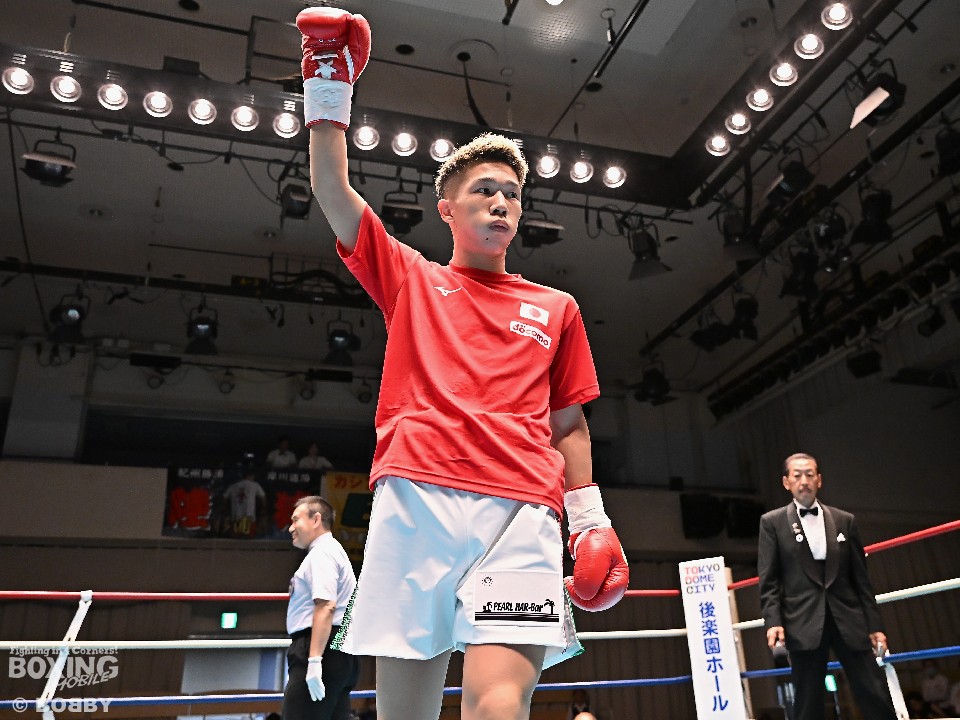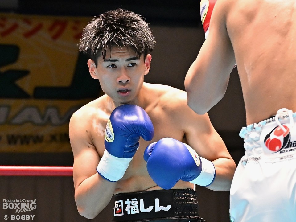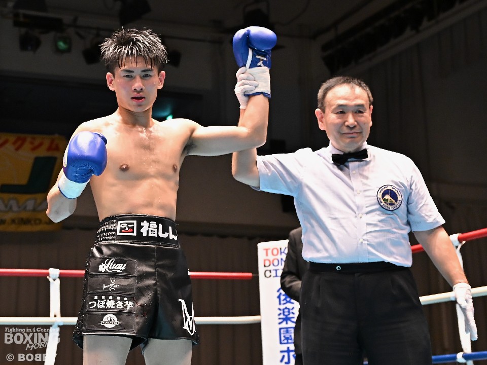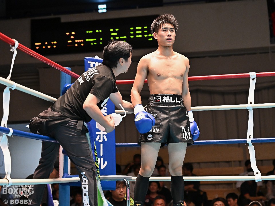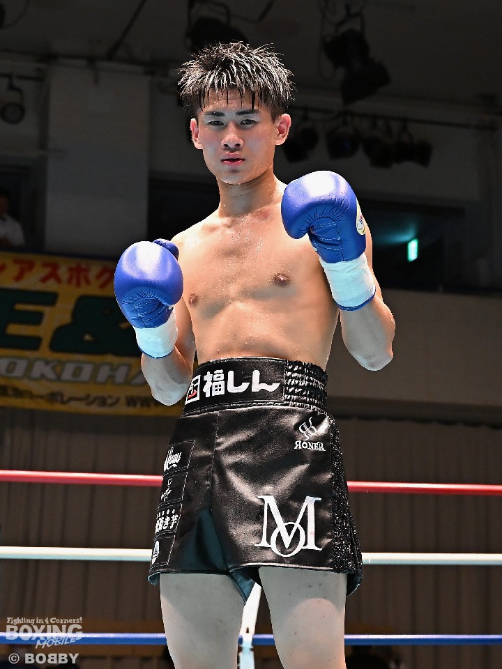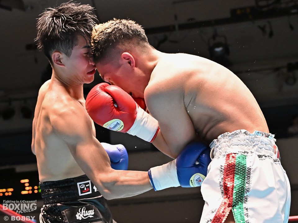 試合:大橋がシャープなジャブからツーワンで顔を弾いて先制。布袋は回転力を活かした連打で強気の姿勢を貫いた。2回、布袋はジリジリと距離を詰めてボディに的を絞るが、大橋はワンツーで顔をのけぞらせるとラウンド終盤には左ボディで一瞬、動きを止めた。3回、接近戦でボディの叩き合い。意地と意地がぶつかった。4回、大橋は右ストレートで押し込むとメリハリのある攻撃で攻勢。布袋も気持ちを切らさなかった。激戦を制した大橋が全勝をキープした。