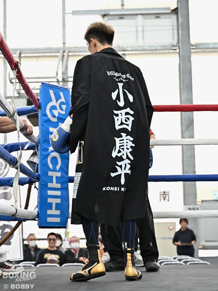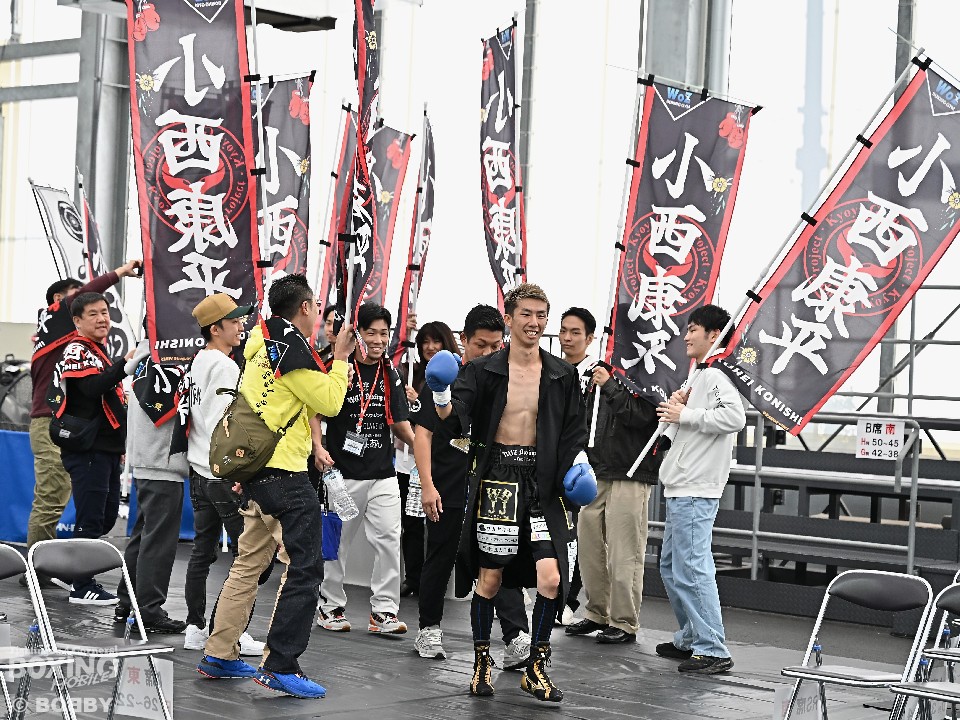 試合:ジャブを突き、間合いを探る両者、小西がジャブから右フックにつなげると川上は左右フックからボディストレートを突き刺した。2回、ジャブから丁寧に組み立て、右ボディストレートをヒットさせた小西に対し、川上はパンチを上下に散らし、踏み込んで右クロスをヒット。3回、ワンツースリーのコンビネーションからの右を好打した小西に対し、川上は打ち終わりの左フックを狙った。4回、ジャブから右につなげ、好調なスタートを切った小西だったが、川上の左ボディフックで一瞬動きを止めた。ノーモーションの右をヒットさせた小西に対し、川上は右クロスを好打した。