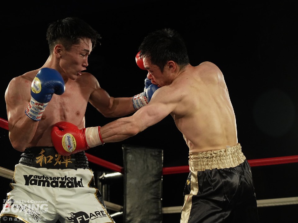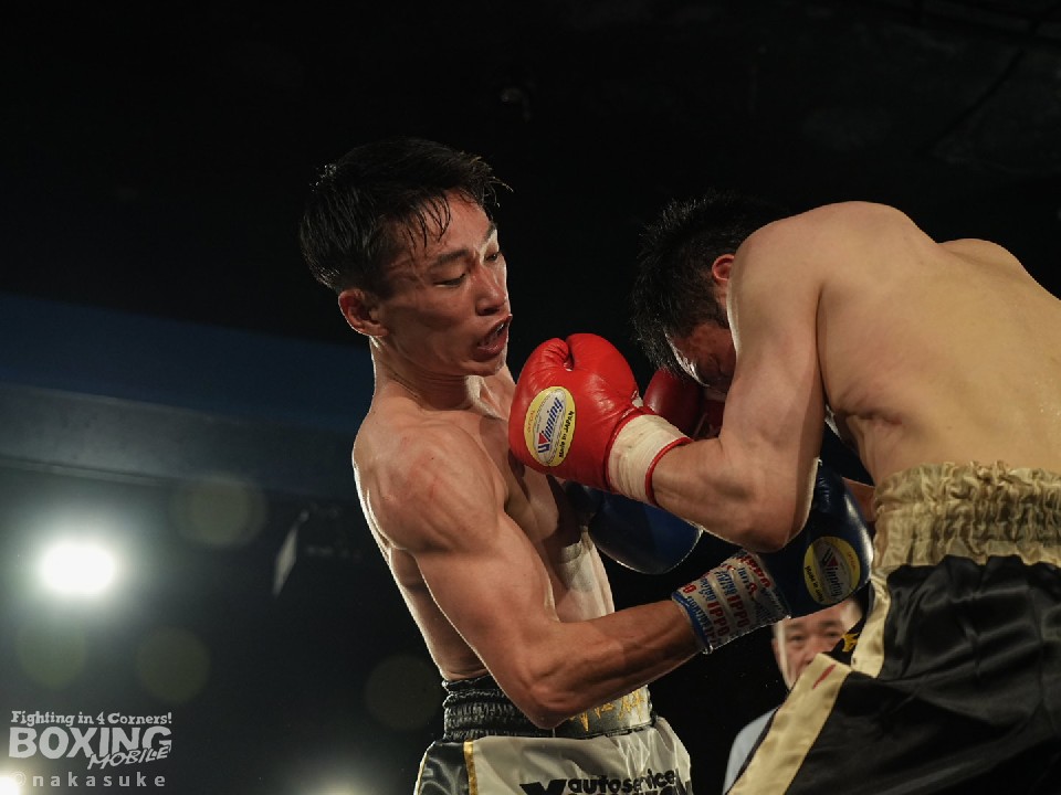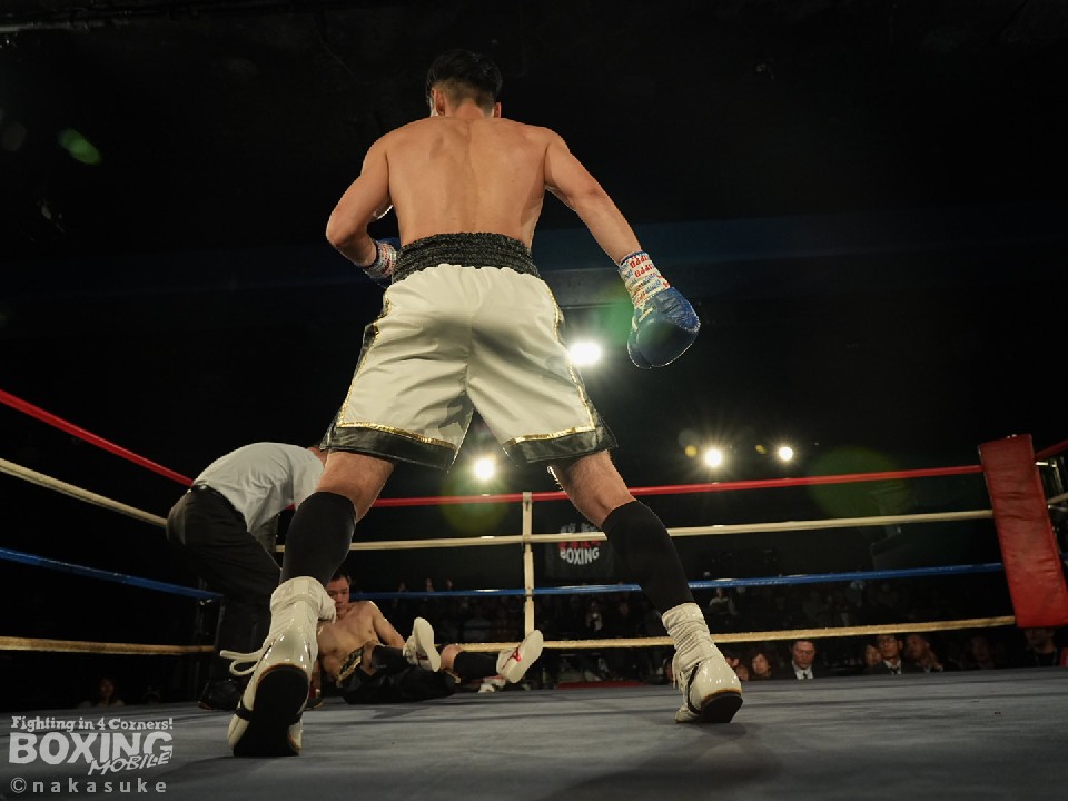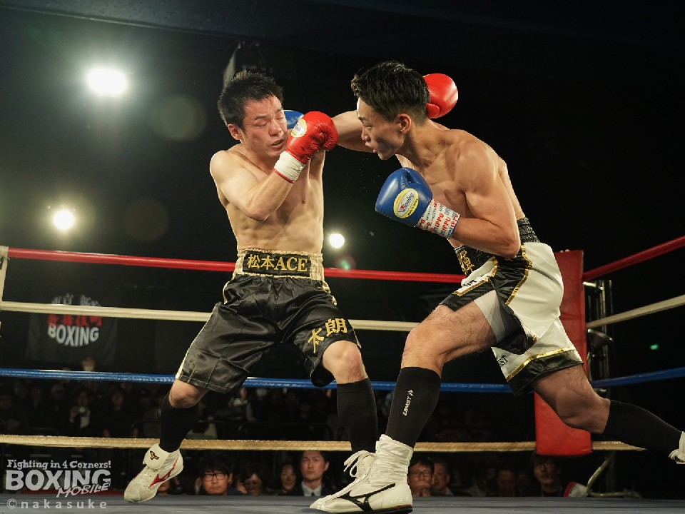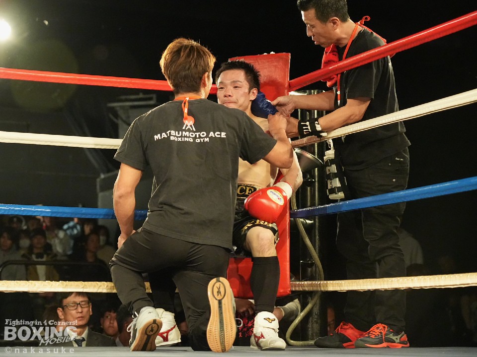 試合:佐藤が前後を意識しながらジャブからワンツーで先制のダウンをゲット。10年半ぶりにカムバックした望月はボディにパンチを返すが、守勢を強いられた。2回、佐藤は右アッパー、ワンツーを再三ヒット。望月は被弾しながらも粘り強く食い下がった。3回、激しいパンチの応酬を見せる中、佐藤が右ショートで2度目のダウンを演出。ファイティングポーズを取った望月に対し、レフェリーは一度は続行したが、目を見て試合をストップした。4勝目を挙げた佐藤がB級昇格を決めた。