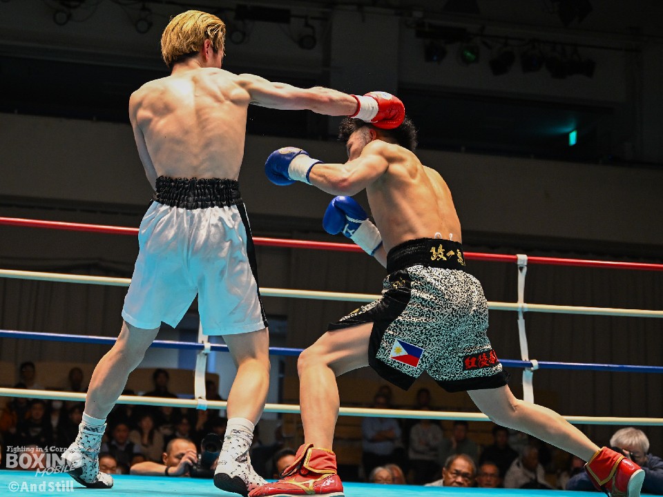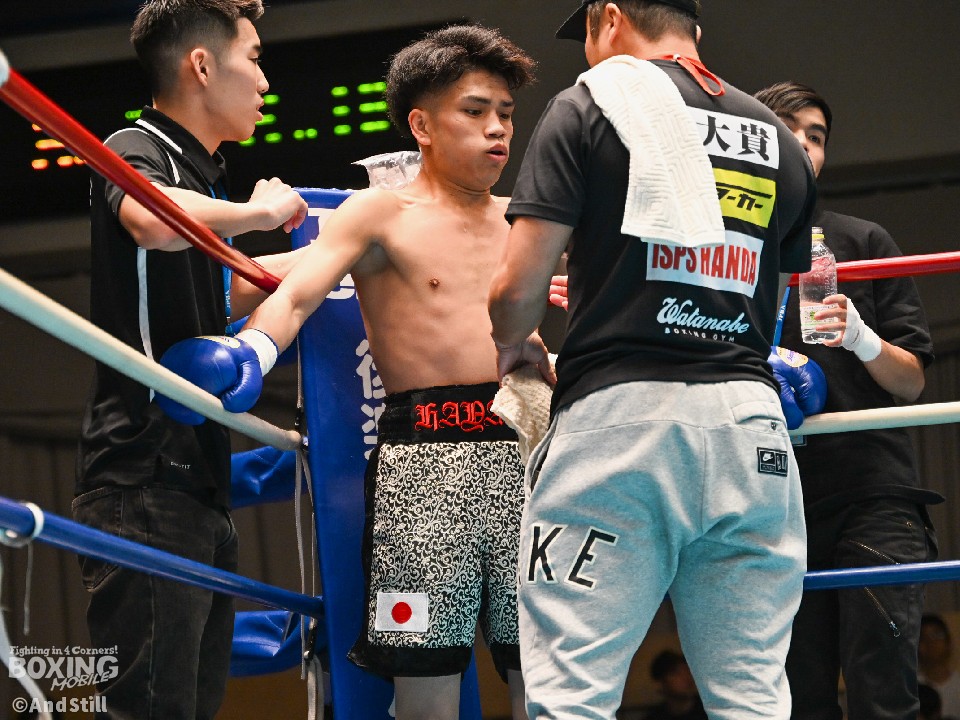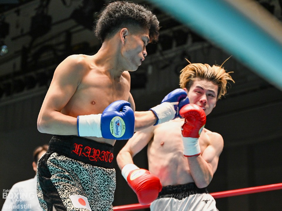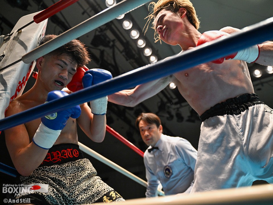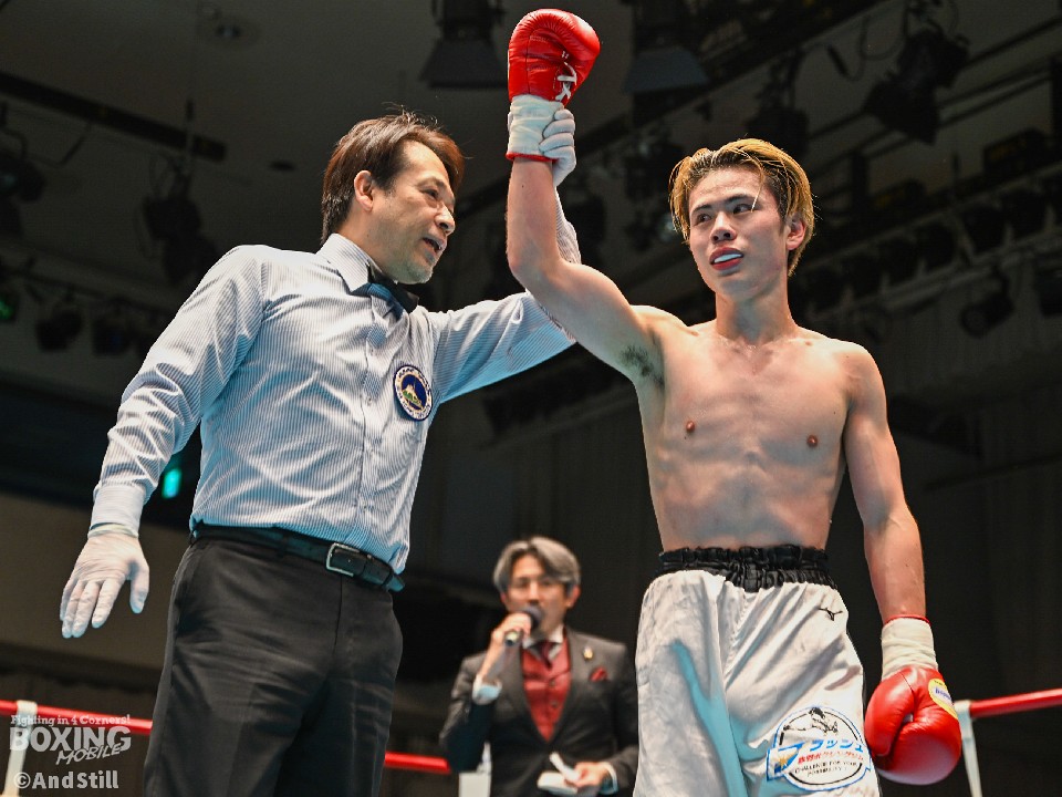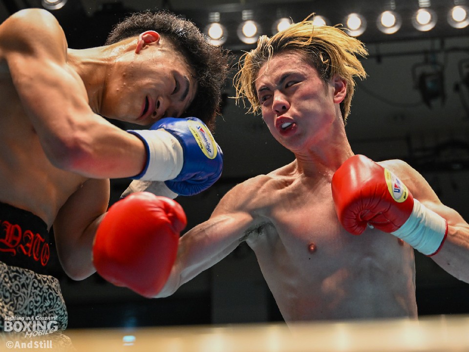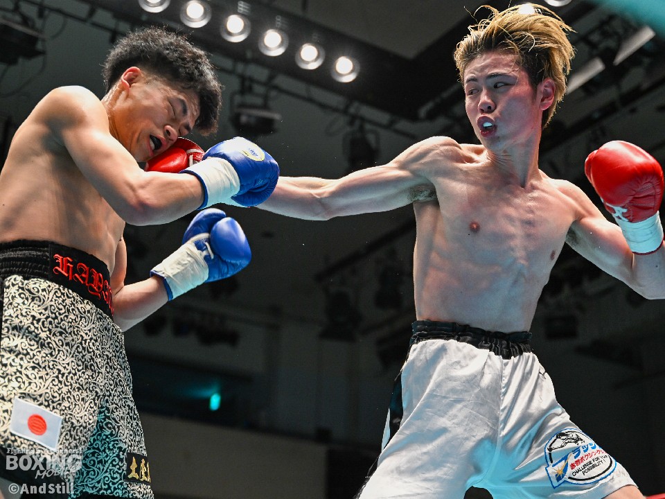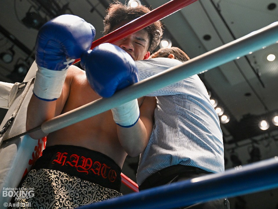 試合:菊地がステップを刻みながらワンツーで先制。サウスポー川島は左カウンターで腰を沈めさせて対抗。2回、菊地はプレスをかけながらワンツー左ボディで積極的な攻撃を展開。左ストレートを返した川島だが後手に回った。3回、川島は右ボディから右フックを好打すると右フックを引っかけてダウンを先取。勝負が決まったのは4回。川島は右ボディを突き刺しコーナーに追い込むとパンチをまとめてレフェリーストップに持ち込んだ。