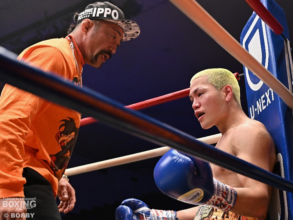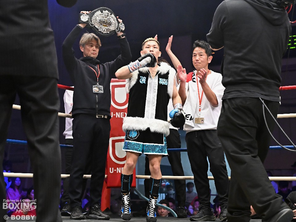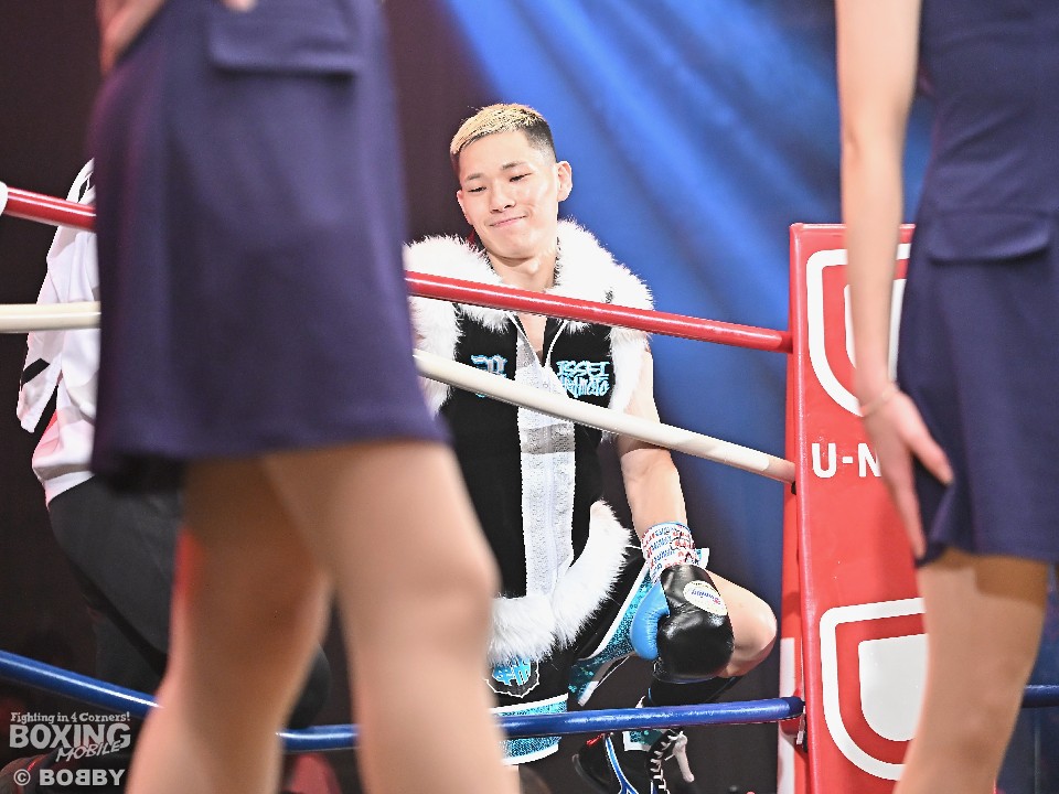 試合:日本ミニマム級王者の松本がランキング1位の岡田を迎え撃った。サウスポー同士の一戦は、松本がシャープなジャブから組み立てると左ストレートでダウンを演出。再開後、慌てずにワンツーを軸に攻め立てた。2回、岡田はワンツー連打で反撃に転じるが、松本はガードで対応。上下に揺さぶりをかけながら右フックでバランスを崩させた。3回、松本はステップインから左ストレートで顔を弾くと返しのパンチをボディワークで回避。4回、松本がワンツーでガクッと腰を沈めさせて攻勢。踏ん張って倒れることを拒否した岡田だったが、こらえきれずに尻もちをついて2度目のダウン。カウント途中に岡田陣営が棄権を申し出た。松本が見事なKO勝ちで初防衛に成功した。