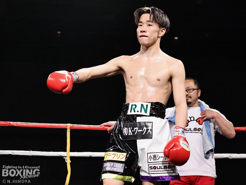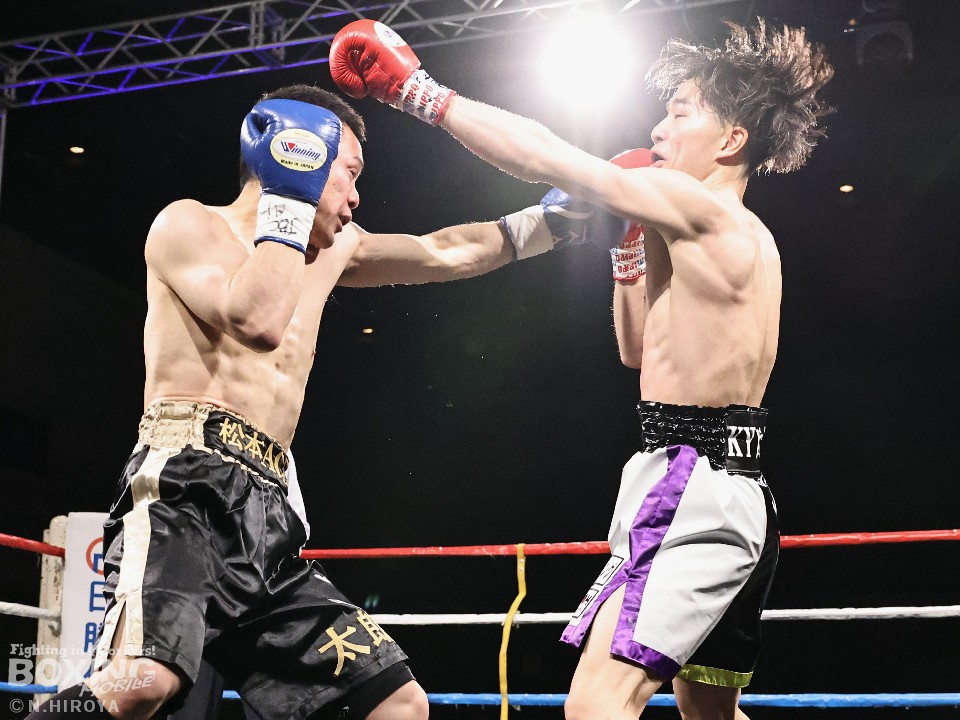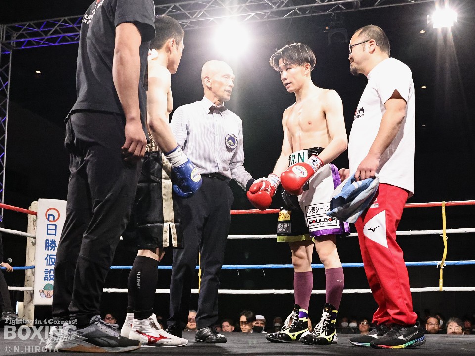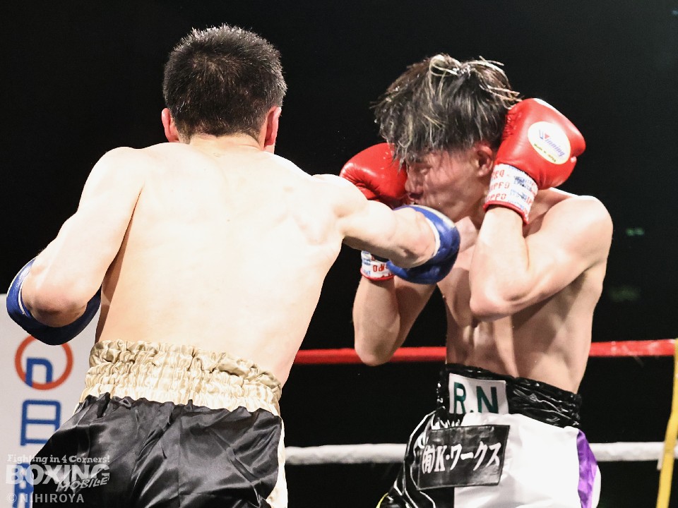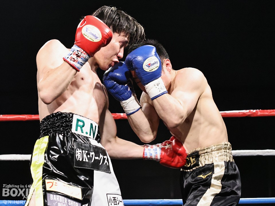 試合:中村がジャブから丁寧に組み立てて先制。なかなか懐に飛び込めない望月だが、ラウンド終盤に右フックから連打につなげた。2回、ジリジリと距離を詰める望月だが、中村は冷静に対応。3回、中村はワンツージャブで顔を弾くと距離をキープ。左ボディにつなげたい望月だが、あと一歩が踏み込めず。5回、しつこく前進しながらショートパンチで攻め立てる望月と足を使いながらジャブを軸にアウトボクシングを展開する中村の構図。6回、望月はプレスをかけてボディ攻撃から回転力を活かした連打で積極性をアピールした。中村が昨年11月の新人王西軍代表決定戦以来の再起戦を飾った。
