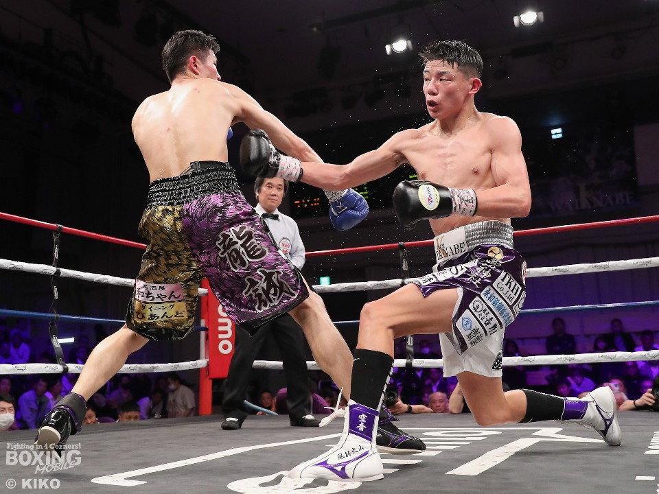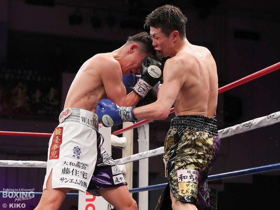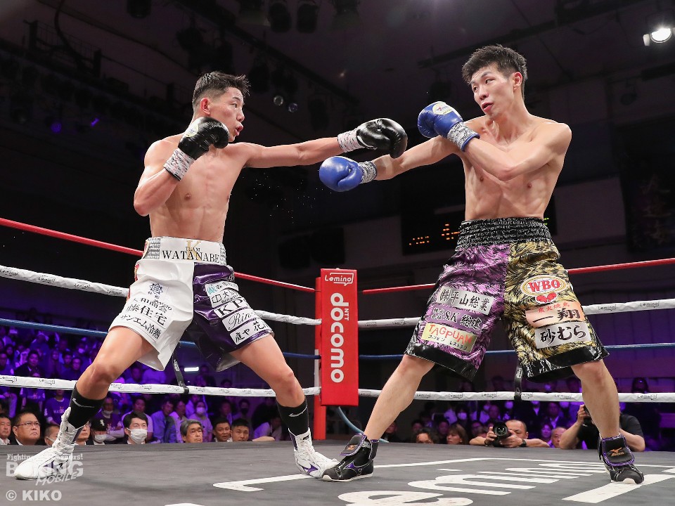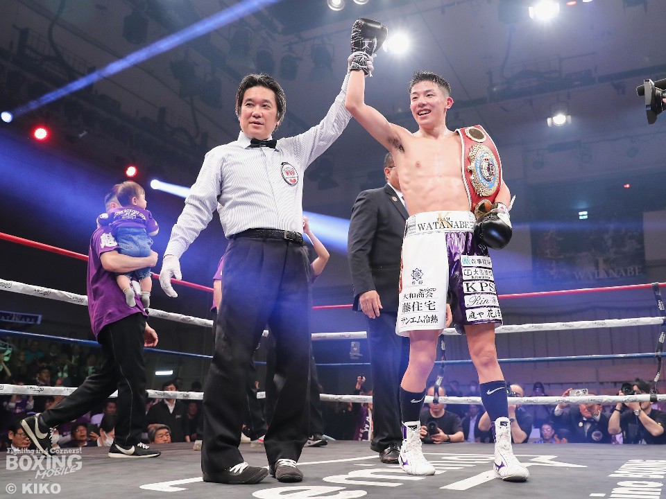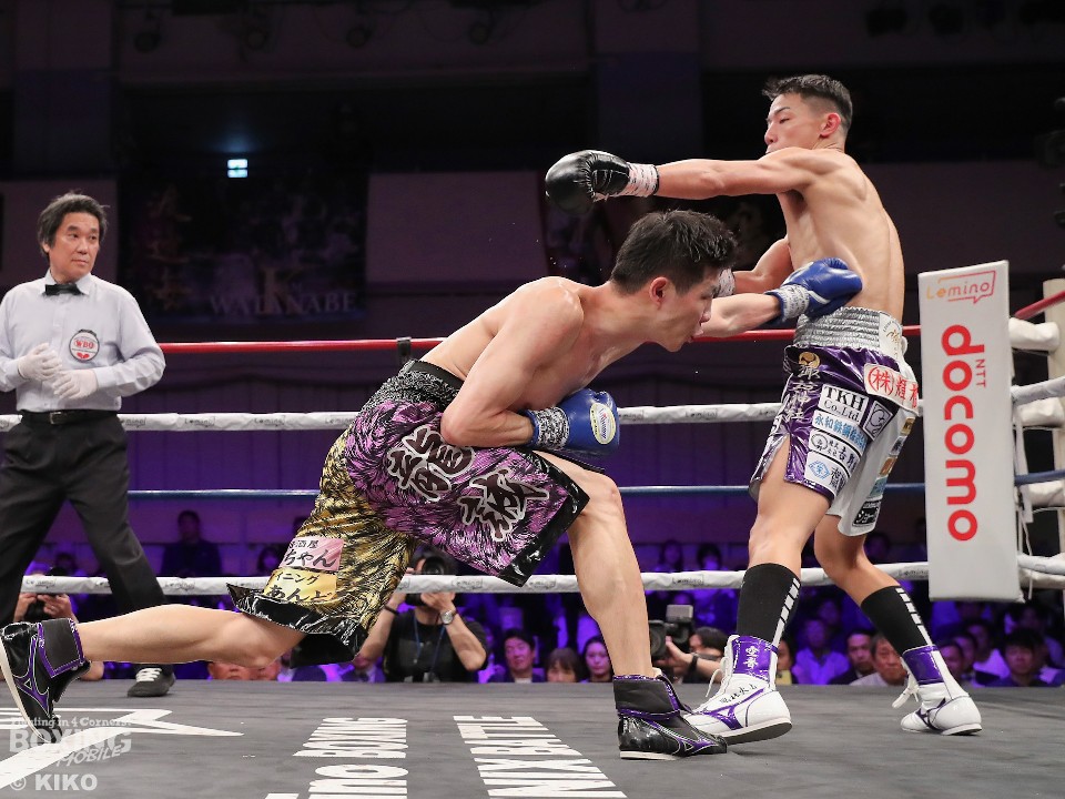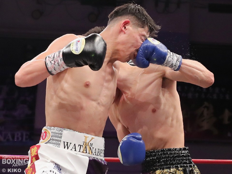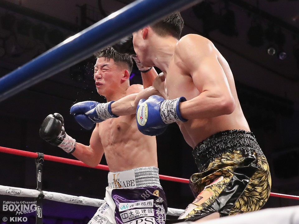 試合:WBOアジアパシフィック・スーパーフェザー級王座決定戦。前チャンピオンの渡邊とタイトル初挑戦の石井が対戦した。前の手でけん制し合う緊張感たっぷりの攻防。2回、渡邊がステップインから右ストレートでバランスを崩させるとパンチをまとめて攻勢。必死に返したサウスポー石井だが後手に回った。3回は再び、一瞬の隙を狙うスリリングな展開。お互いにパンチは空を切り、リング上でニヤリと笑った。4回、石井が右フックをねじ込むと渡邊もブン!と右フックで対抗。このラウンドは石井の左が光った。6回、カウンターを狙う中で決定打に恵まれず。フィナーレは7回に突然訪れた。ロープ際でパンチを交錯させる中、渡邊が返しの左フックをジャストミート!ぐにゃりと倒れた石井を見てレフェリーはカウント途中でストップした。渡邊がKO勝ちで王座奪還に成功した。