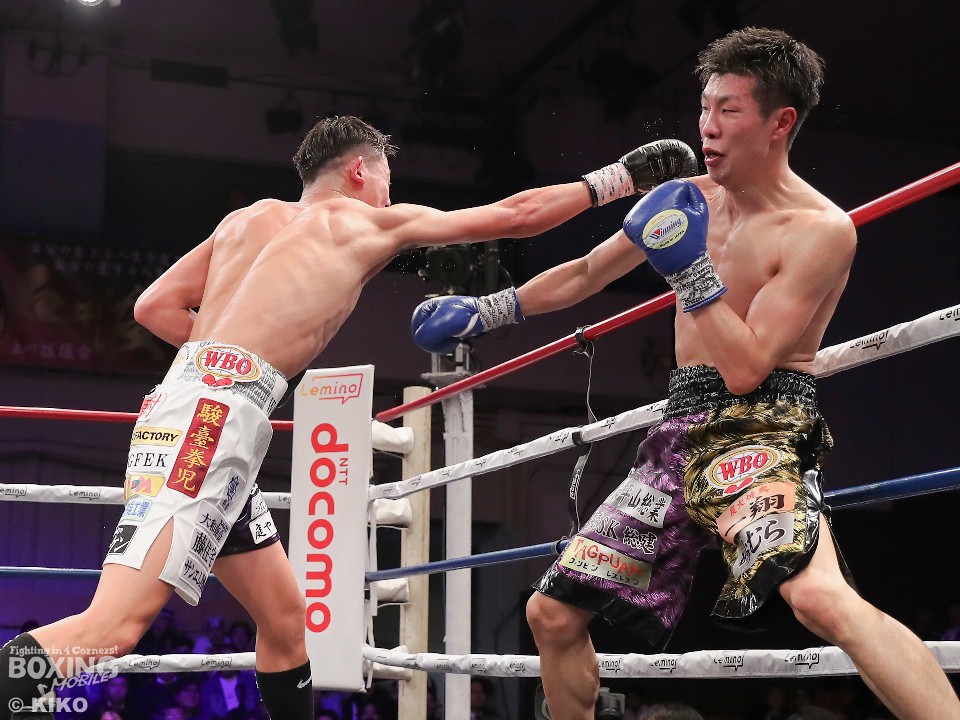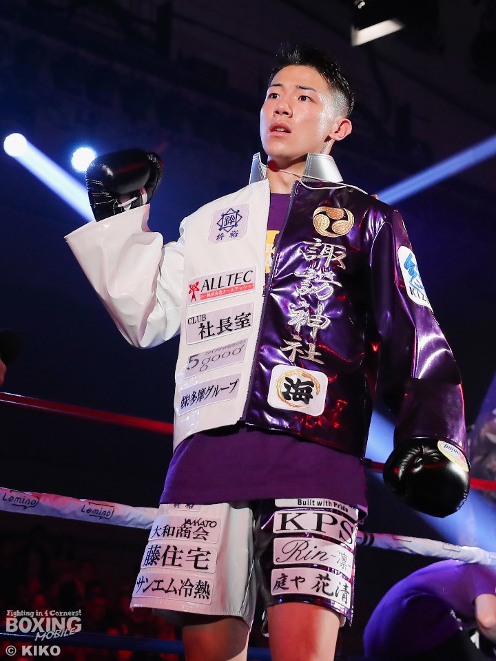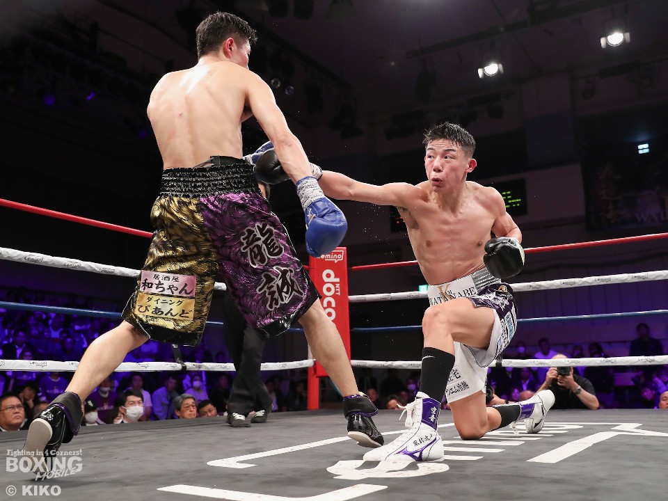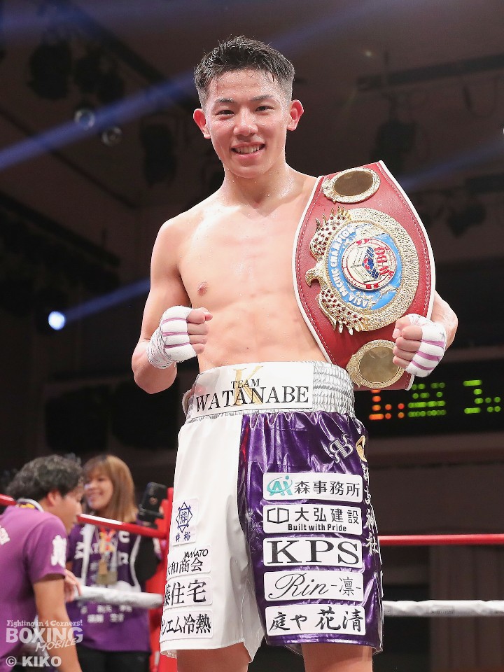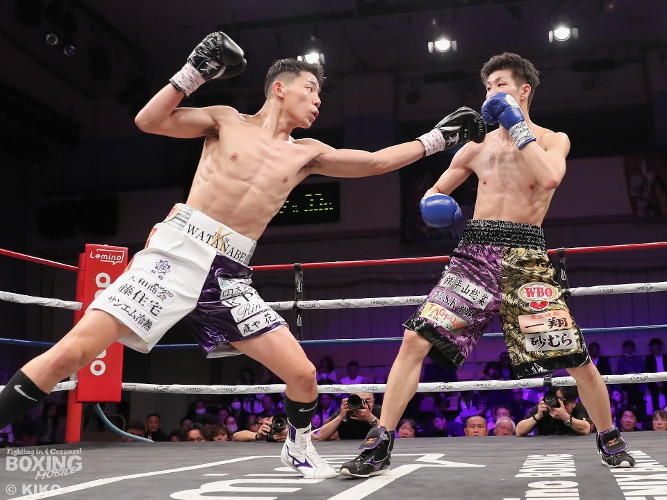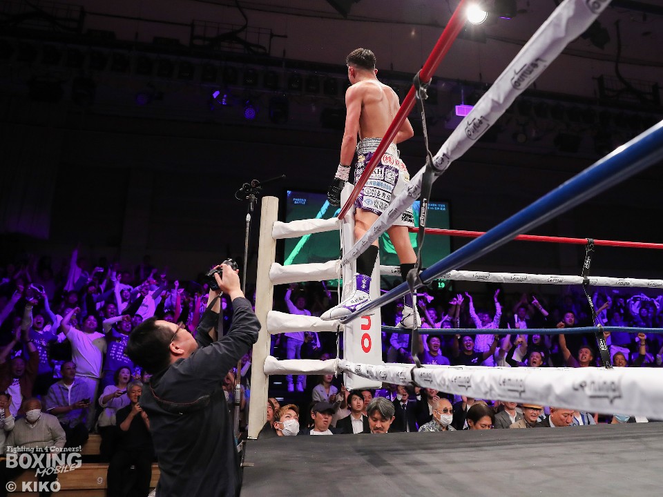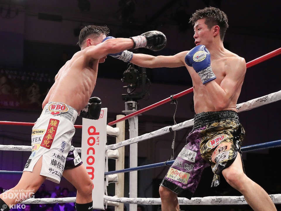 試合:WBOアジアパシフィック・スーパーフェザー級王座決定戦。前チャンピオンの渡邊とタイトル初挑戦の石井が対戦した。前の手でけん制し合う緊張感たっぷりの攻防。2回、渡邊がステップインから右ストレートでバランスを崩させるとパンチをまとめて攻勢。必死に返したサウスポー石井だが後手に回った。3回は再び、一瞬の隙を狙うスリリングな展開。お互いにパンチは空を切り、リング上でニヤリと笑った。4回、石井が右フックをねじ込むと渡邊もブン!と右フックで対抗。このラウンドは石井の左が光った。6回、カウンターを狙う中で決定打に恵まれず。フィナーレは7回に突然訪れた。ロープ際でパンチを交錯させる中、渡邊が返しの左フックをジャストミート!ぐにゃりと倒れた石井を見てレフェリーはカウント途中でストップした。渡邊がKO勝ちで王座奪還に成功した。