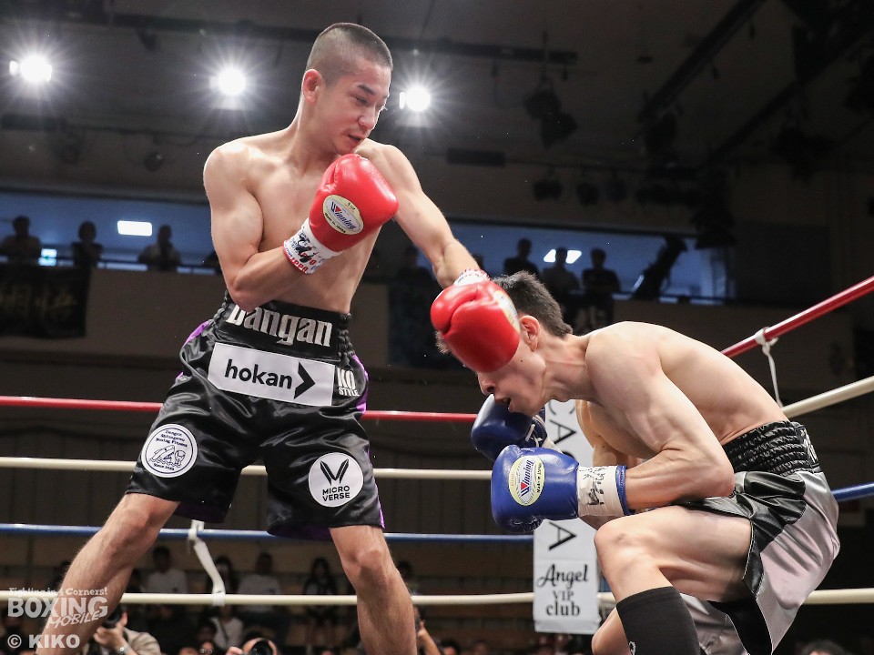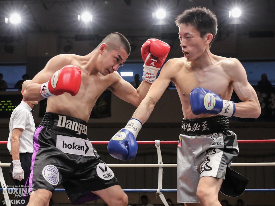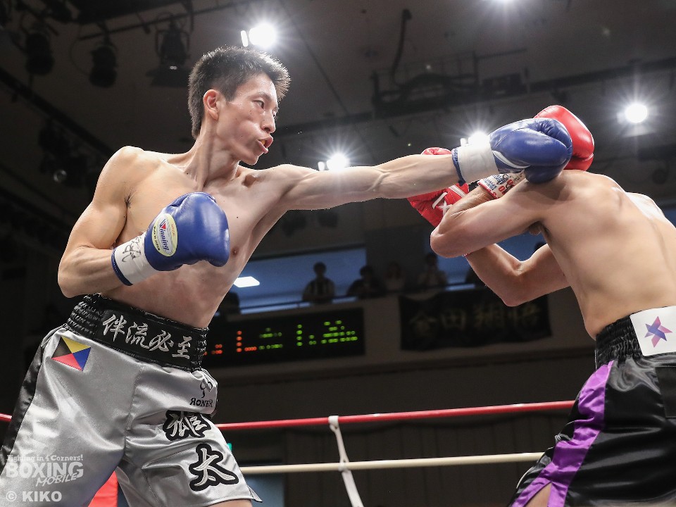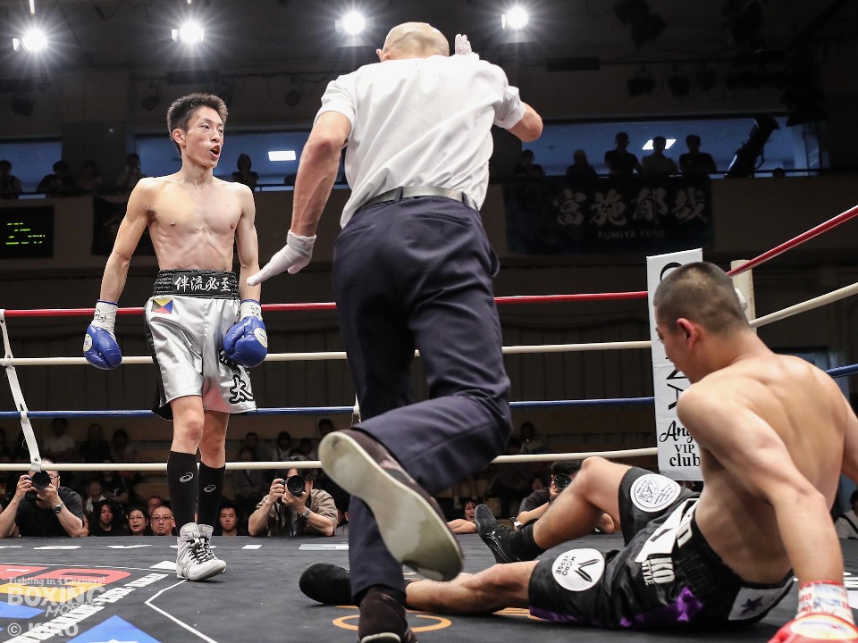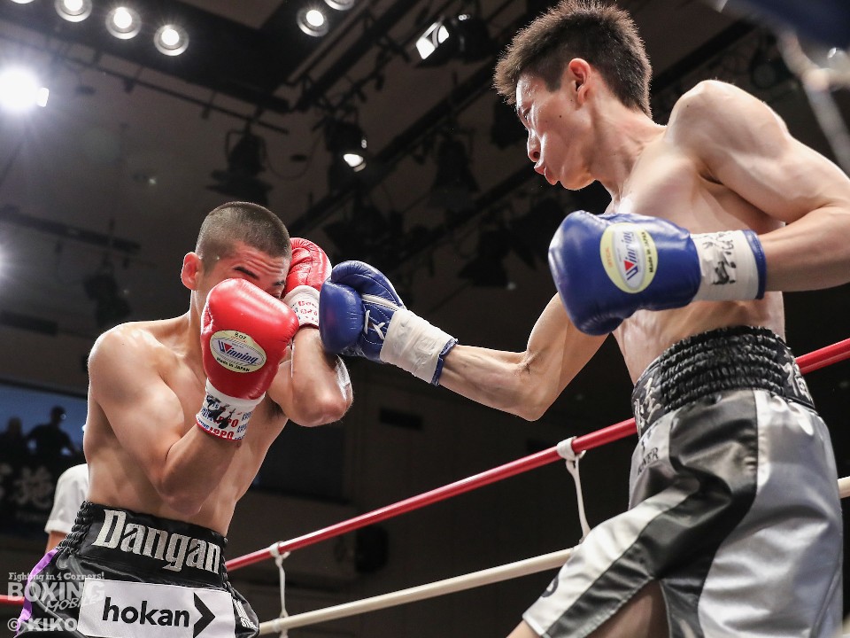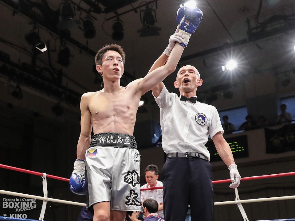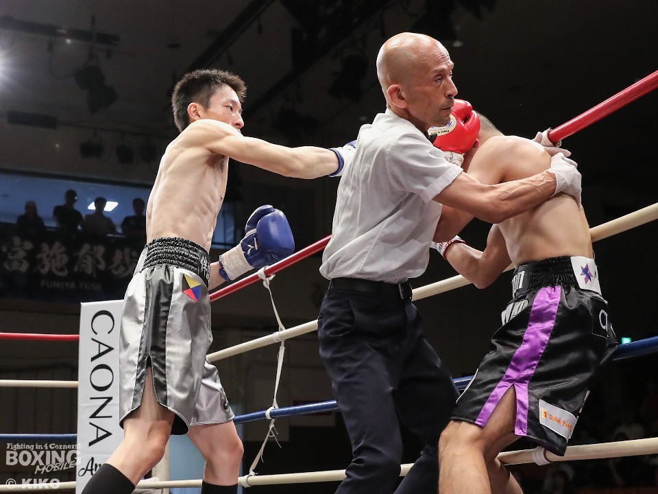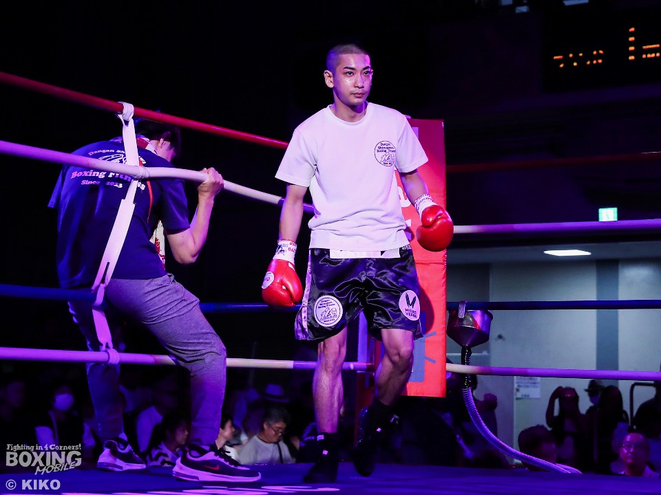 試合:木下が丁寧にジャブを突きながらワンツー、右アッパーをヒット。前に出てくる横浜を左で突き放すと右アッパーでグラつかせて攻勢。チャンスとみるや連打から左フックでダウンを演出。ダメージが残る相手に迫るとワンツーを叩き込んだところでレフェリーが割って入った。木下が4戦目でうれしい初勝利を挙げた。