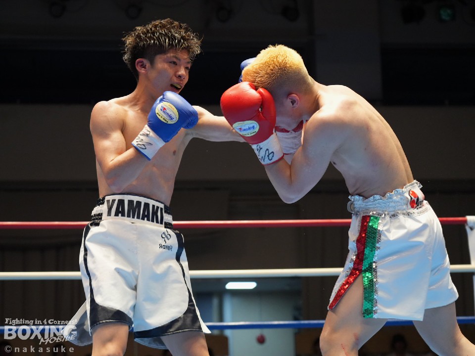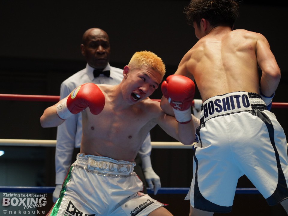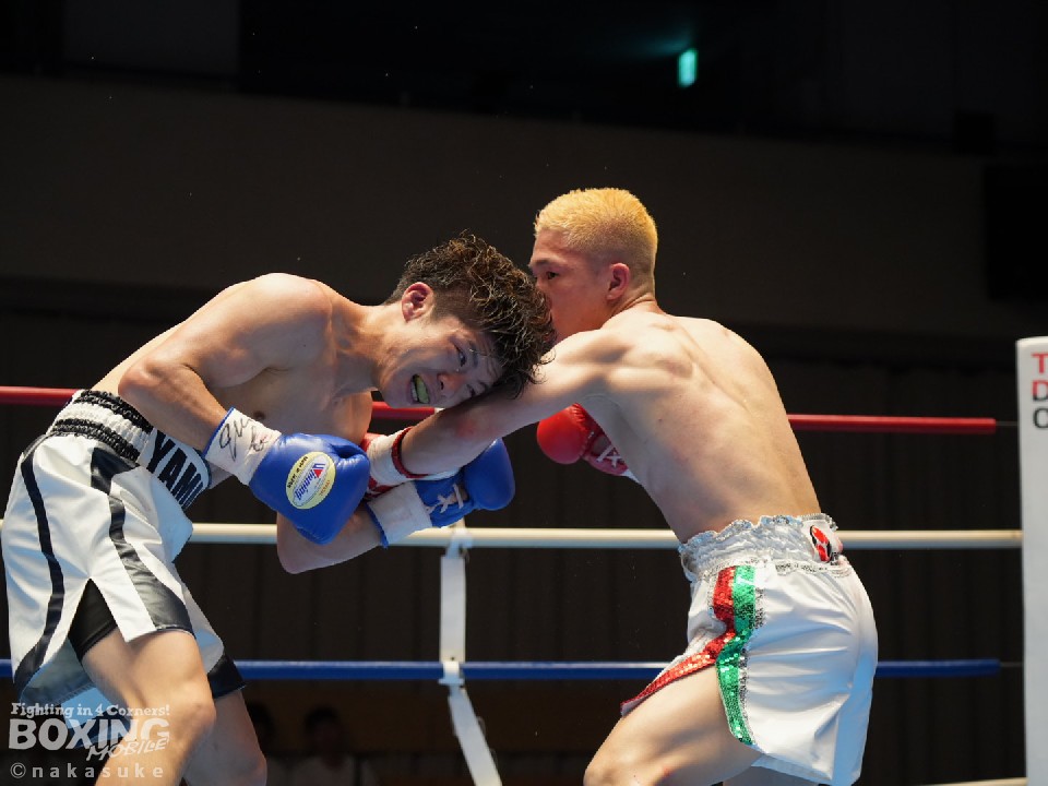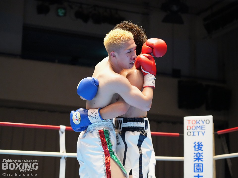 試合:布袋がプレスをかけながら右ボディアッパー、右フックで積極的な攻撃を展開。2回、内野は距離を意識しながらコンパクトな右フックで見栄えの良さをアピール。3回、布袋は右ショートでガクッと腰を沈めさせるとボディにパンチを集めて攻勢。しかし、ここを耐えた内野は右オーバーハンドを叩きつけて意地を見せた。明確なポイントが欲しい内野は右フックを強振。布袋も負けじと左右フックを繰り出しペースを渡さなかった。布袋が昨年9月以来の再起戦を飾った。